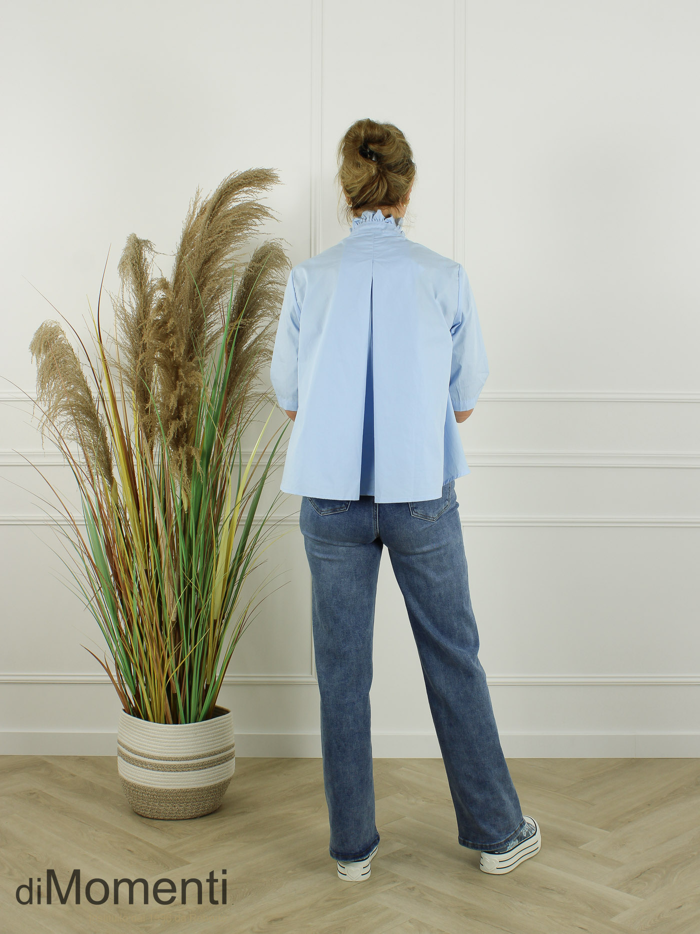 Parijse chic ten top: deze katoenen A-lijn blouse van Millennium Paris valt speels door de extra rugplooi. De hooggesloten hals met ruches en vier verfijnde knoopjes straalt pure klasse uit. Met haar driekwart mouw is dit hét pronkstuk in klassiek wit of lichtblauw voor een tijdloze, vrouwelijke look.