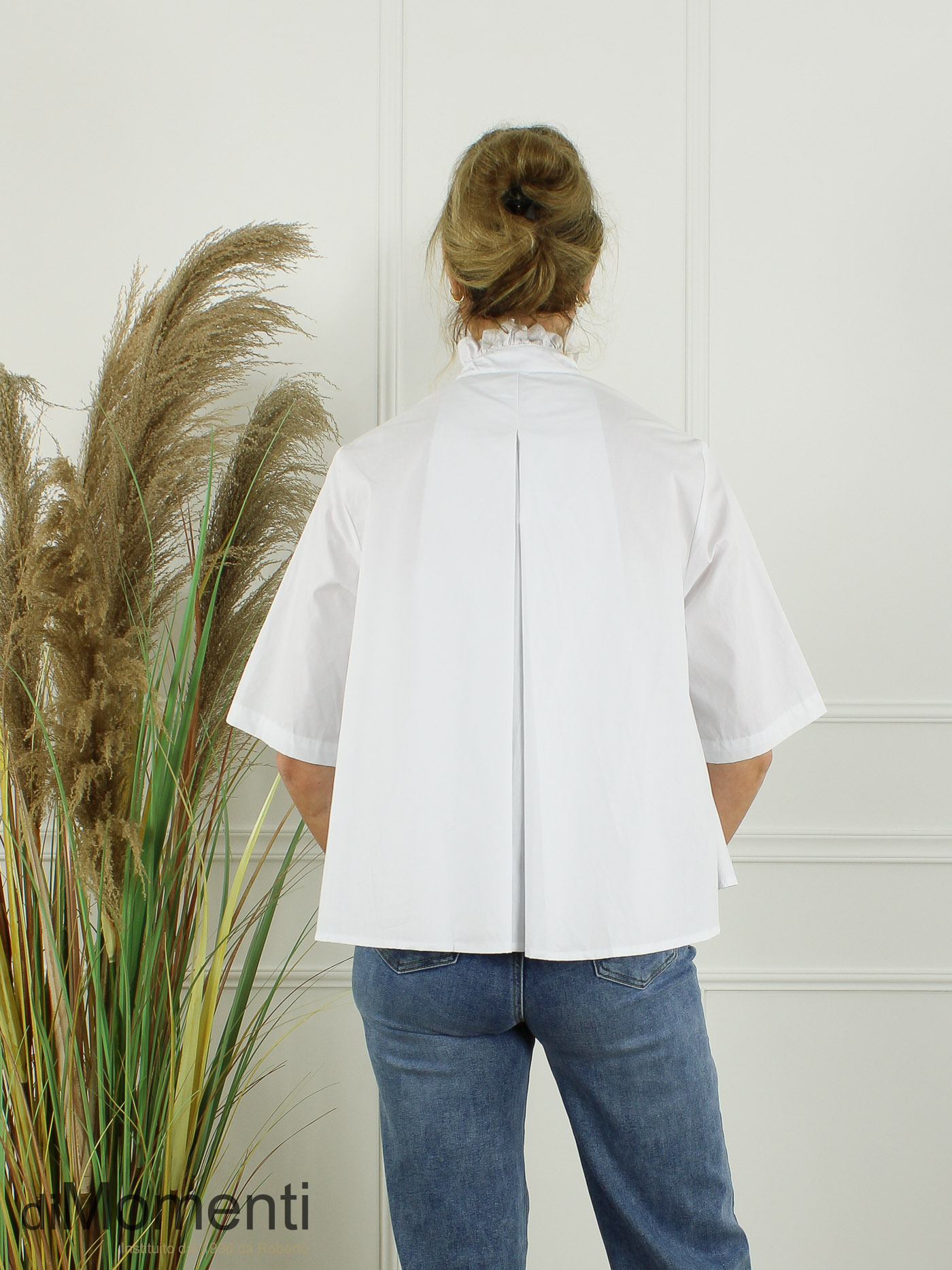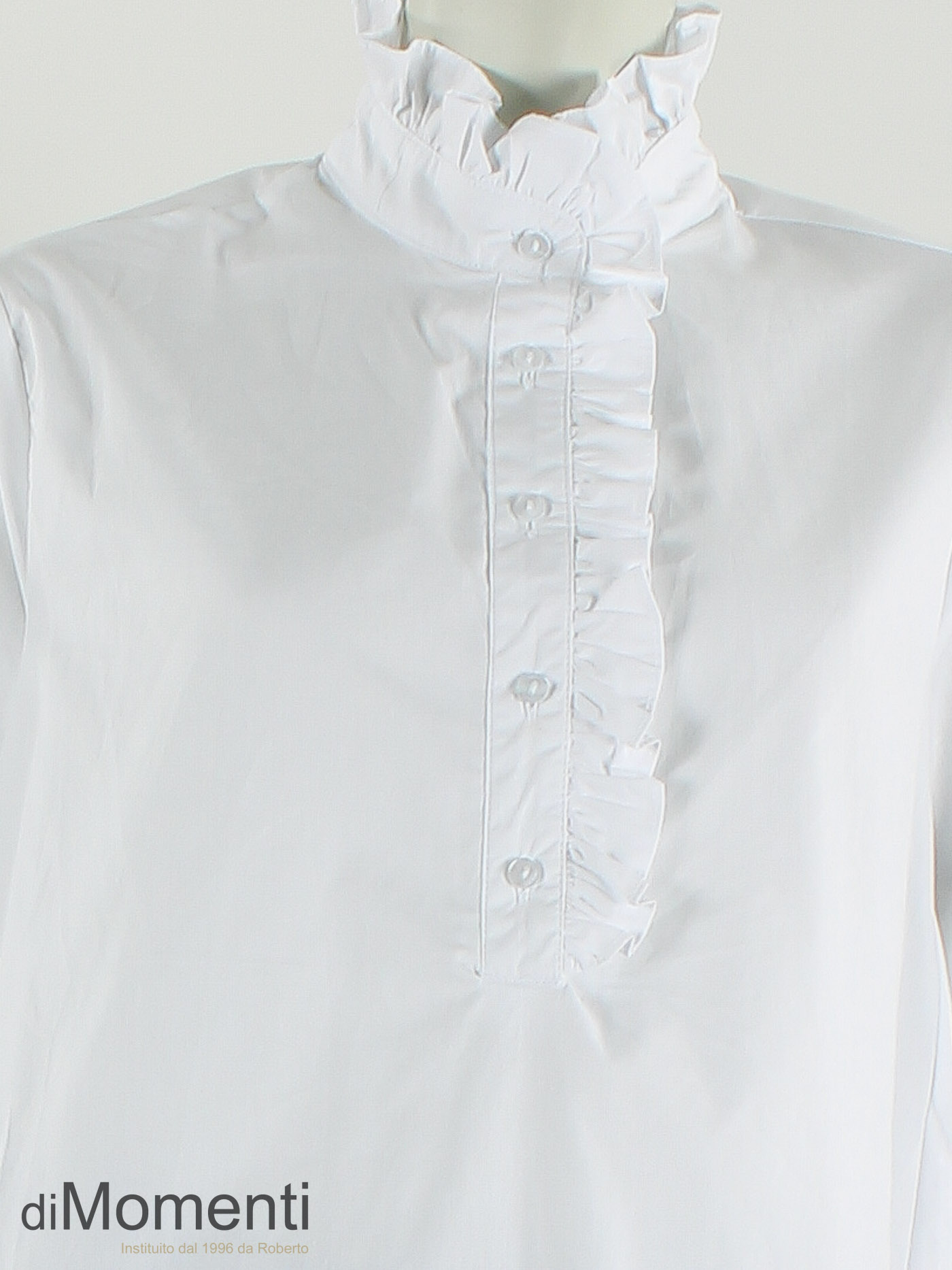 Parijse chic ten top: deze katoenen A-lijn blouse van Millennium Paris valt speels door de extra rugplooi. De hooggesloten hals met ruches en vier verfijnde knoopjes straalt pure klasse uit. Met haar driekwart mouw is dit hét pronkstuk in klassiek wit of lichtblauw voor een tijdloze, vrouwelijke look.