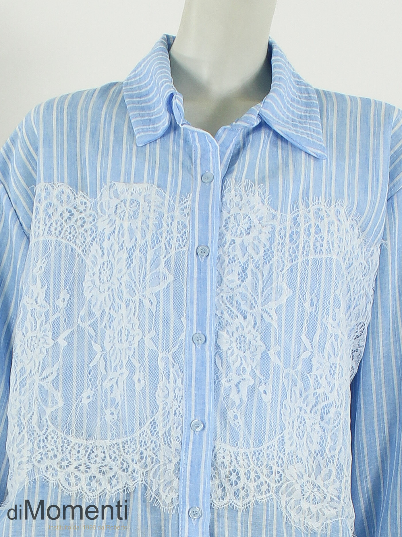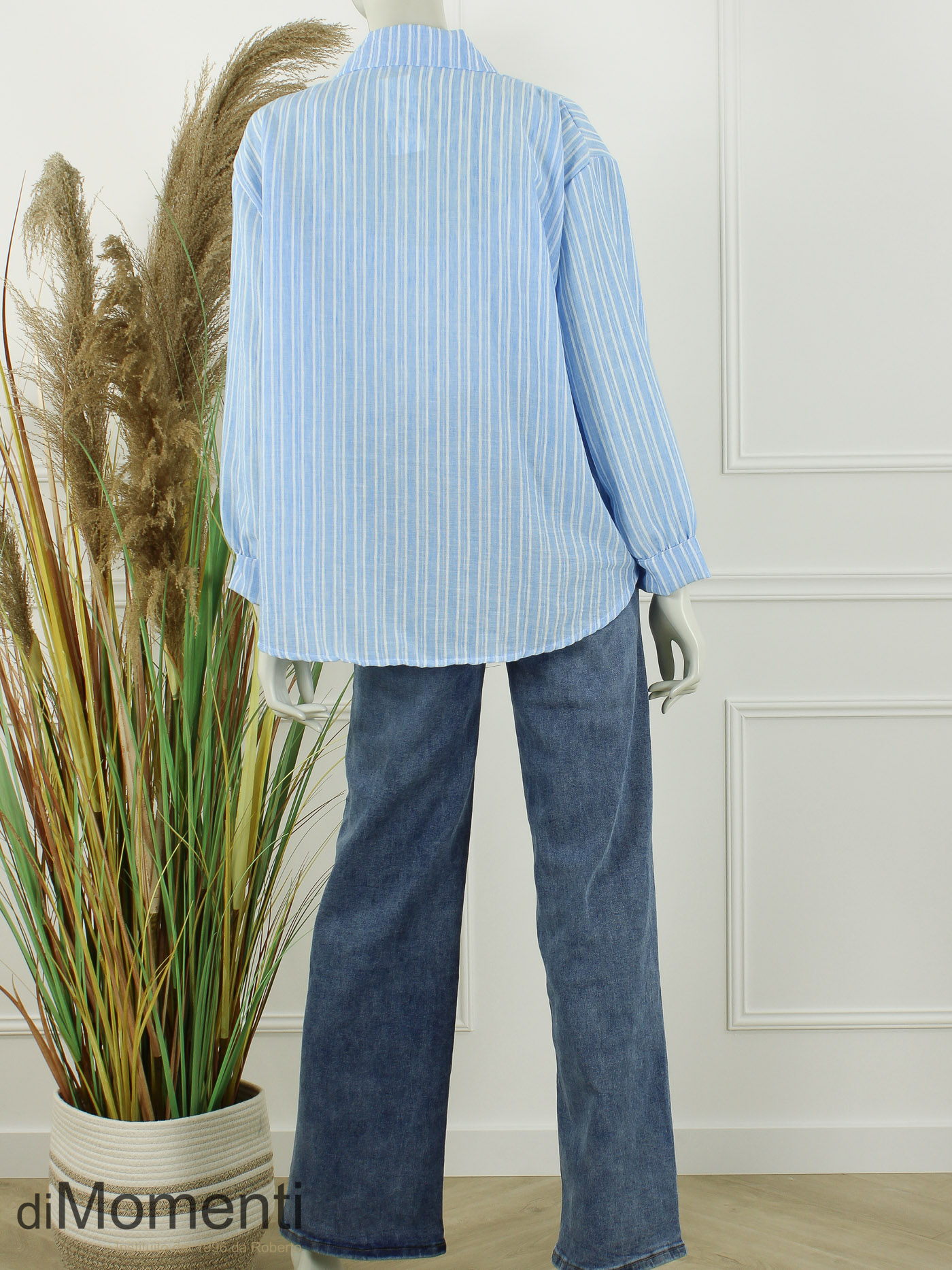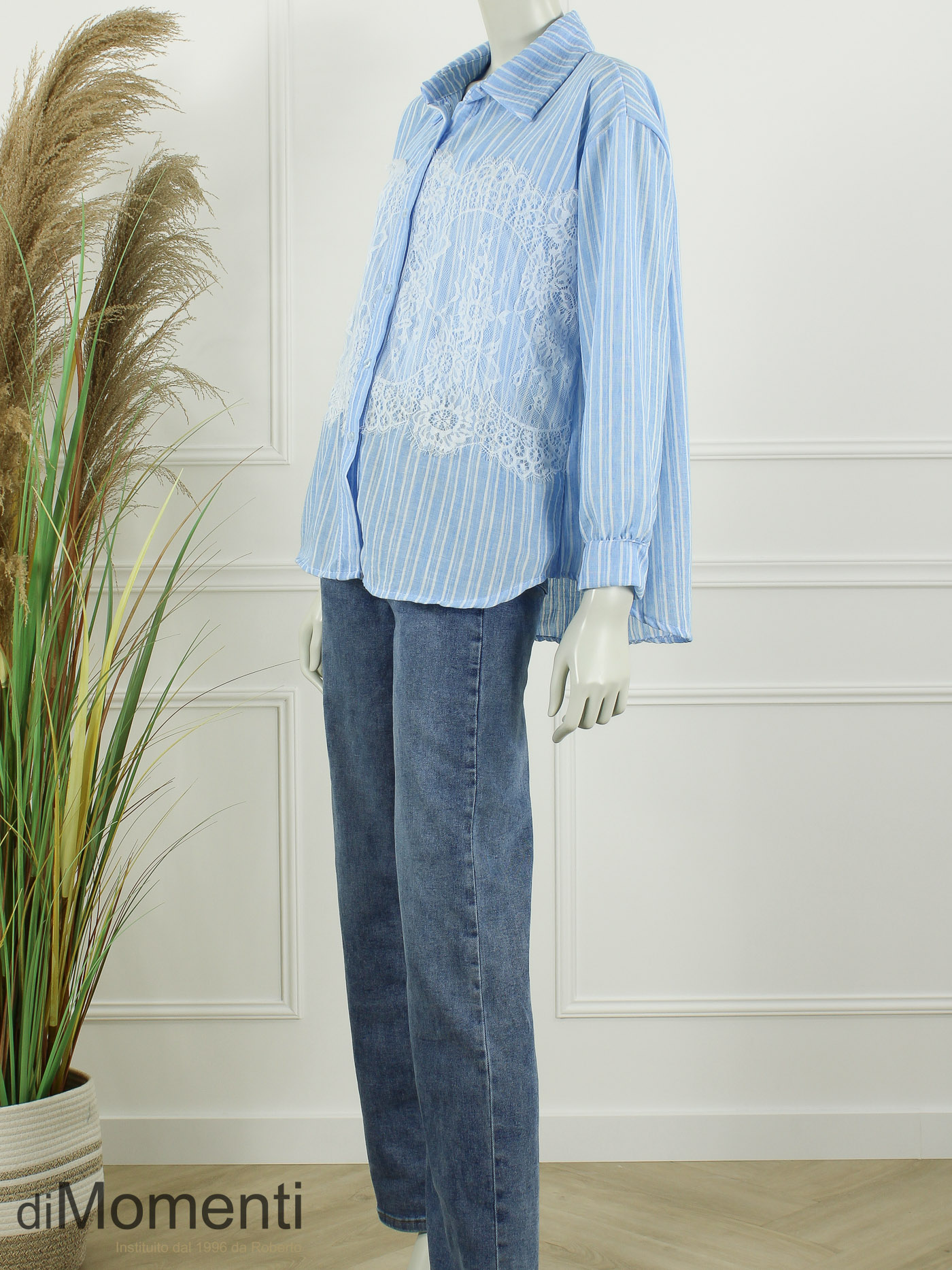 Dé trend van dit voorjaar! Deze gestreepte blouse in wit met pasteltinten combineert een stoere linnenlook met een vrouwelijke kant-applicatie op de voorzijde. Een stijlvolle mix van casual en chic, perfect passend tot maat 42.