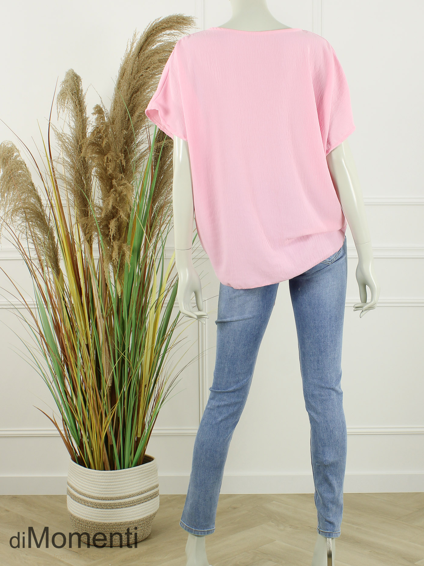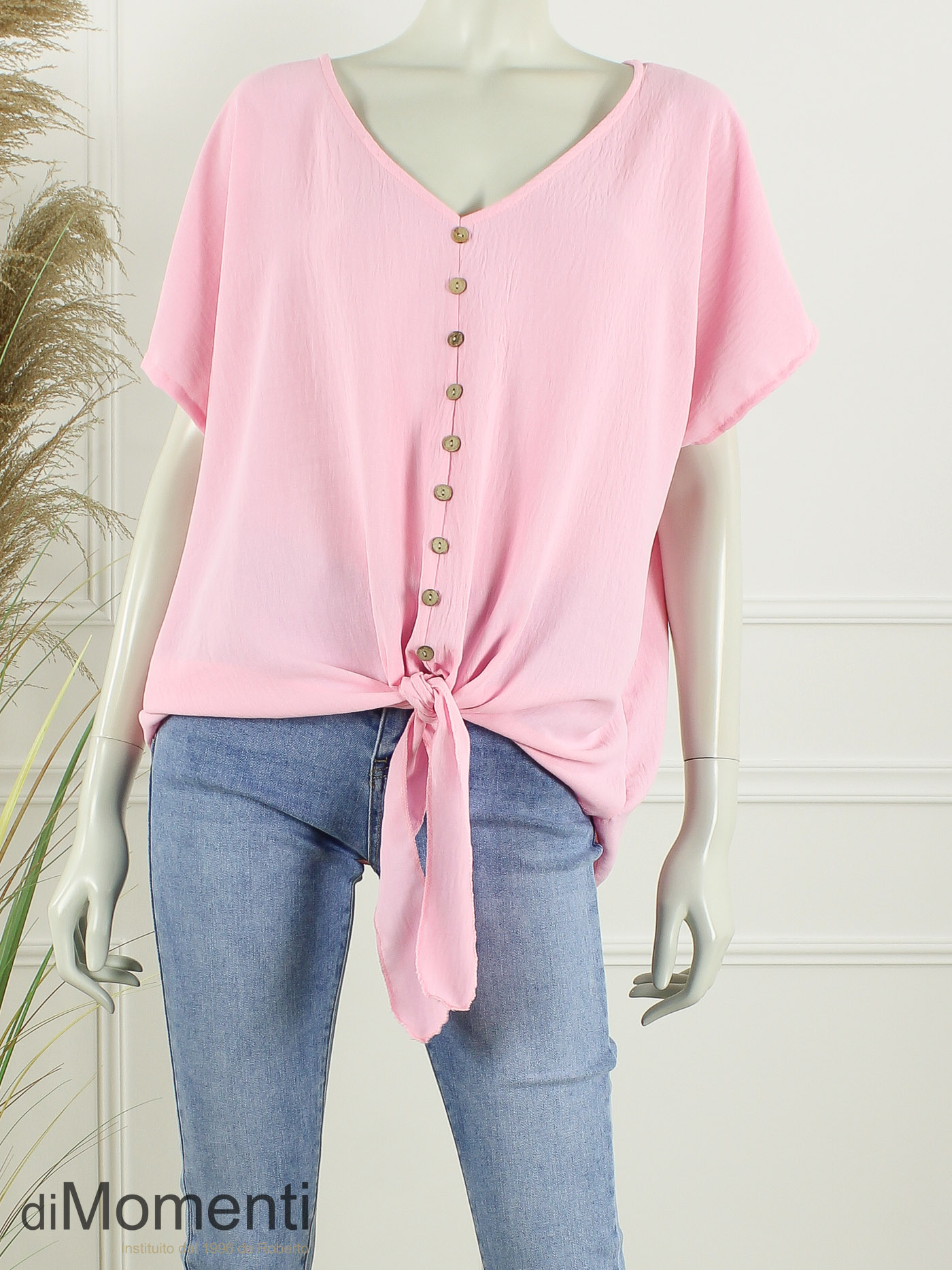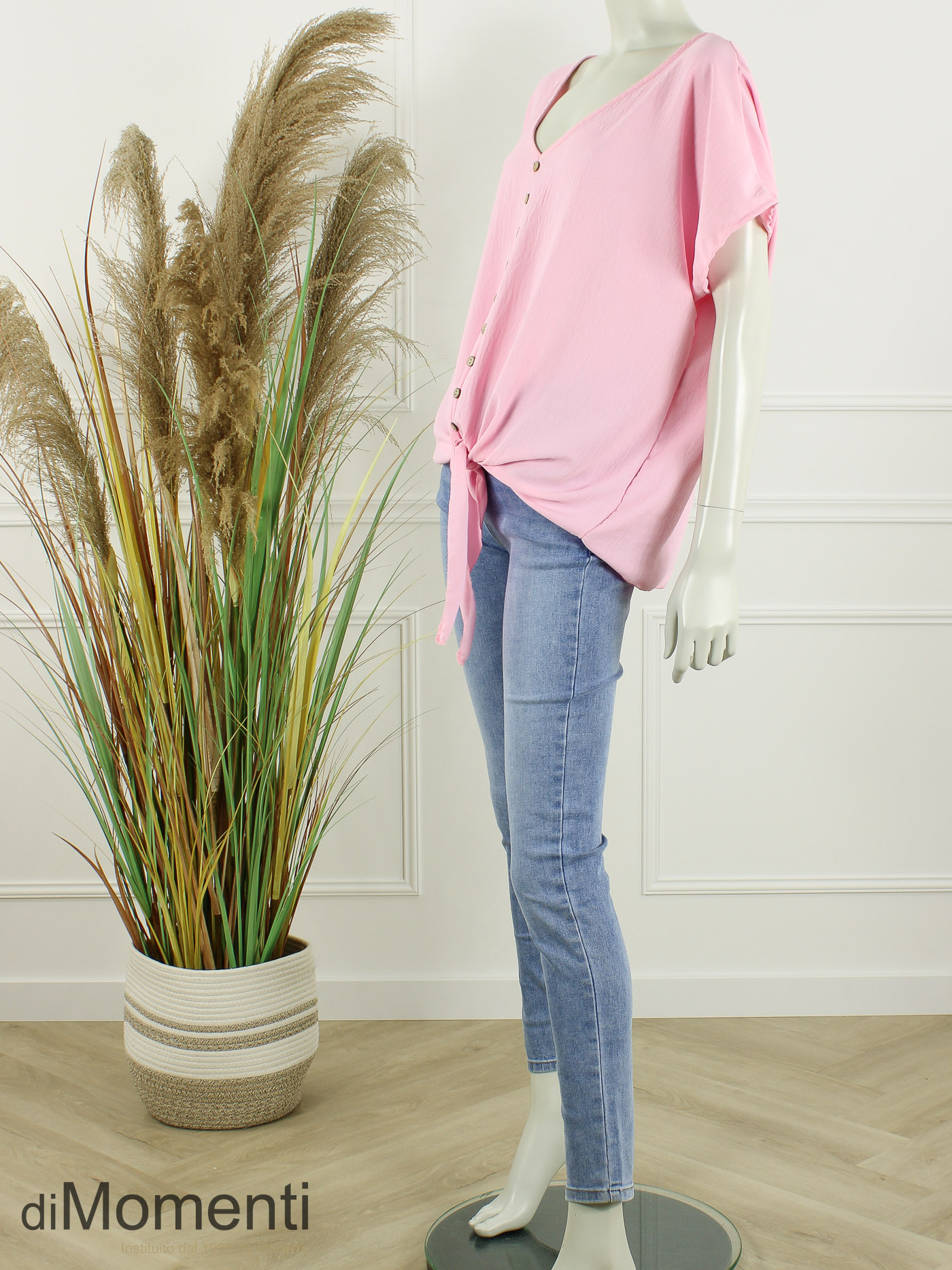 Ontdek deze luchtige, ruimvallende zomerblouse! Dit over-het-hoofd model combineert het gemak van een top met de look van een blouse dankzij de sierlijke knoopjes. Met de strikdetails aan de voorzijde en aangeknipte korte mouwen creëer je een speelse silhouet. Dit model is gemaakt in een mix van materialen waaronder fijne viscose. Verkrijgbaar in talloze zomerse kleuren—dé must-have voor dit seizoen!