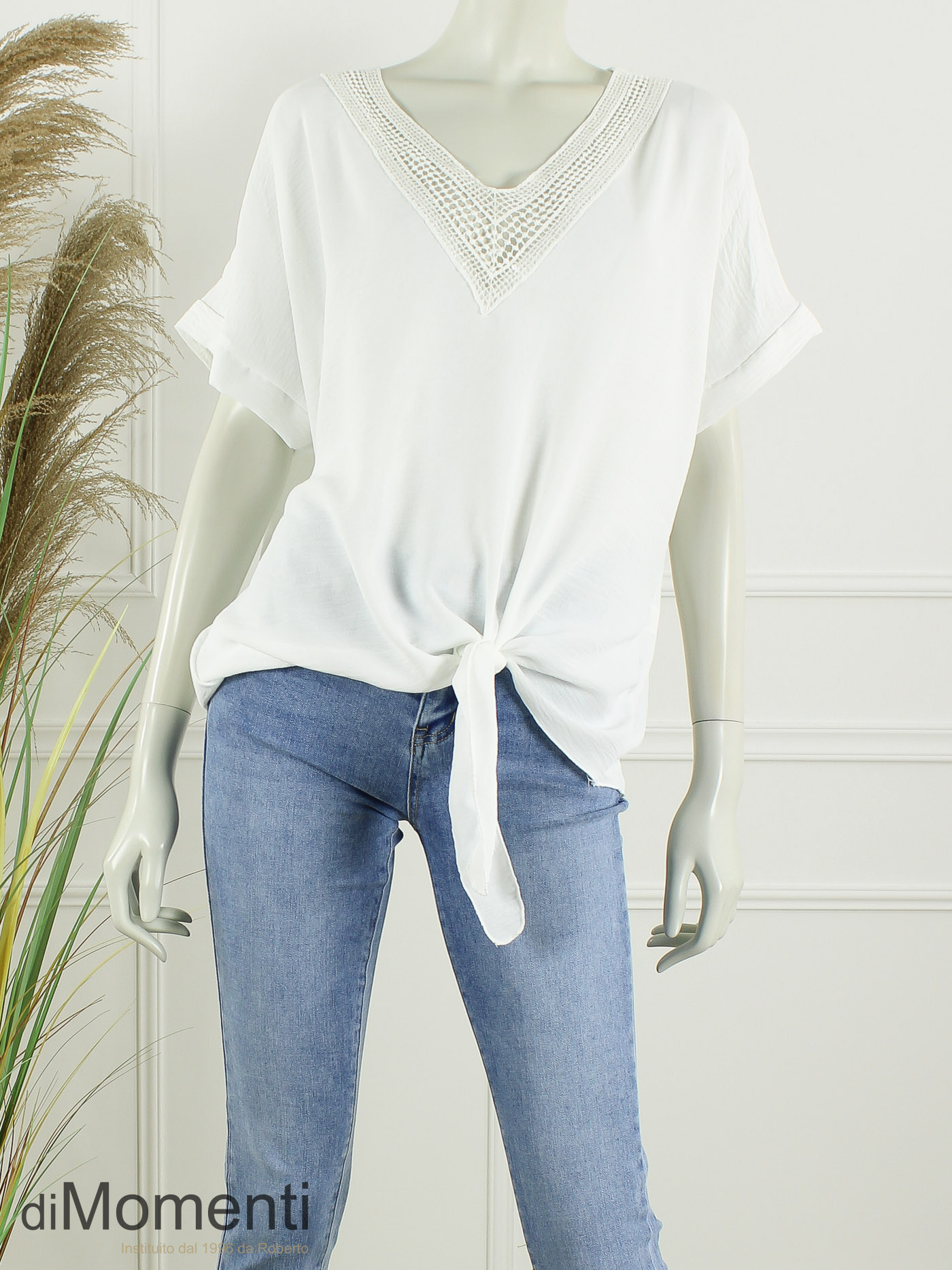 Ontdek deze luchtige, ruimvallende zomerblouse! Dit over-het-hoofd model combineert het gemak van een top met de look van een blouse met langs de hals een rand van kant met pailletjes. Met de strikdetails aan de voorzijde en aangeknipte korte mouwen creëer je een speelse silhouet.