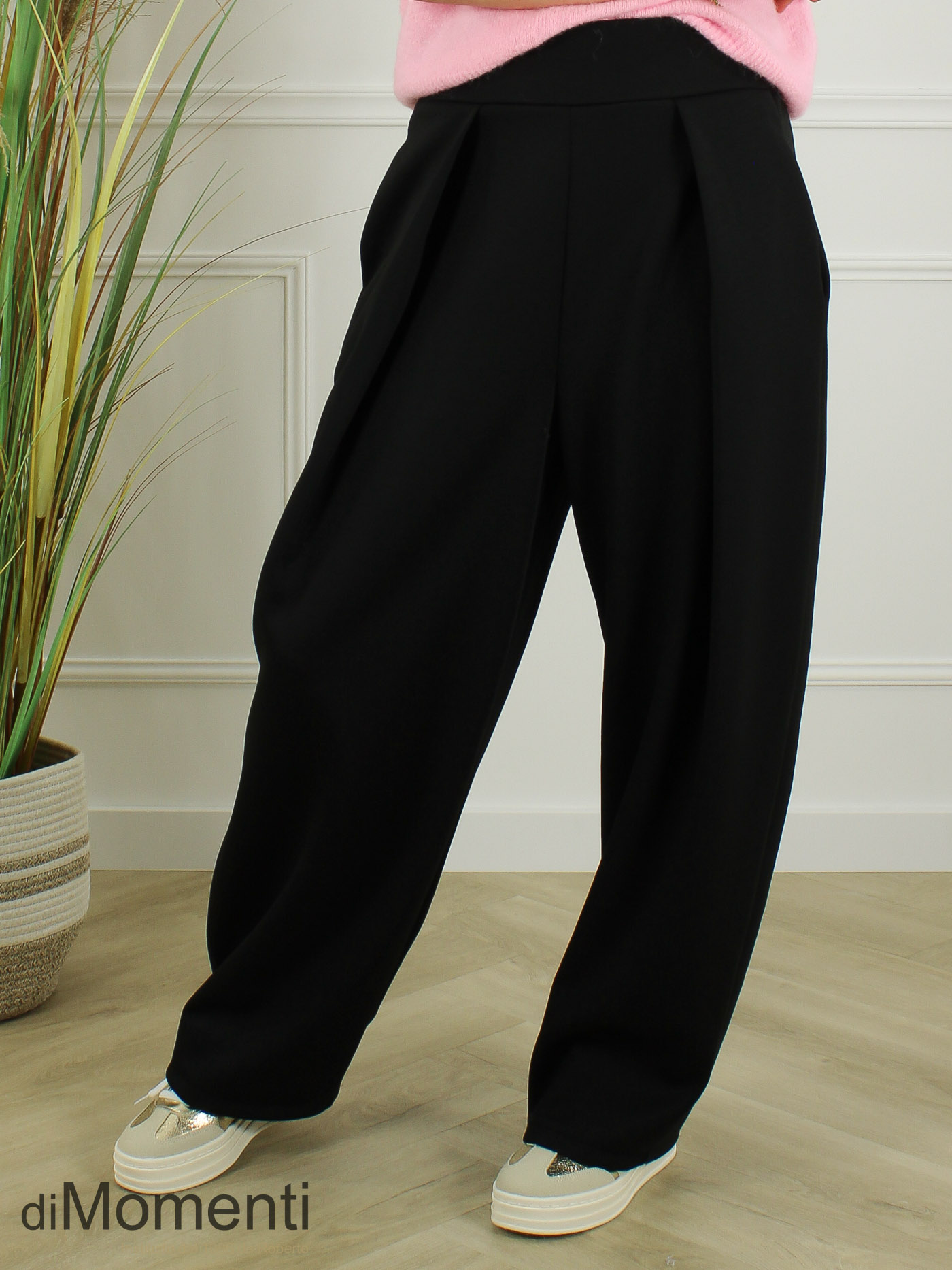 Deze moderne ballonbroek van soepel jog-materiaal is dé trend van nu! De voorzijde heeft stijlvolle plooien en een gladde tailleband, terwijl het elastiek aan de achterzijde zorgt voor een perfecte pasvorm tot maat 42. De toelopende pijpen en zijzakken maken dit model helemaal af.