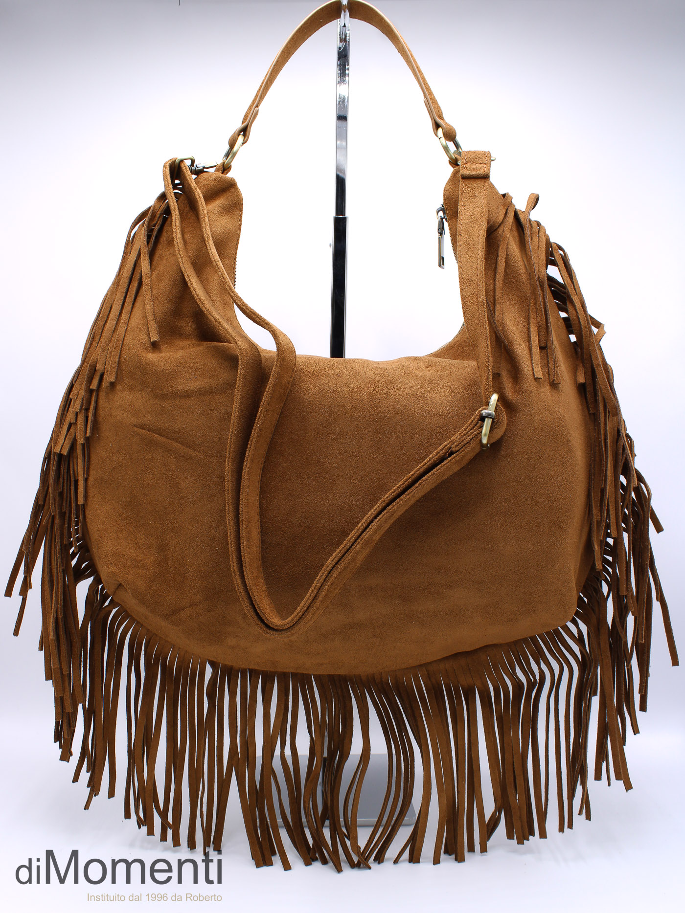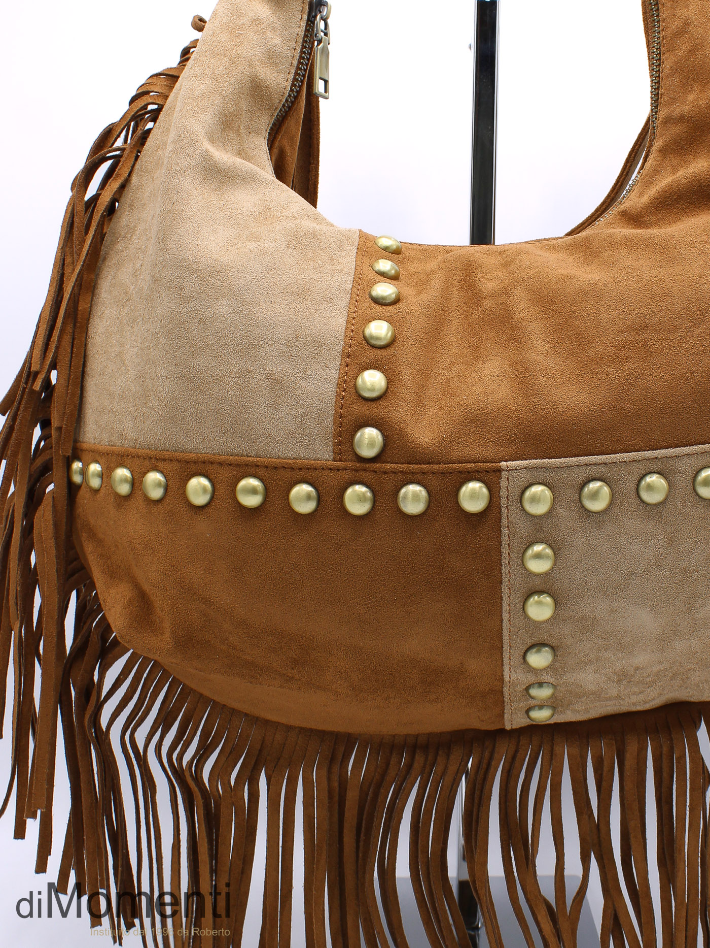 Deze ruime suèdine schoudertas is super trendy! Met een opvallende franjerand en stoere studs. De tas is gevoerd, heeft een binnenvak en sluit met een rits. Inclusief losse, verstelbare riem. De mooie kleurvlakverdeling in najaarstinten maakt dit een absolute eyecatcher!