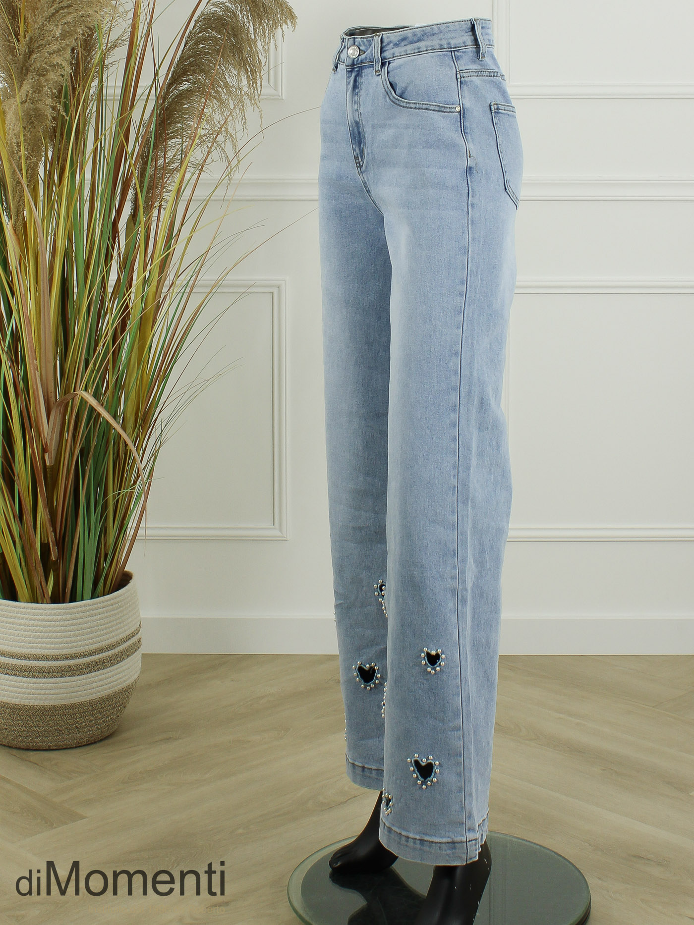 Nieuwe trendy denim in een frisse blauwe wassing heeft unieke opengewerkte hartjes met een luxe parelrand. Dankzij de fijne stretch in de stof én de tailleband geniet je van ongekend comfort. De perfecte mix van romantiek, stijl en de ideale pasvorm!