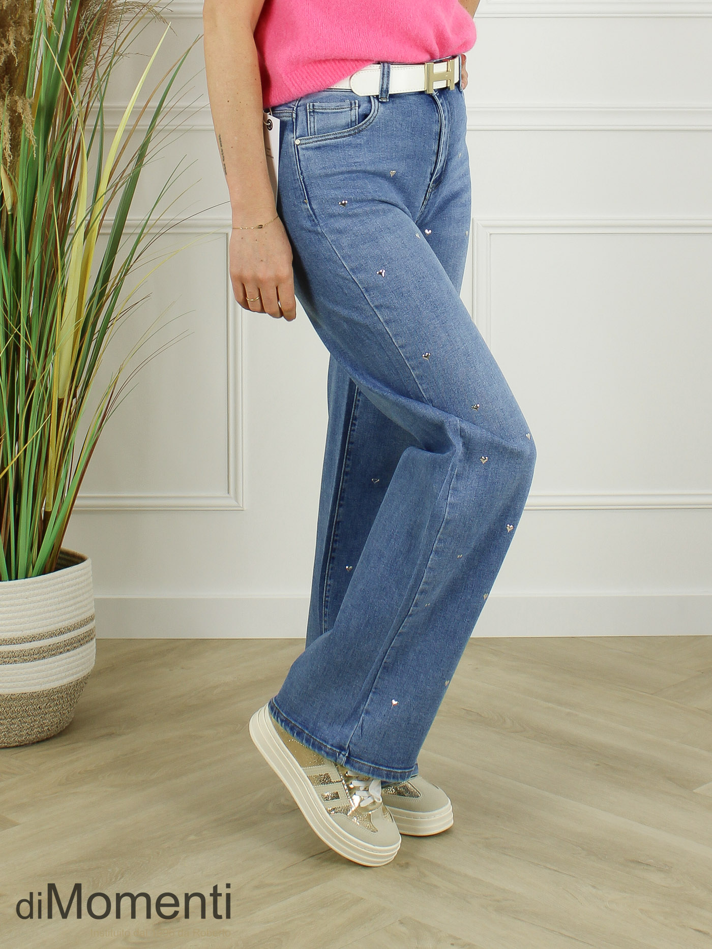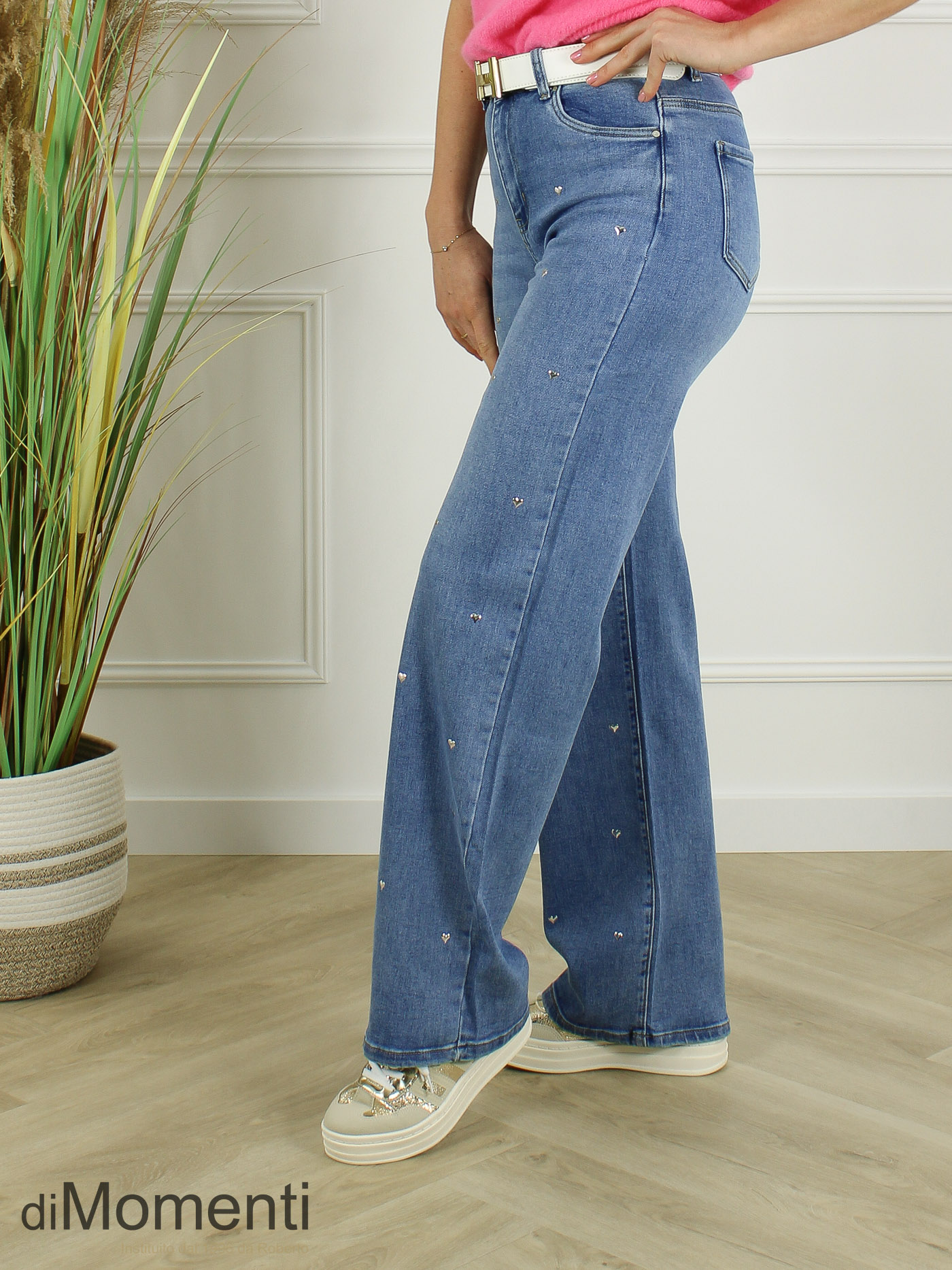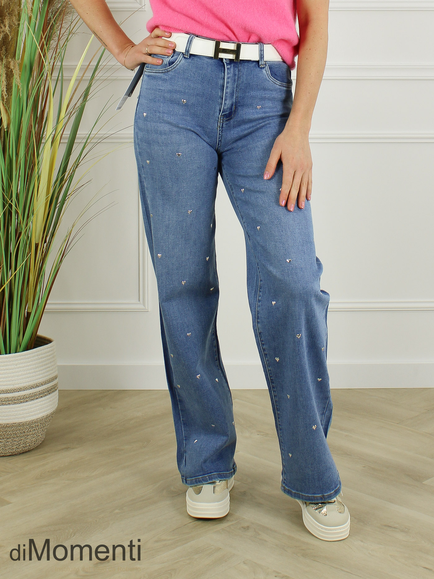 Verliefd op deze nieuwe Goodies wide leg! Deze trendy jeans met hartjes aan de voorzijde van de jeans is dé eyecatcher voor dit voorjaar. Dankzij de fijne stretch, ook in de tailleband en soepele kwaliteit stof draagt hij heerlijk comfortabel. Deze jeans valt goed op maat en is verschillende maatseries te bestellen.