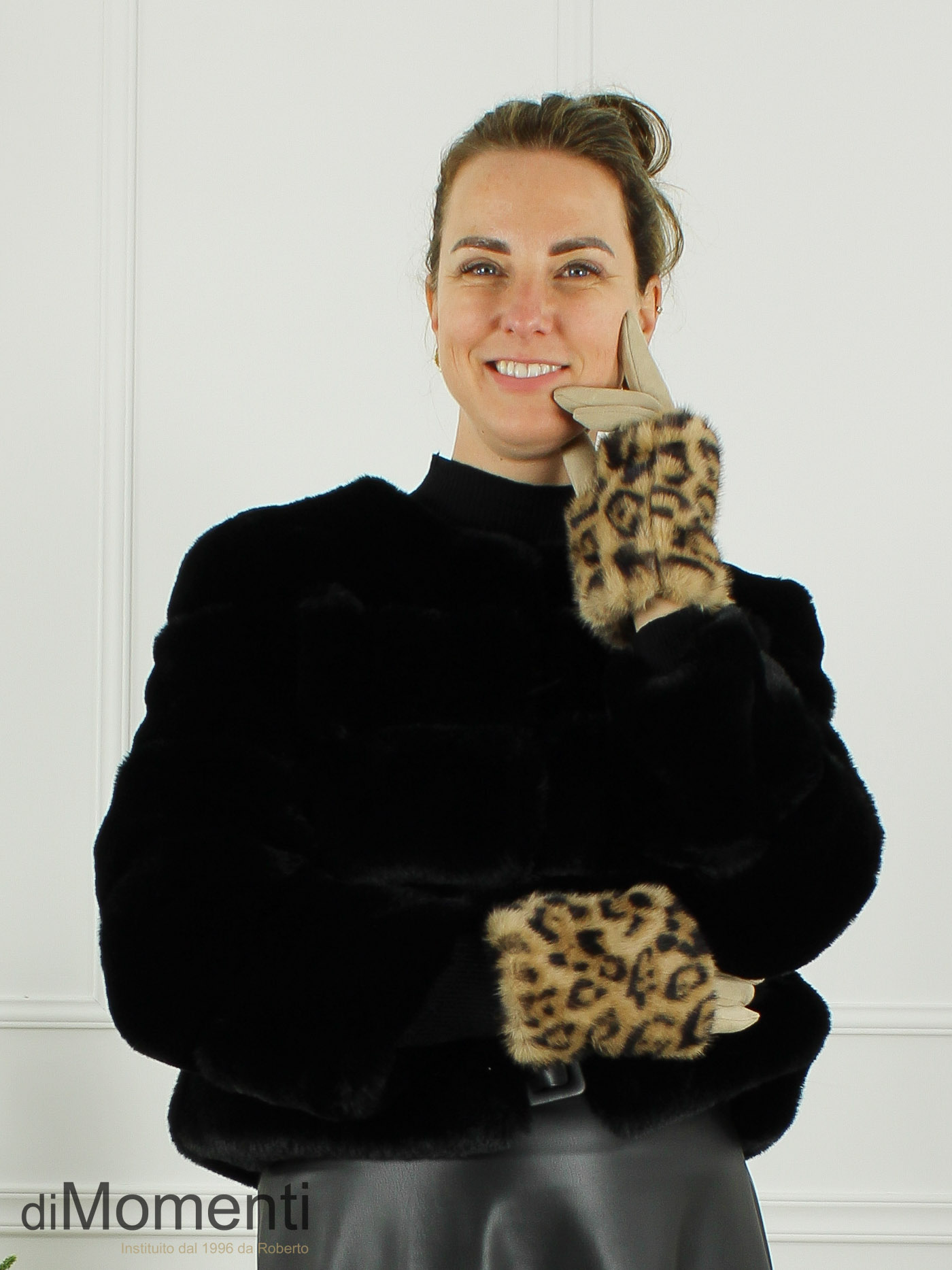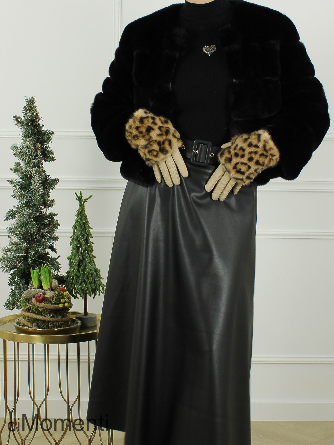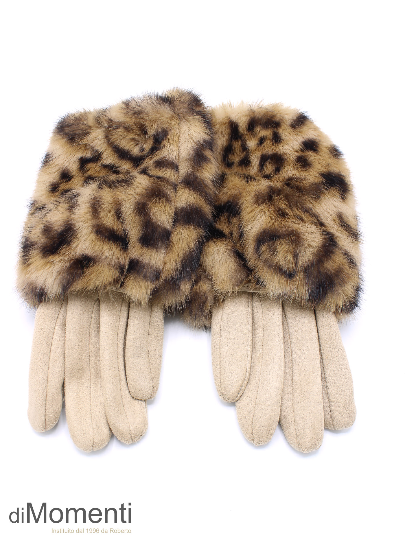 Deze look-a-like suèdine handschoen combineert warmte en stijl! De handschoen heeft een royale rand van zachte fake fur met trendy animal print. De telefoontip op de wijsvinger maakt bediening eenvoudig.Gemaakt van een mooie, rekbare kwaliteit met stretch voor optimaal comfort. Verkrijgbaar in de nieuwste trendy kleuren. Een luxe accessoire!