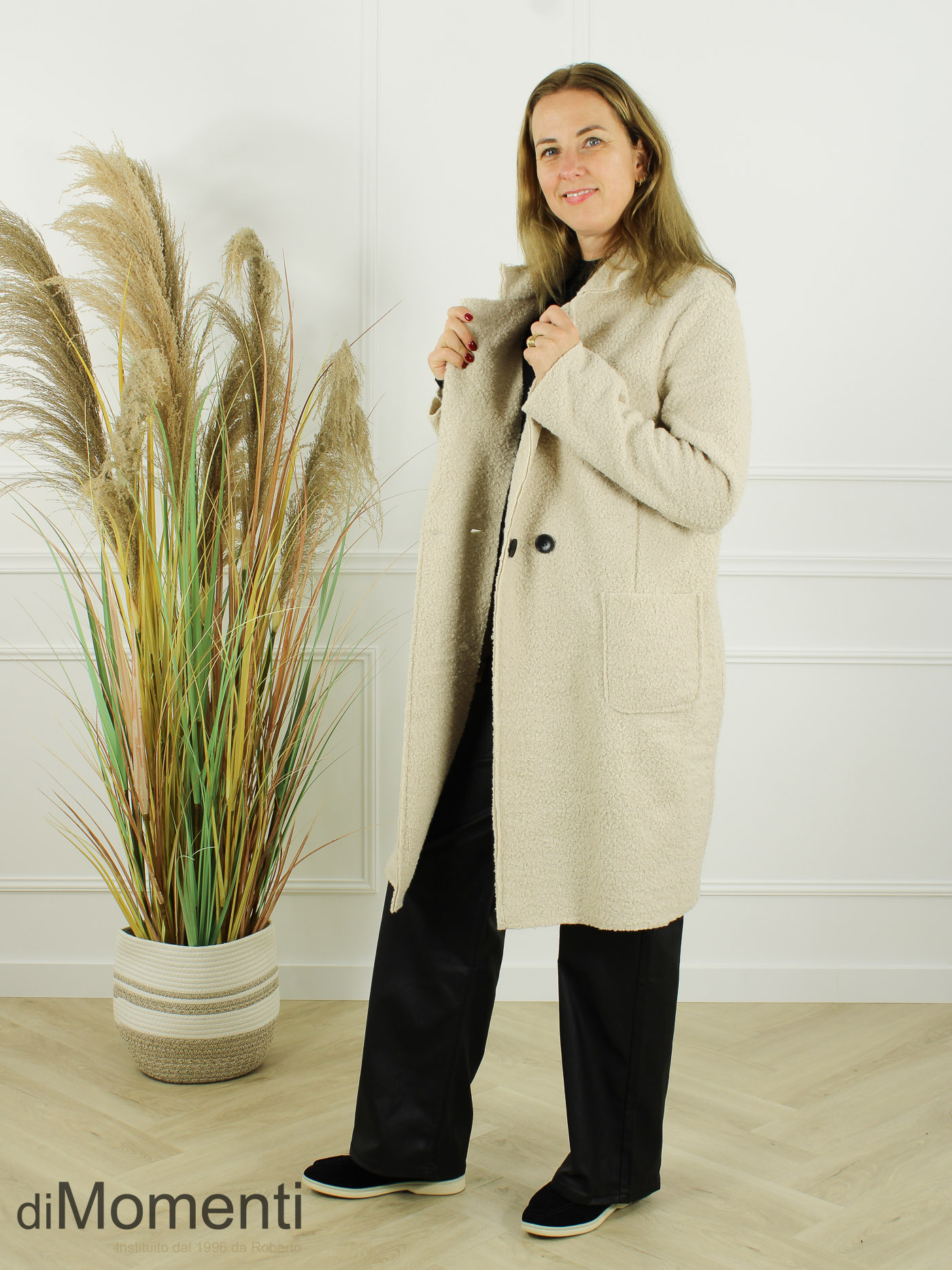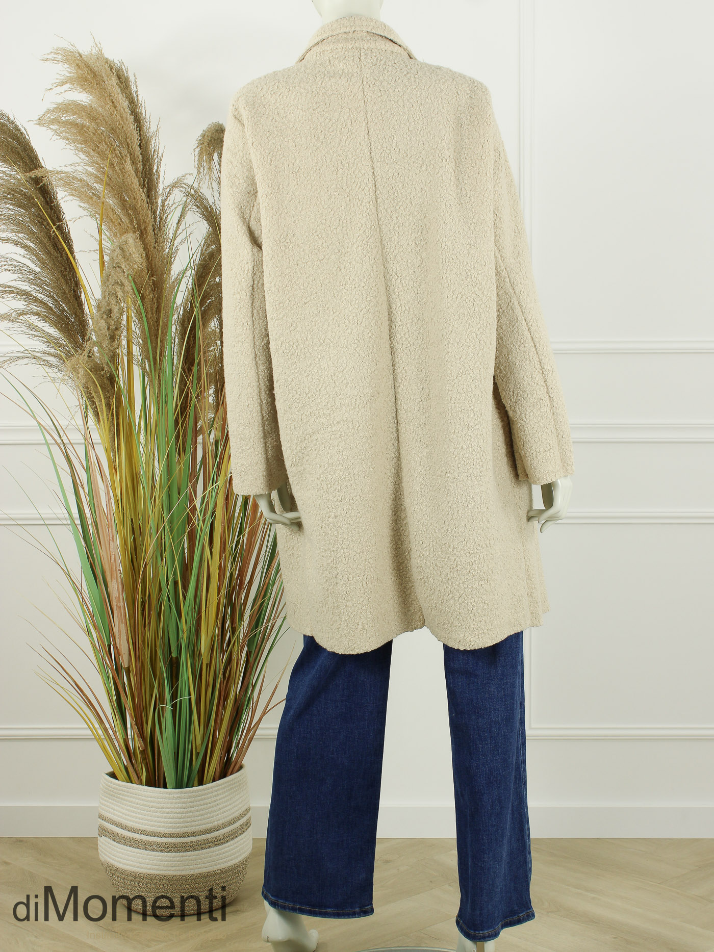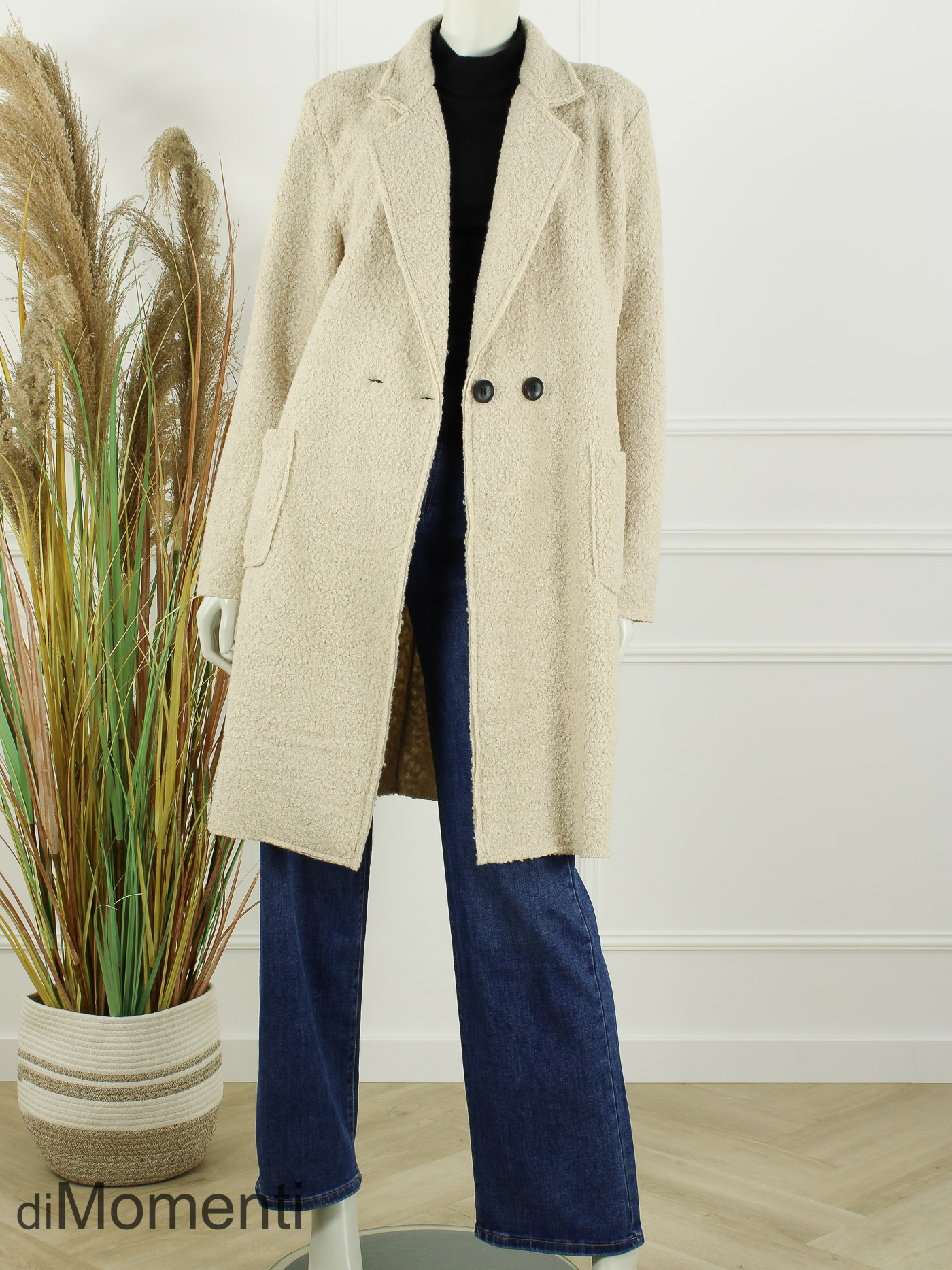Geheel nieuw is deze knielange jas/blazer van prachtige bouclé-kwaliteit een must-have van het seizoen! Het oversized model heeft twee knopen, twee zakken en valt goed tot zeker maat 44/46. Deze jas is ook goed oversized te dragen voor een kleinere maat. Door de luxe afwerking en de nieuwste modekleuren is dit een chique en warm item.