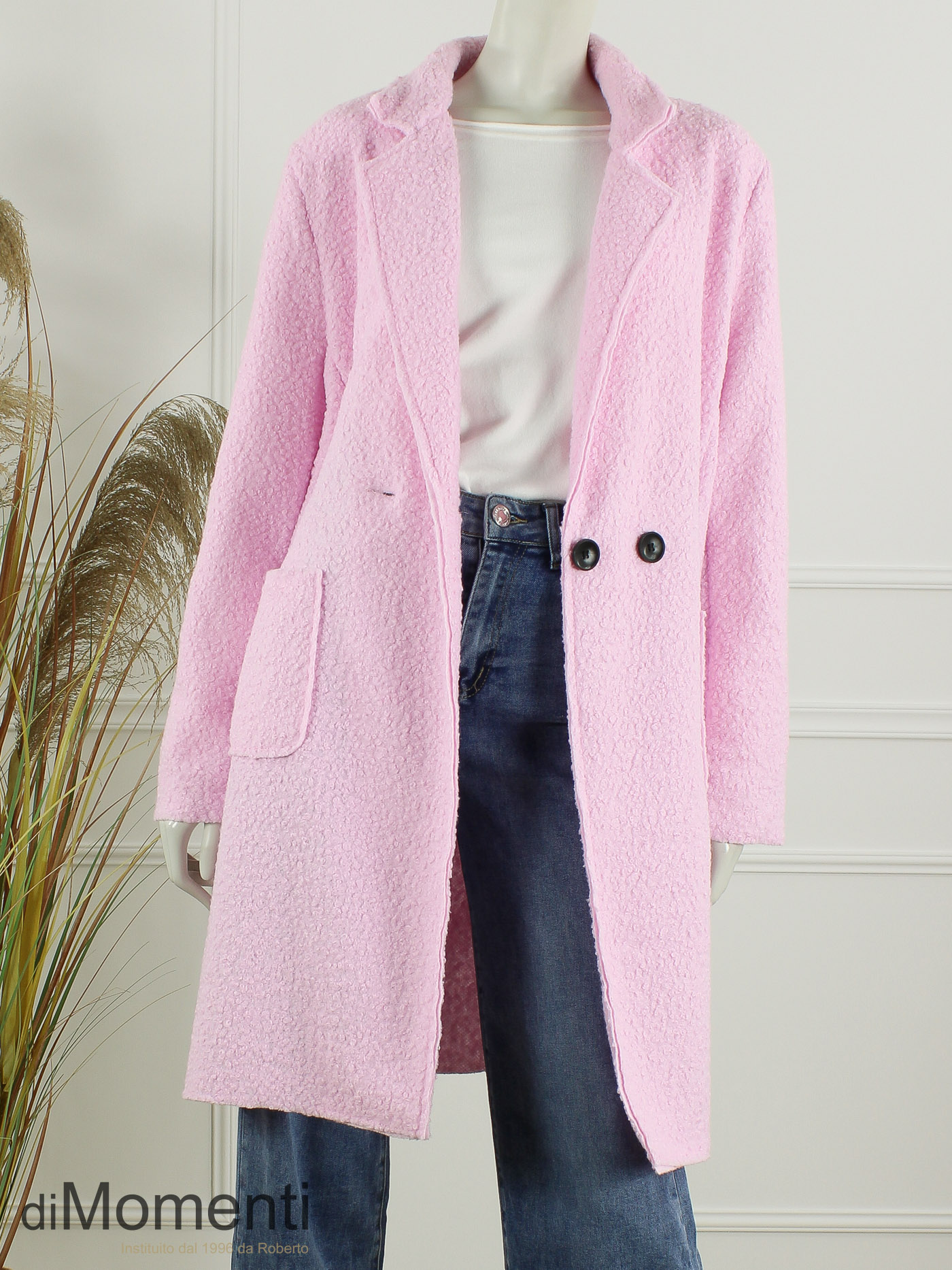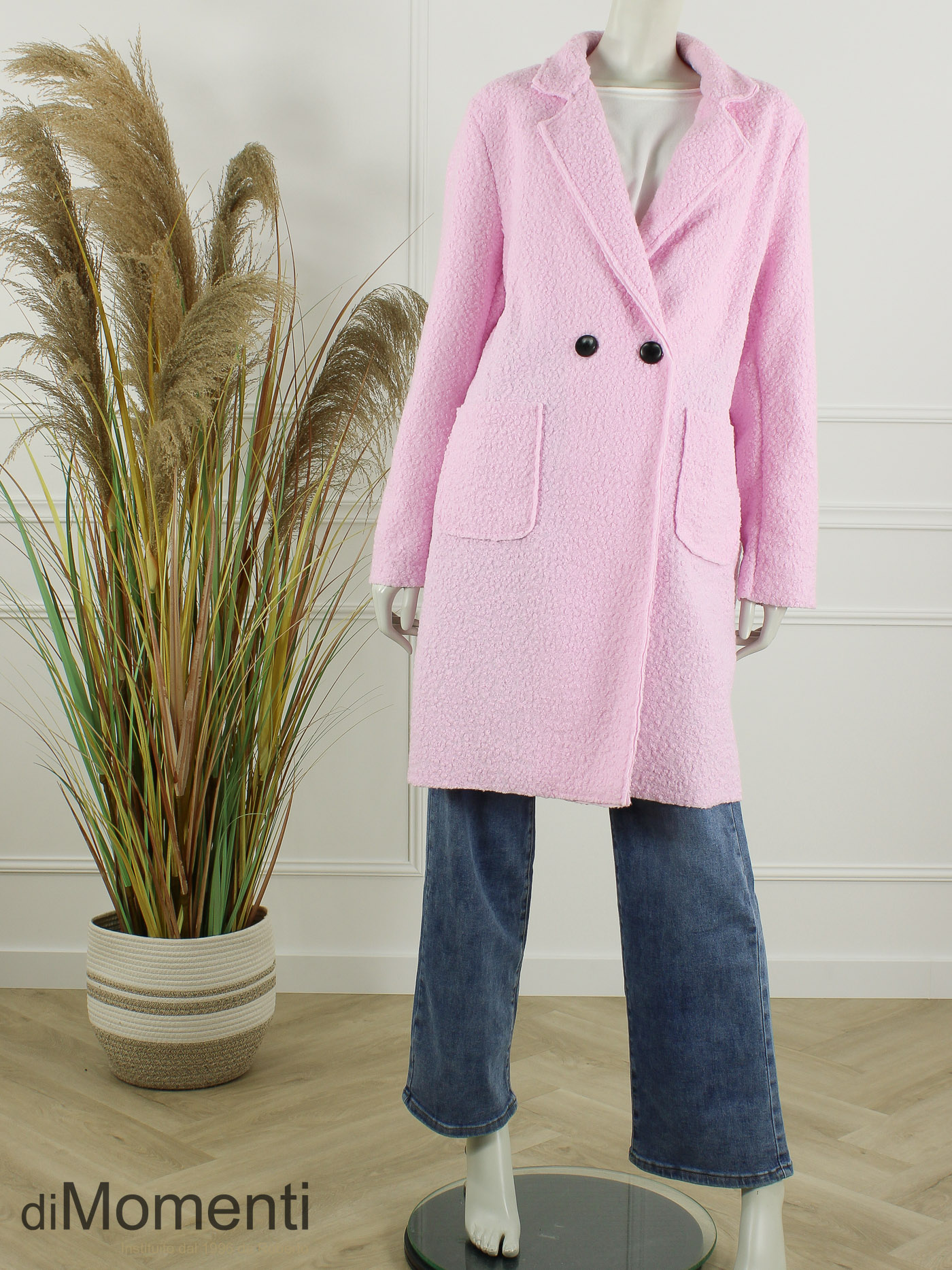 Geheel nieuw is deze knielange jas/blazer van prachtige bouclé-kwaliteit een must-have van het nieuwe seizoen! Het oversized model heeft twee knopen, twee zakken en valt goed tot zeker maat 44/46. Deze jas is ook goed oversized te dragen voor een kleinere maat. Door de luxe afwerking en de nieuwste voorjaarskleuren is dit een chique en comfy item.