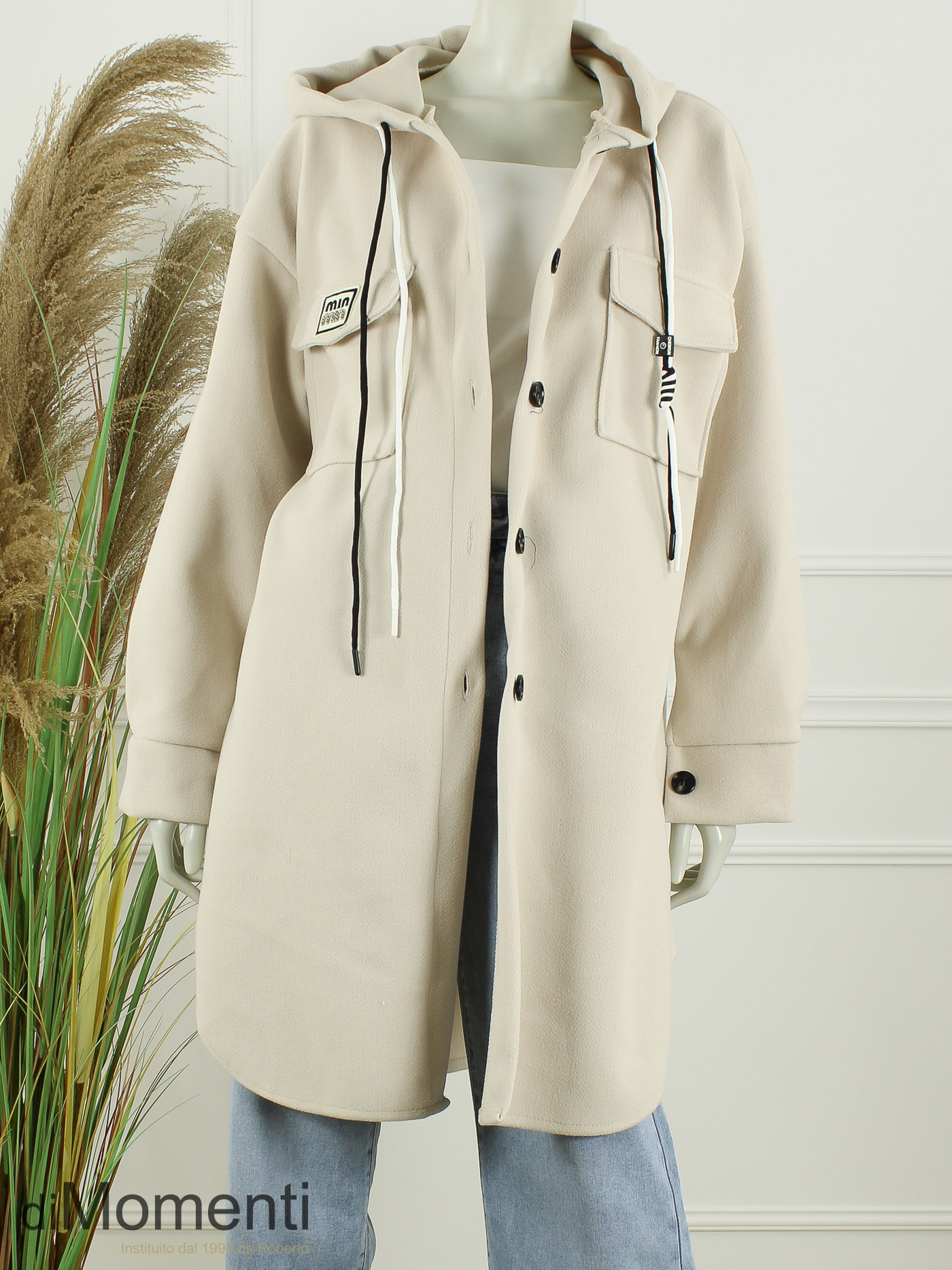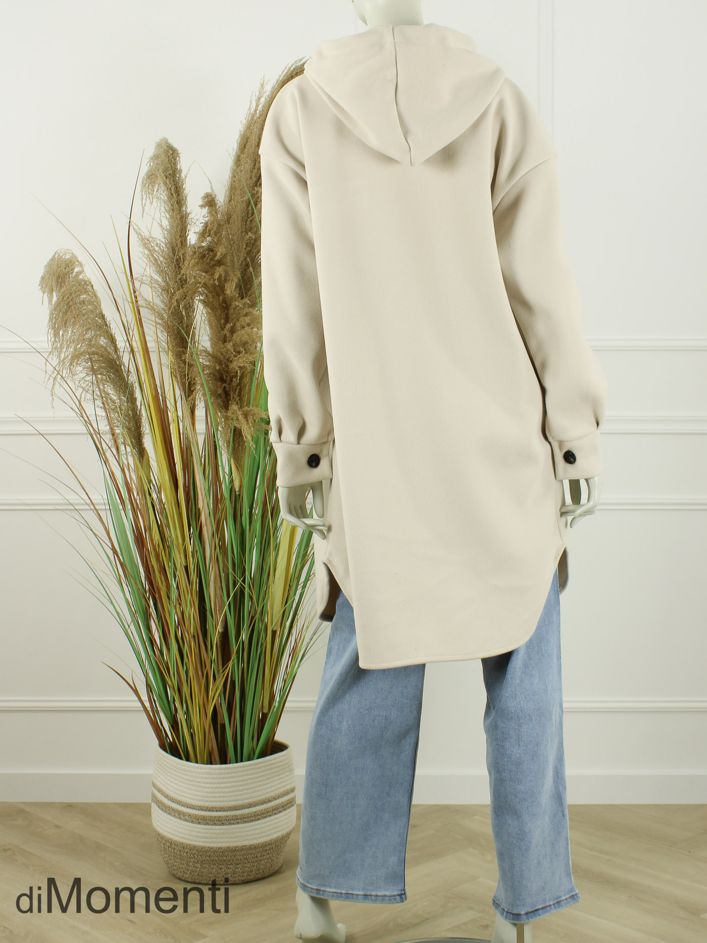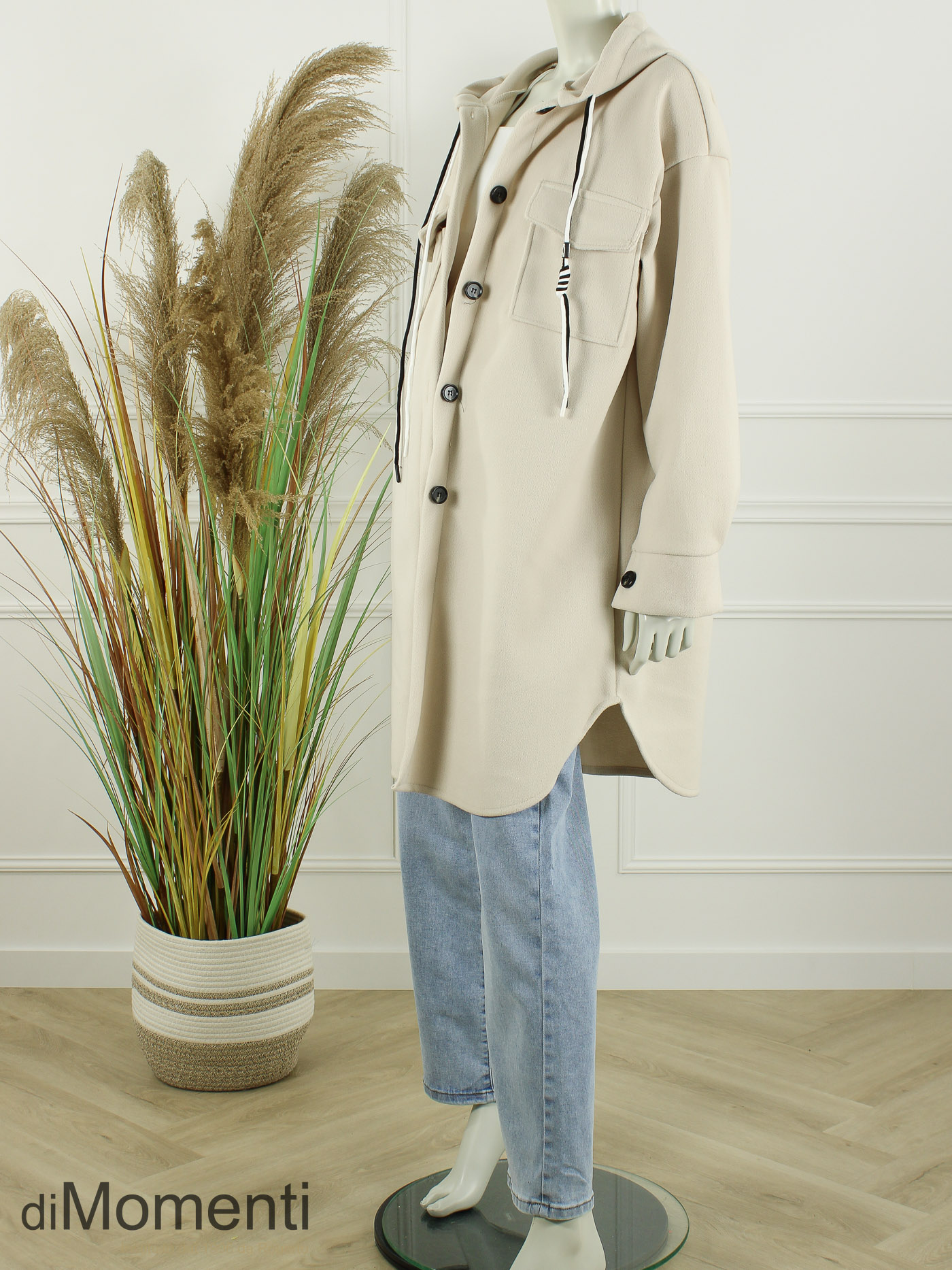 Nieuw is deze royale doorknoop jas voorzien van een capucon met de nieuwste veters als eyecatcher. Gemaakt van comfortabele stretch-polyester kwaliteit. Deze jas is verkrijgbaar in de nieuwste voorjaarskleuren en is one size goed t/m maat 44.