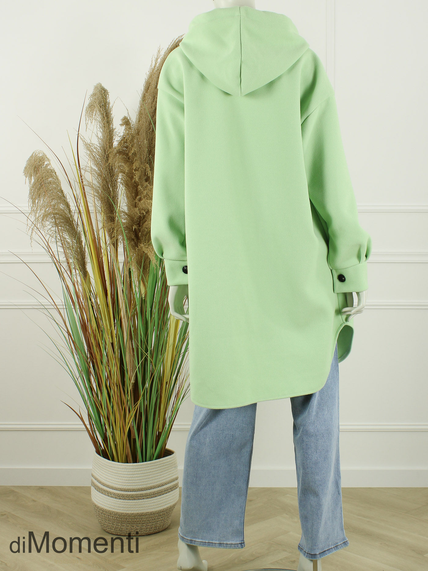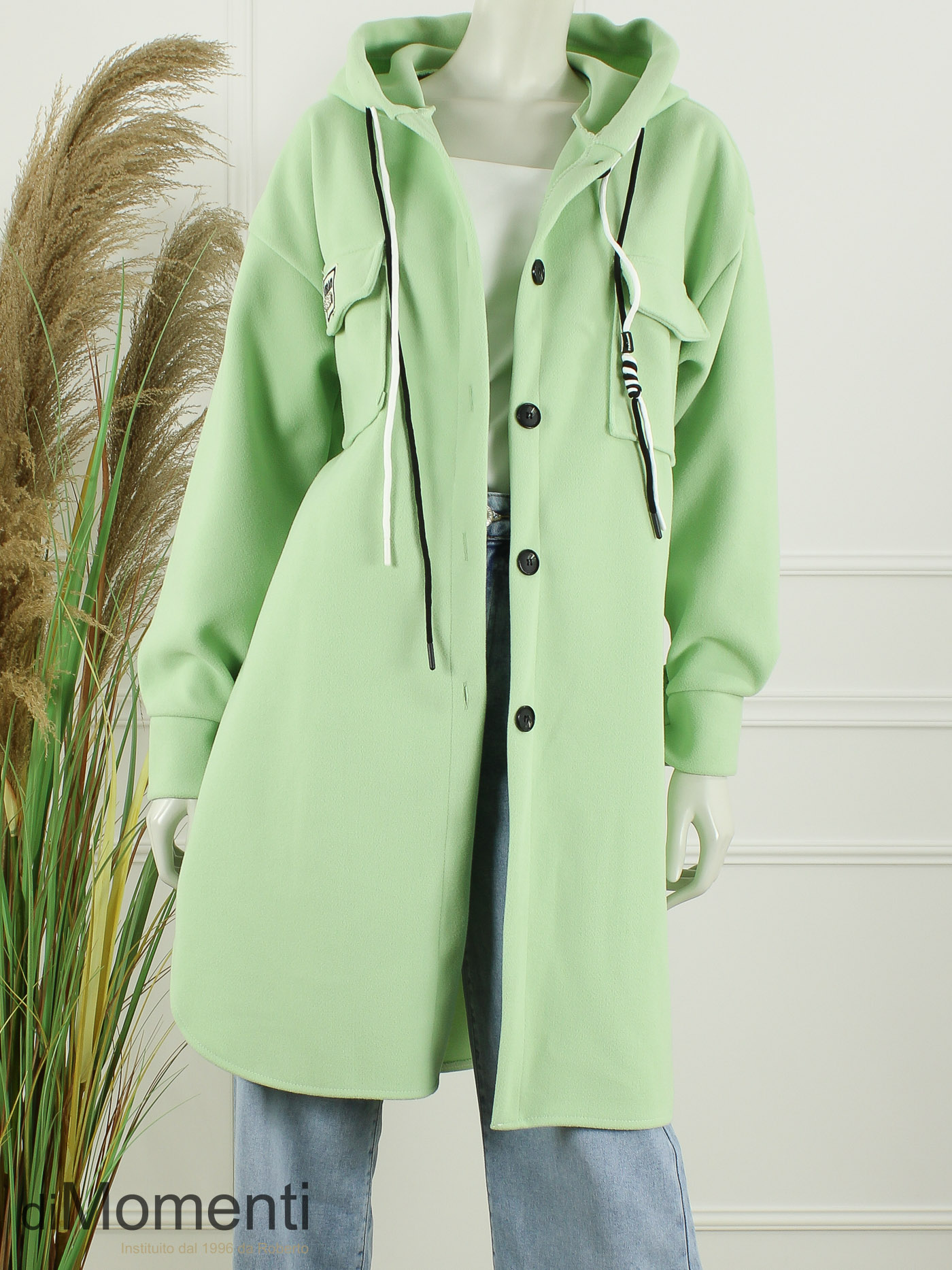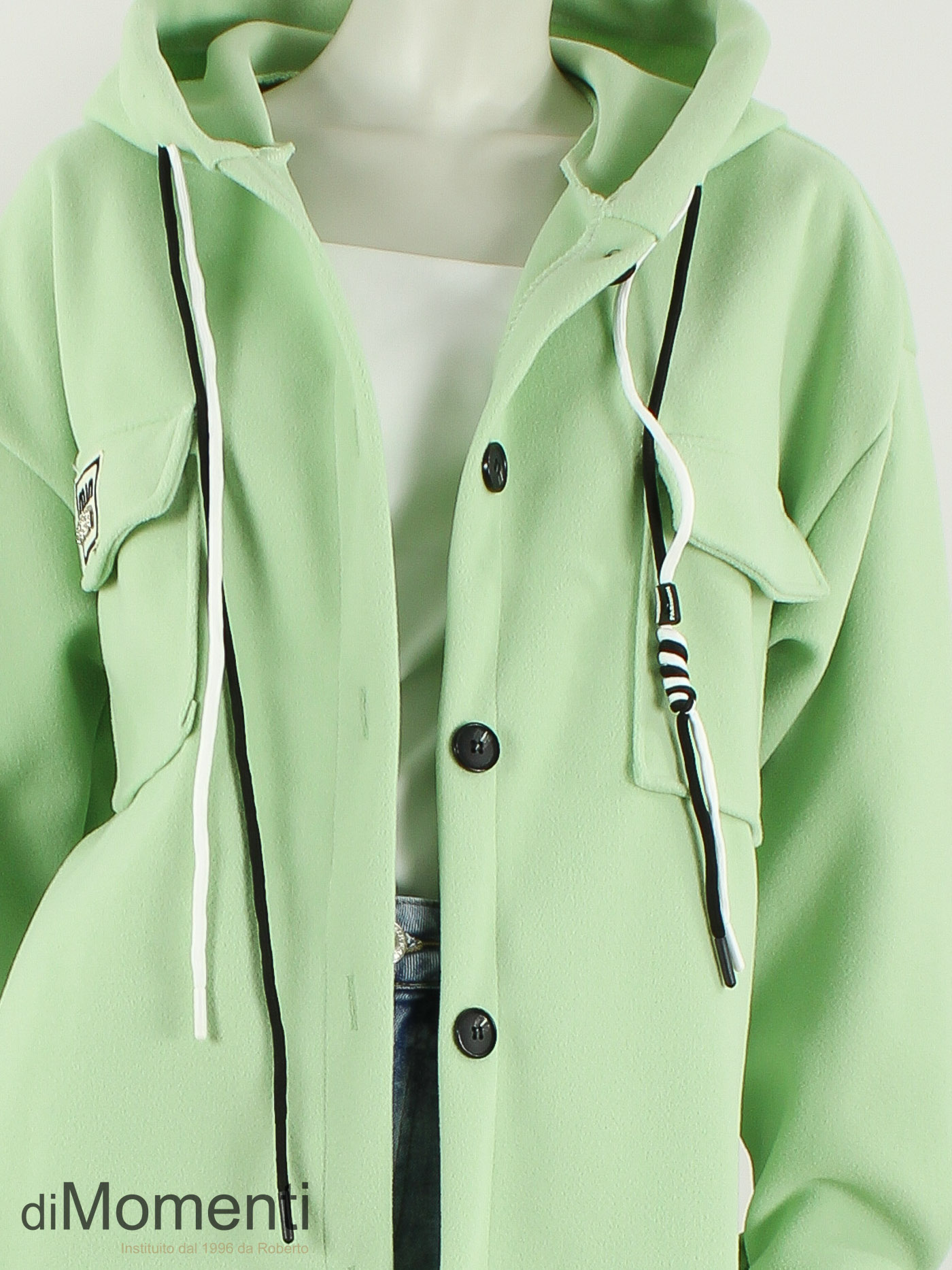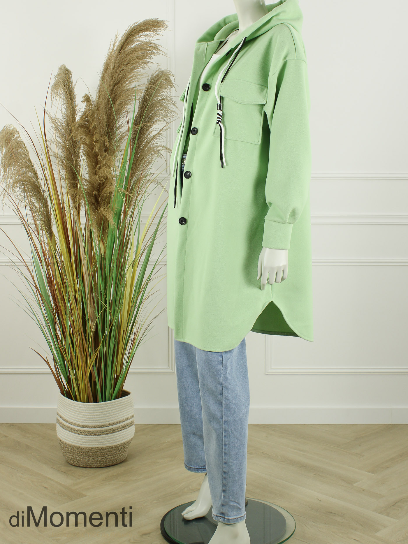 Nieuw is deze royale doorknoop jas voorzien van een capucon met de nieuwste veters als eyecatcher. Gemaakt van comfortabele stretch-polyester kwaliteit. Deze jas is verkrijgbaar in de nieuwste voorjaarskleuren en is one size goed t/m maat 44.