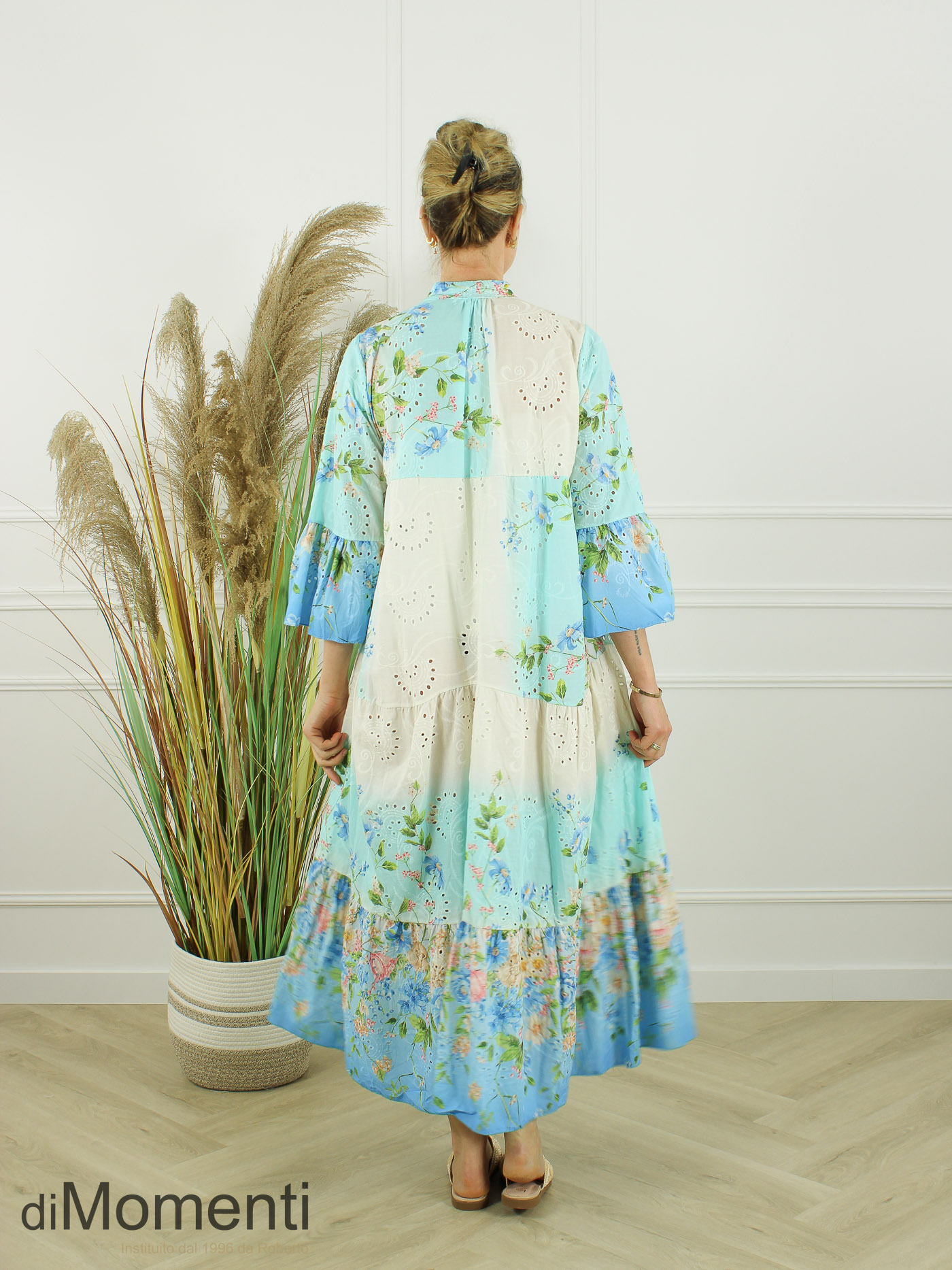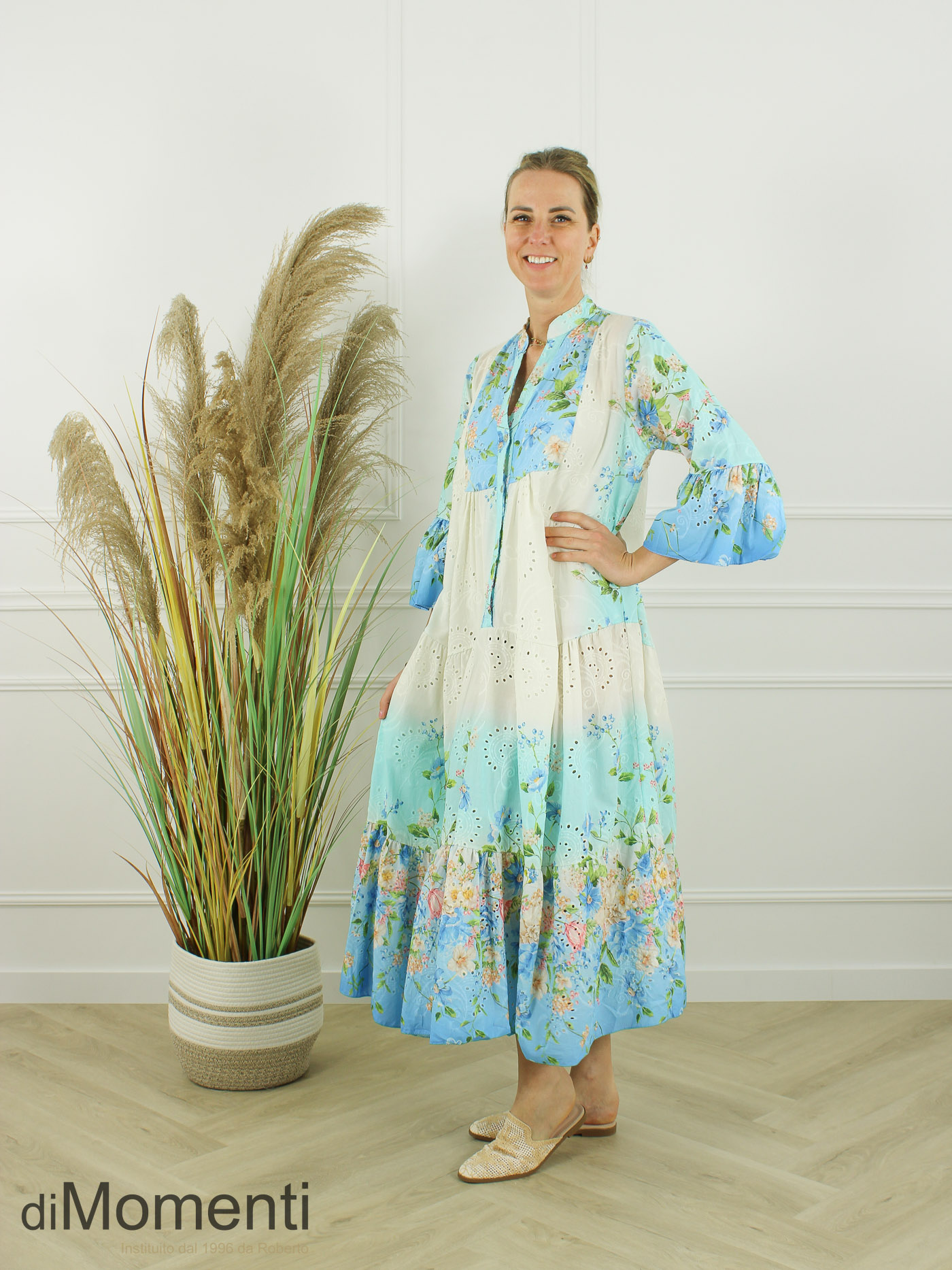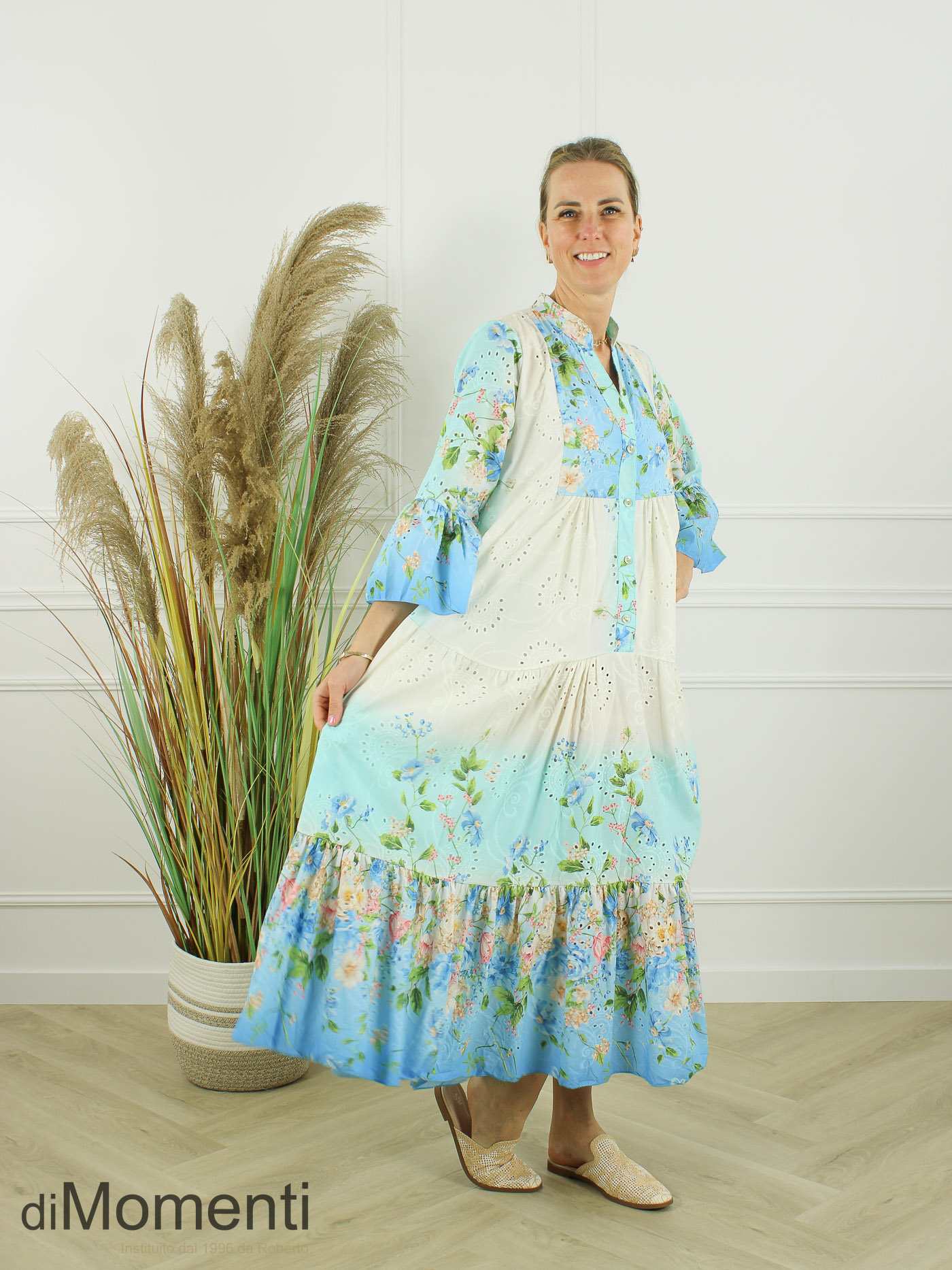 Franse Riviera allure van Noéline Paris! Deze lange A-lijn jurk (135 cm) in katoenen broderie straalt luxe uit met een prachtige bloemenprint. De elegante V-hals en 3/4 mouwen met ruches maken het model supervrouwelijk. Een exclusieve, luchtige eyecatcher die elke collectie direct een zomerse haute-couture uitstraling geeft.