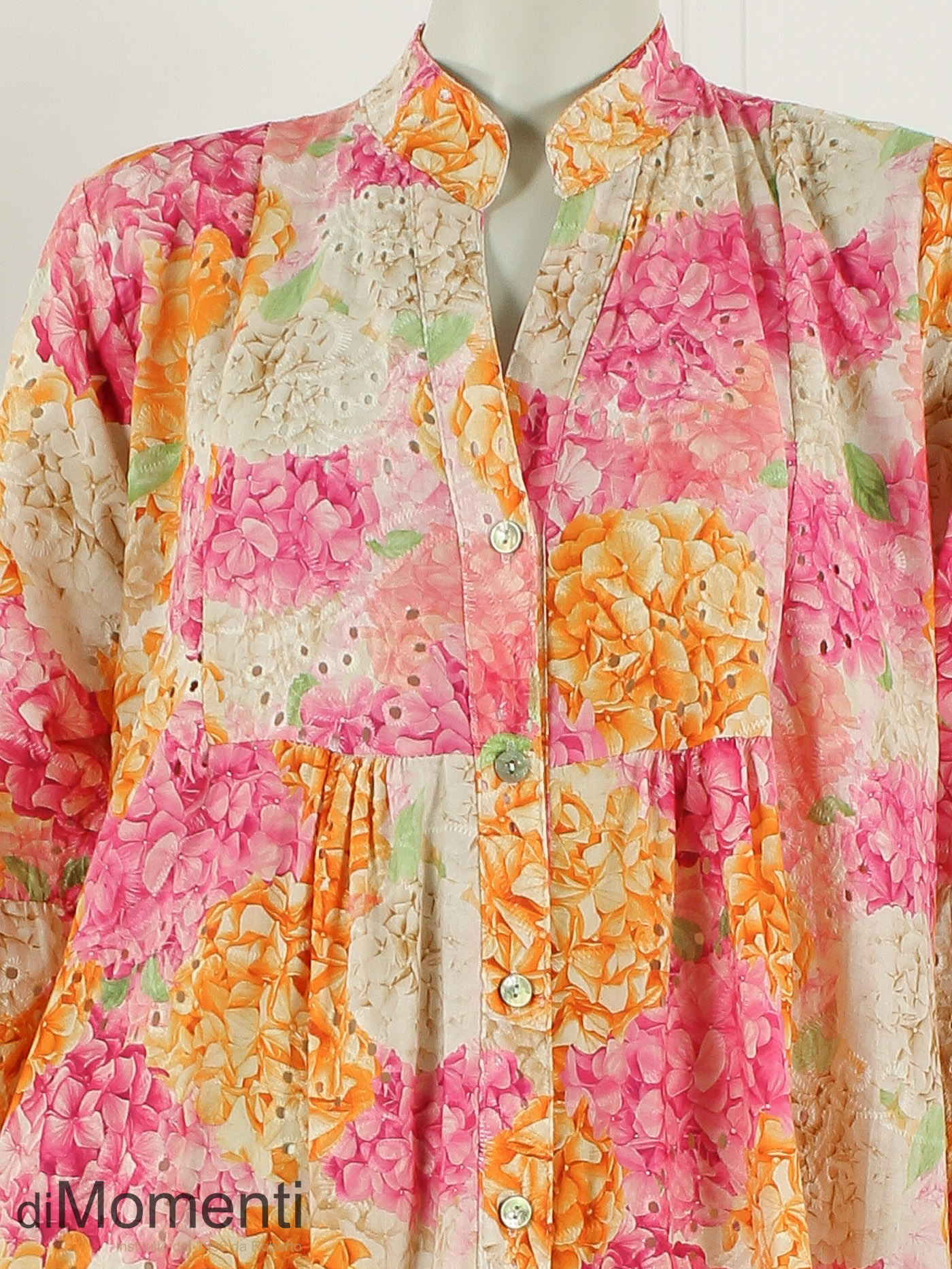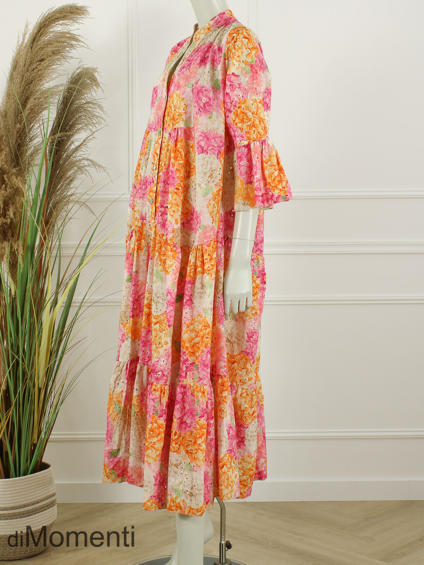 Franse Riviera allure van Noéline Paris! Deze lange A-lijn jurk (135 cm) in katoenen broderie straalt luxe uit met een prachtige bloemenprint. De elegante V-hals en 3/4 mouwen met ruches maken het model supervrouwelijk. Een exclusieve, luchtige eyecatcher die elke collectie direct een zomerse haute-couture uitstraling geeft.
