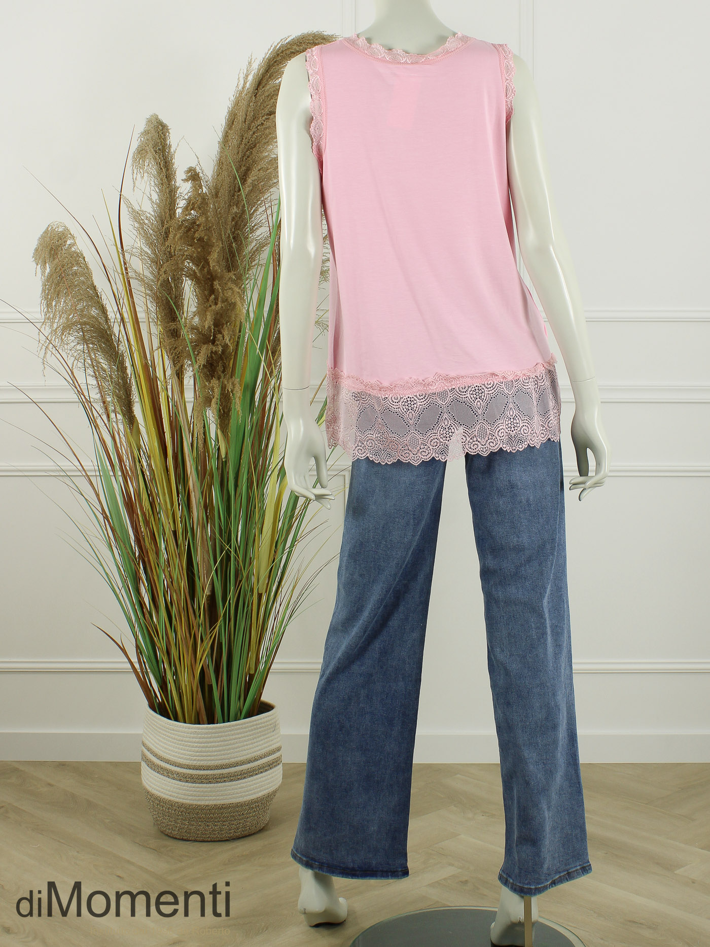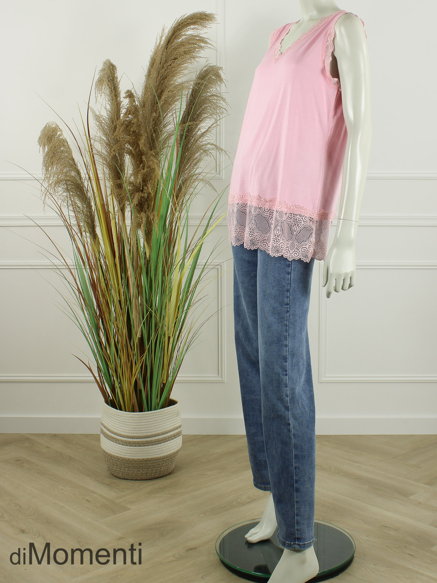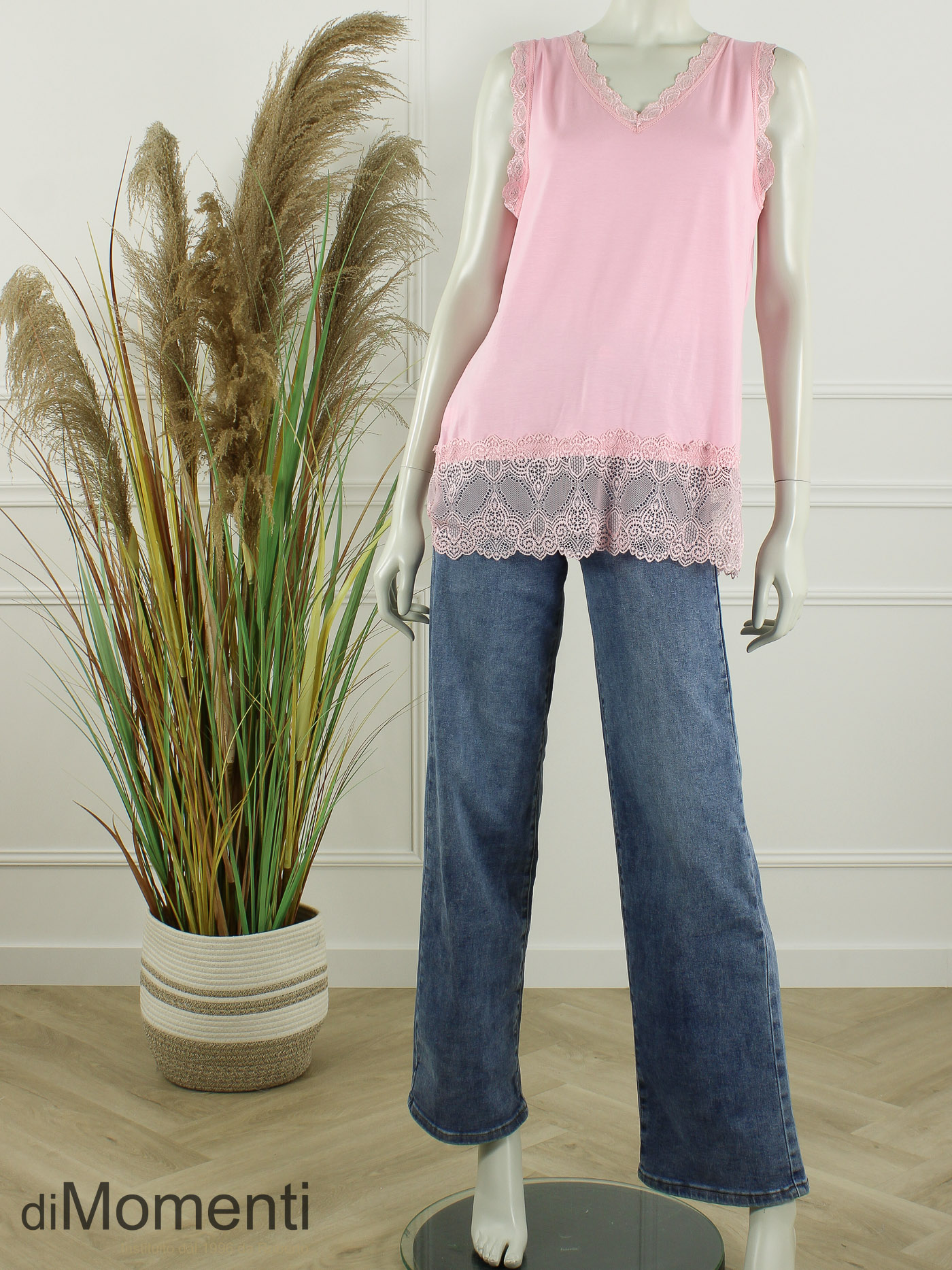 Deze hoogwaardige tricot top met stretch is de ideale layering-piece. Voorzien van een elegante V-hals en schouderdetails van kant. Met een lengte van 70 cm en een prachtige kanten bies (15 cm) onderaan, is dit item perfect onder een blazer.