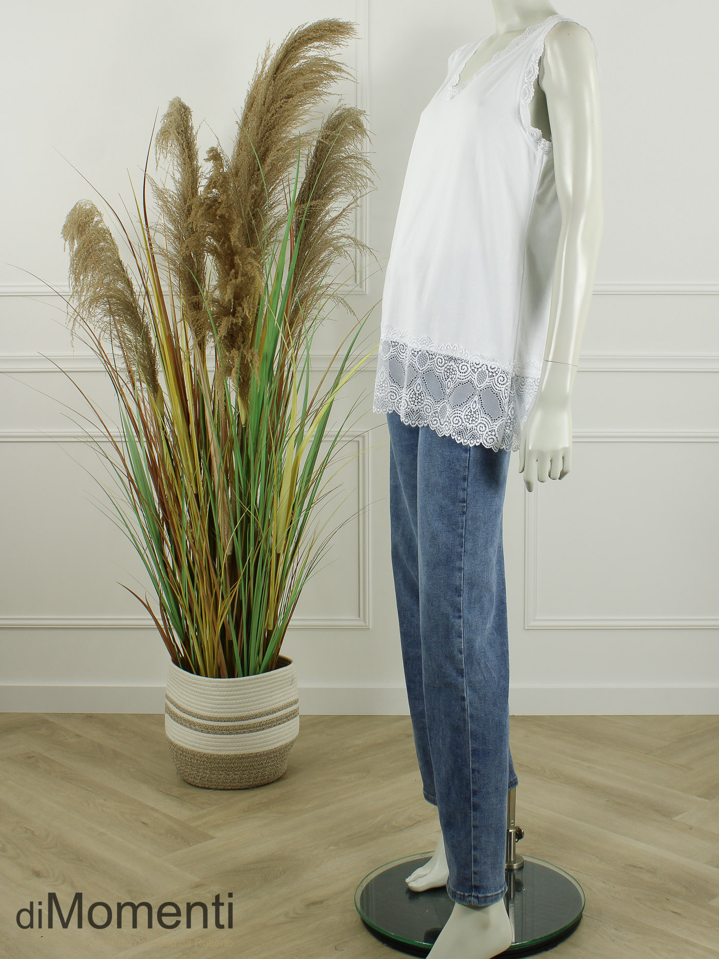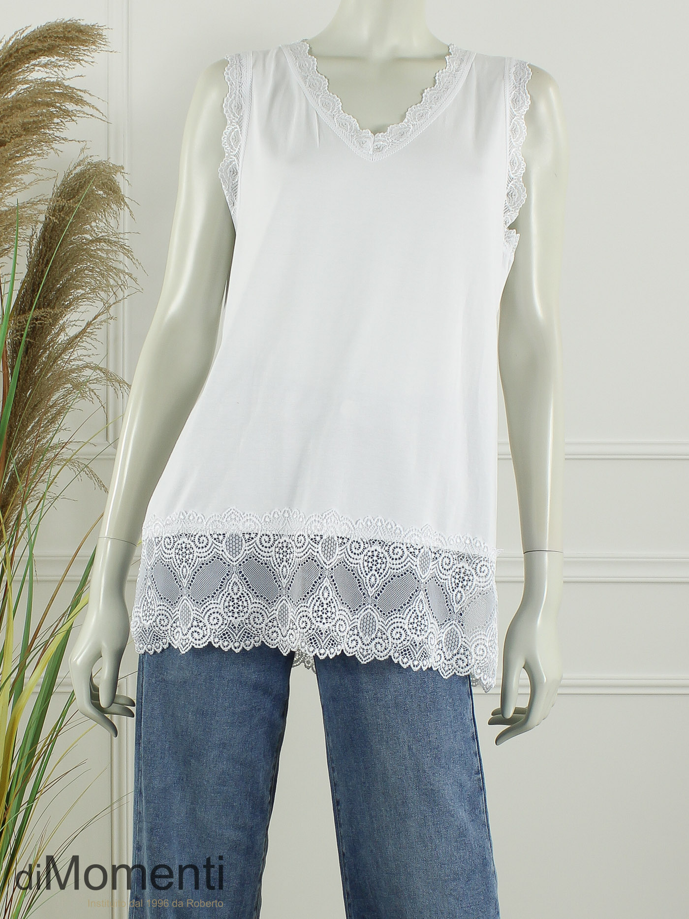 Deze hoogwaardige tricot top met stretch is de ideale layering-piece. Voorzien van een elegante V-hals en schouderdetails van kant. Met een lengte van 70 cm en een prachtige kanten bies (15 cm) onderaan, is dit item perfect onder een blazer.
