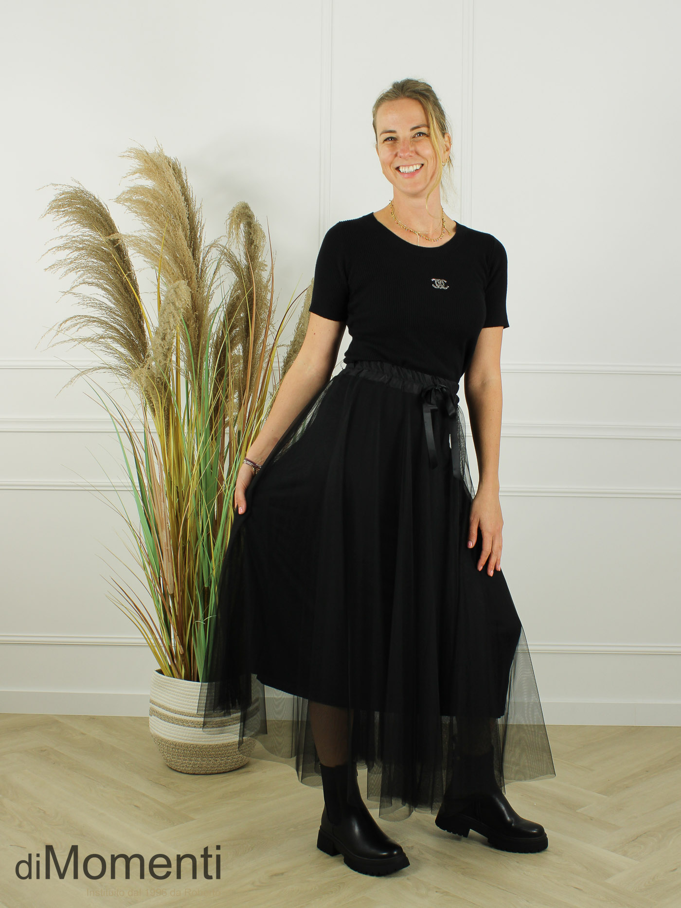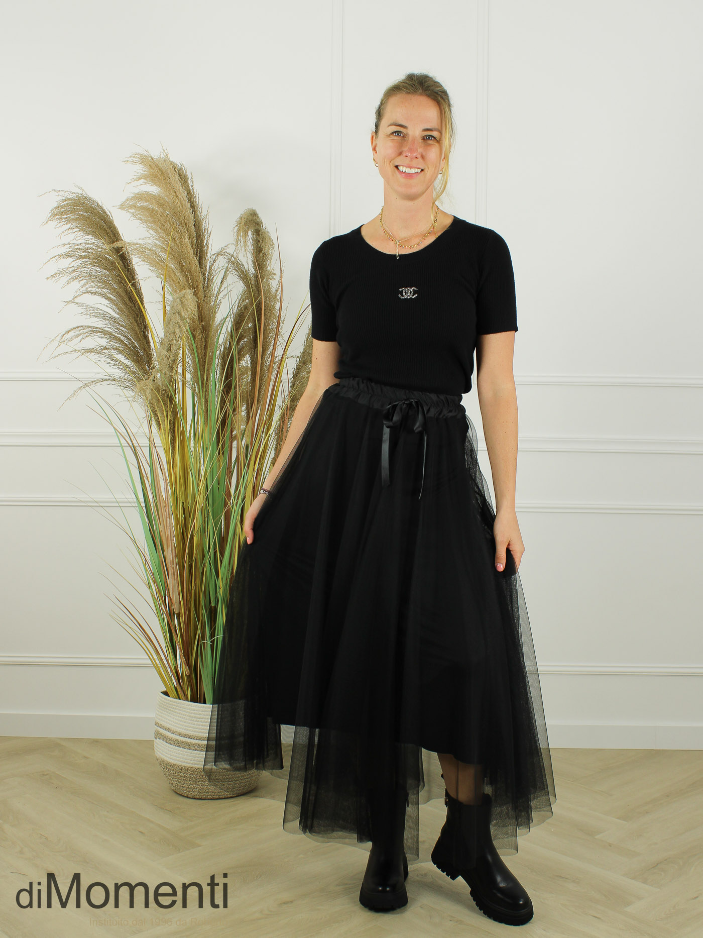 Deze schitterende tule rok zorgt voor een gracieuze look dankzij de royale verwerking van tule. De satijnlook tailleband met strik geeft een chique accent! De rok is geheel gevoerd en verkrijgbaar in de mooiste najaarstinten. Een eyecatcher voor uw collectie!