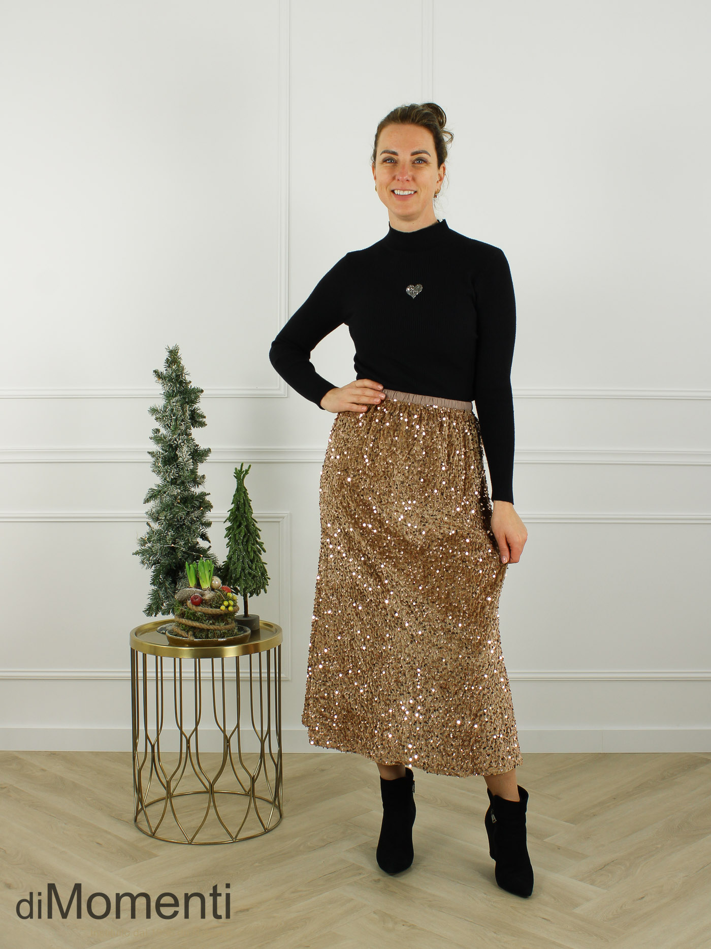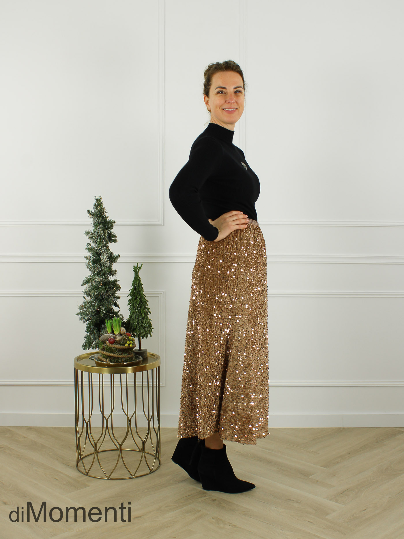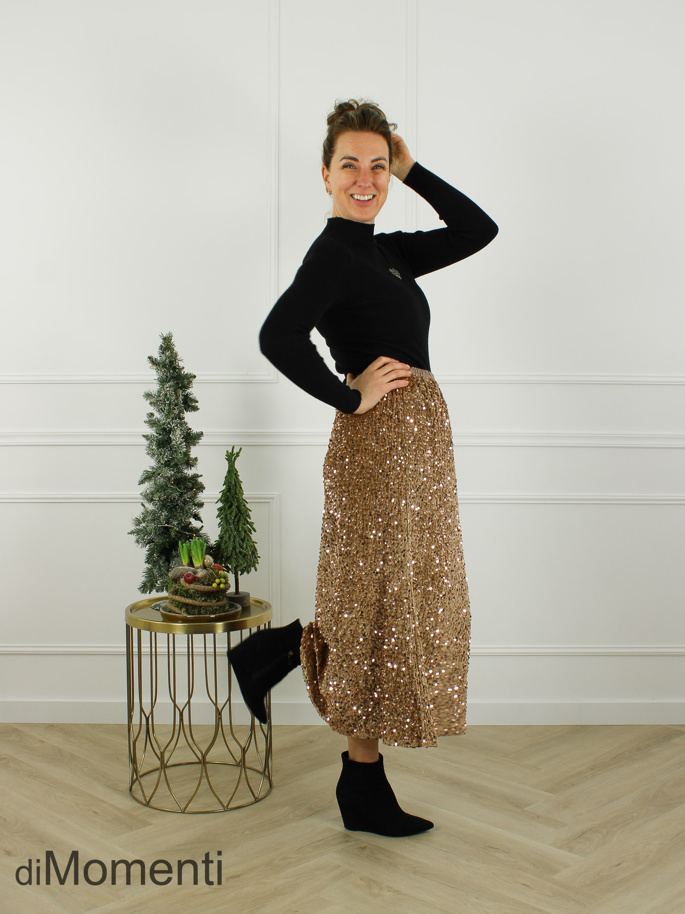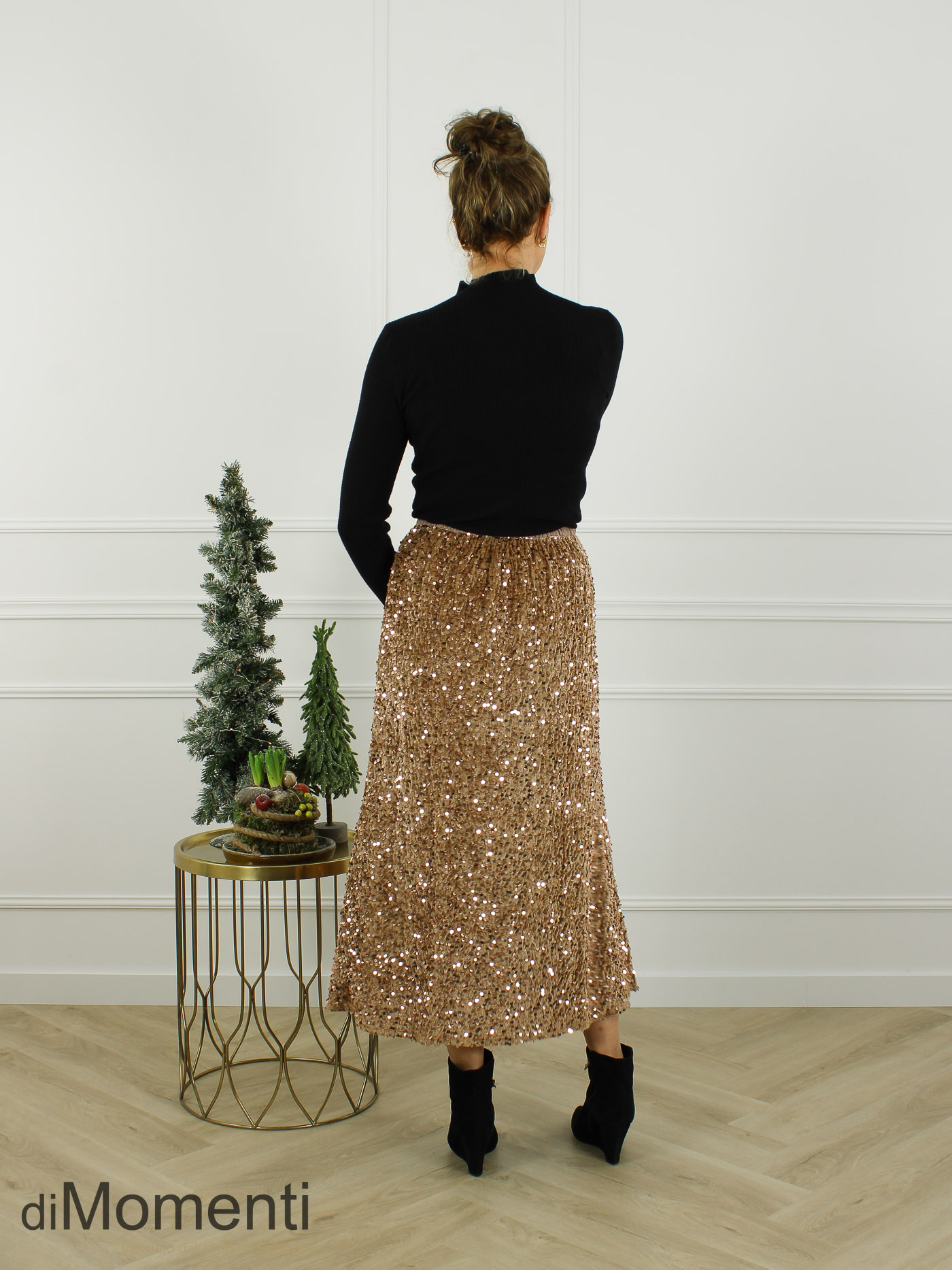 Deze supermooie rok van velours is een feestelijke droom! De rok is voorzien van schitterende pailletten all-over en heeft een comfortabele elastische tailleband. De glans van de velours geeft een extra chique touch. Geheel gevoerd en verkrijgbaar in diverse kleuren.