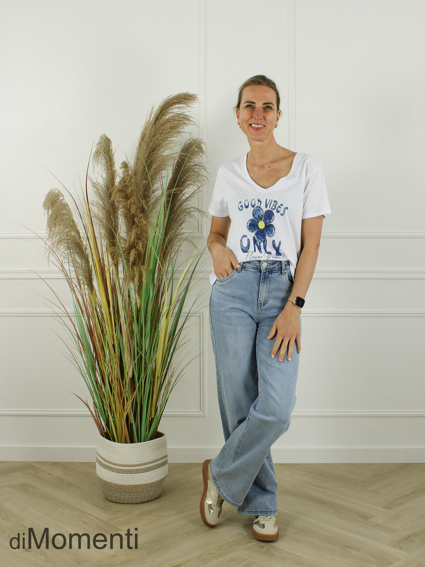 Geef uw collectie een romantische touch met dit stijlvolle T-shirt. Vervaardigd uit hoogwaardig katoen met een flatterende V-hals. De eyecatcher is de print “ Good Vibes” Een trendy look die perfect combineert met een blazer of stoere jeans!