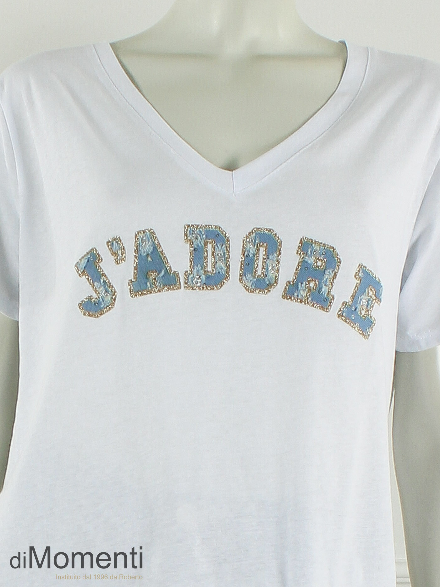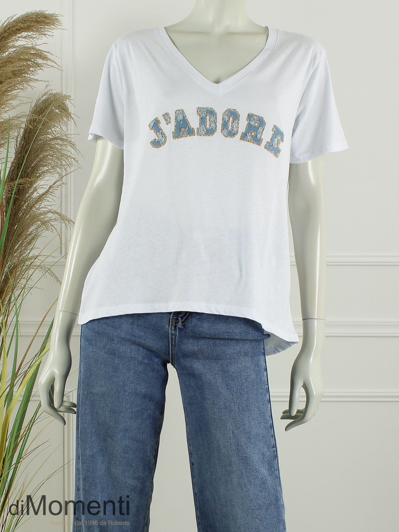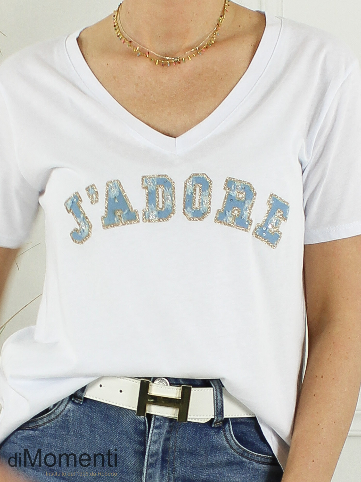 Geef uw collectie een romantische touch met dit stijlvolle T-shirt. Vervaardigd uit hoogwaardig katoen met een flatterende V-hals. De eyecatcher is de applicatie van gehavende denim en glimmende details met de tekst ‘J’adore’. Een tijdloze look die perfect combineert met een blazer of stoere jeans!