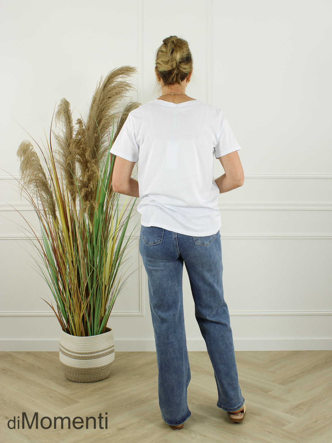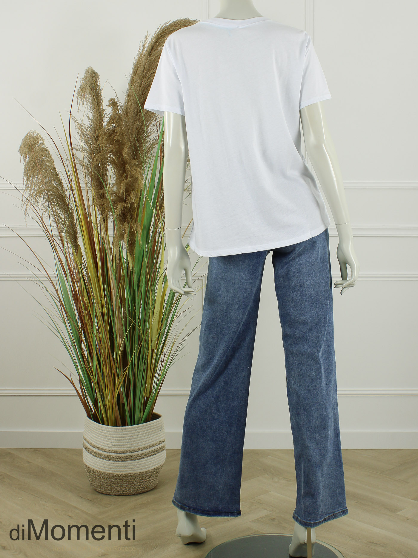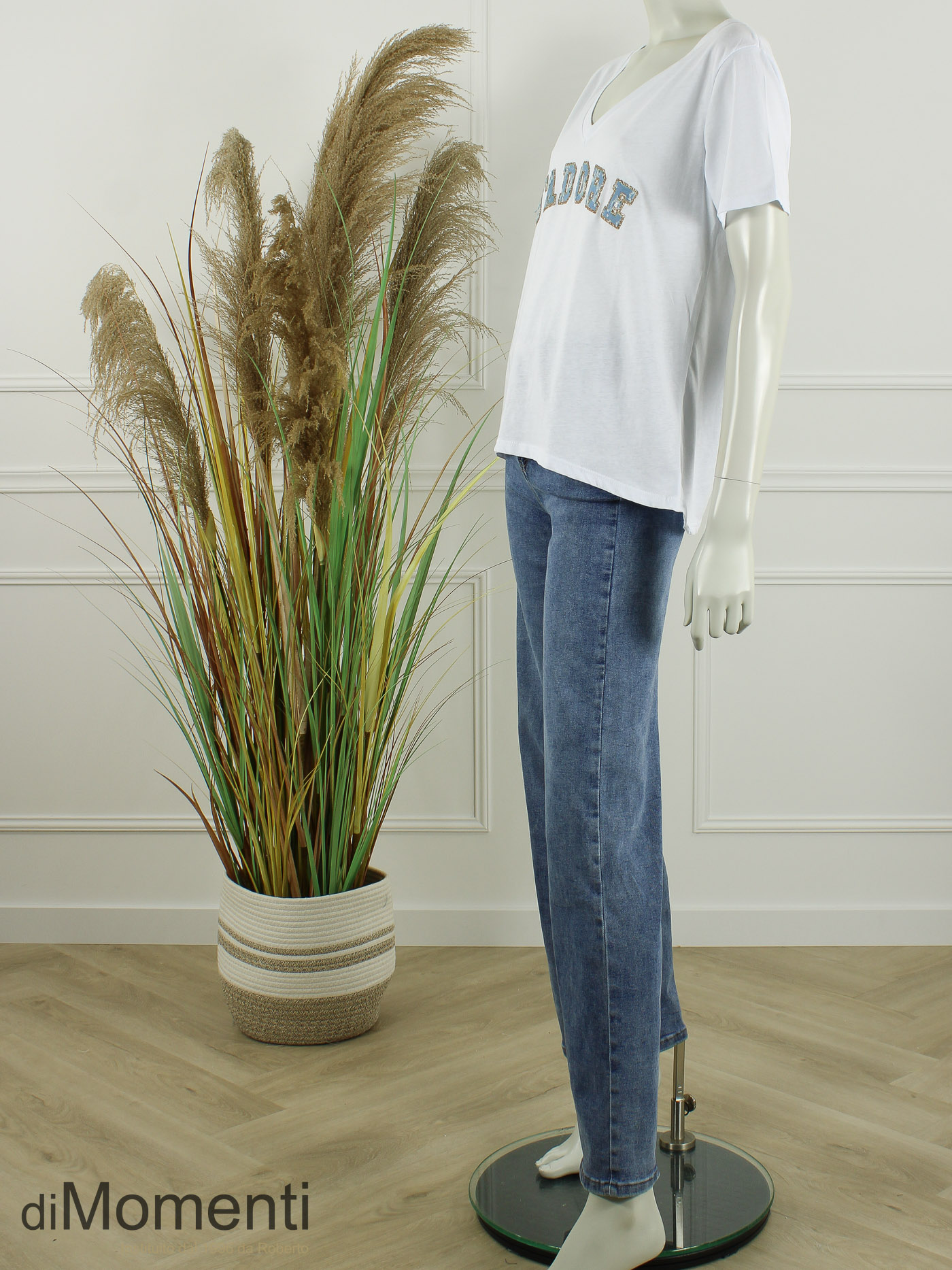 Geef uw collectie een romantische touch met dit stijlvolle T-shirt. Vervaardigd uit hoogwaardig katoen met een flatterende V-hals. De eyecatcher is de applicatie van gehavende denim en glimmende details met de tekst ‘J’adore’. Een tijdloze look die perfect combineert met een blazer of stoere jeans!