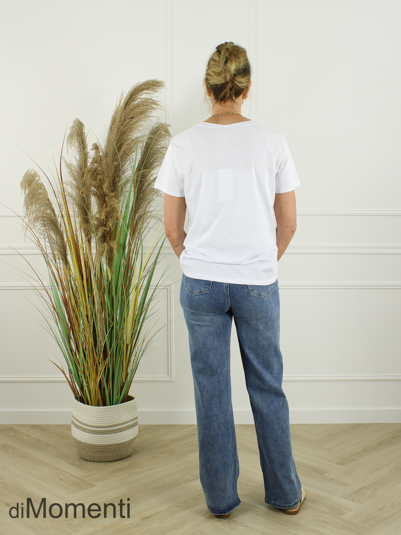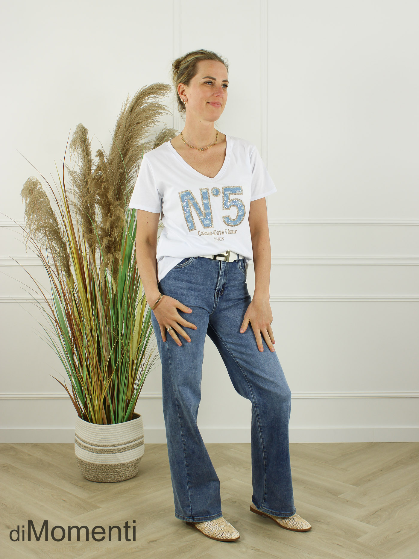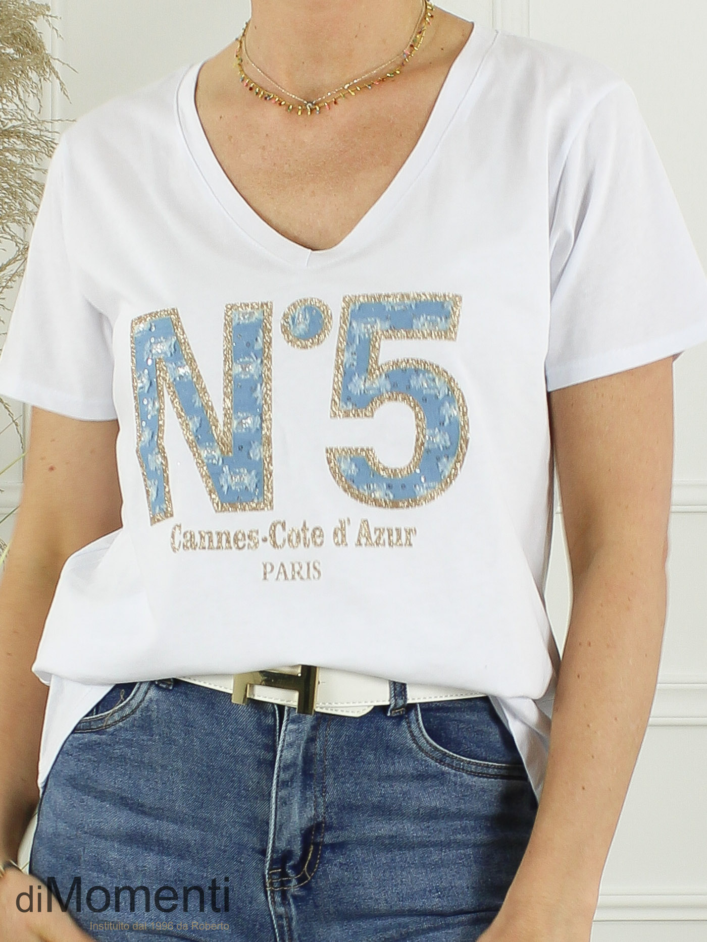 Cannes Vibes: Haal de Côte d’Azur naar uw collectie met dit trendy T-shirt. Vervaardigd uit hoogwaardig katoen met een elegante V-hals. De eyecatcher is de applicatie van gehavende denim en glimmende details. Een iconische look met een stoere twist.