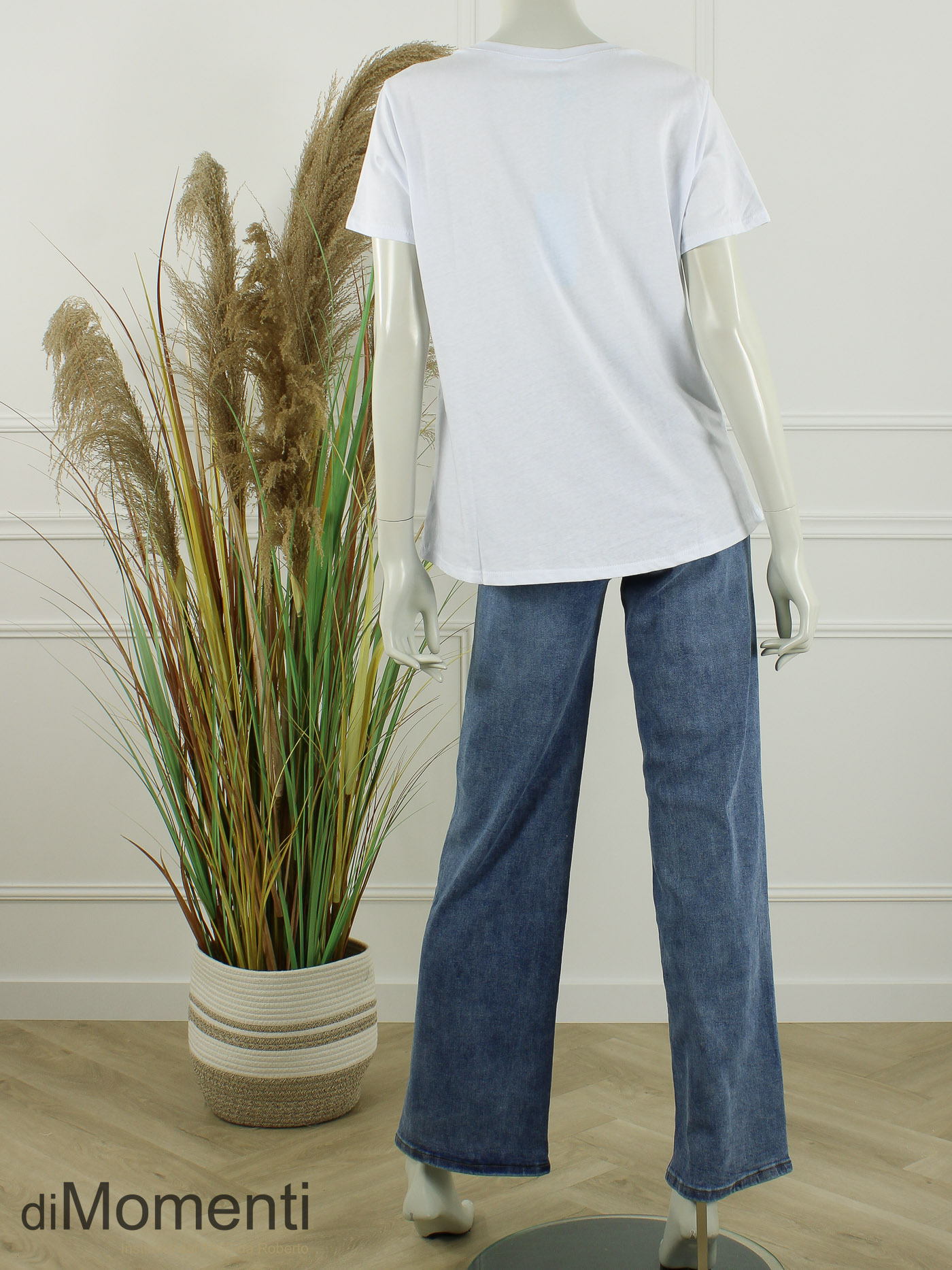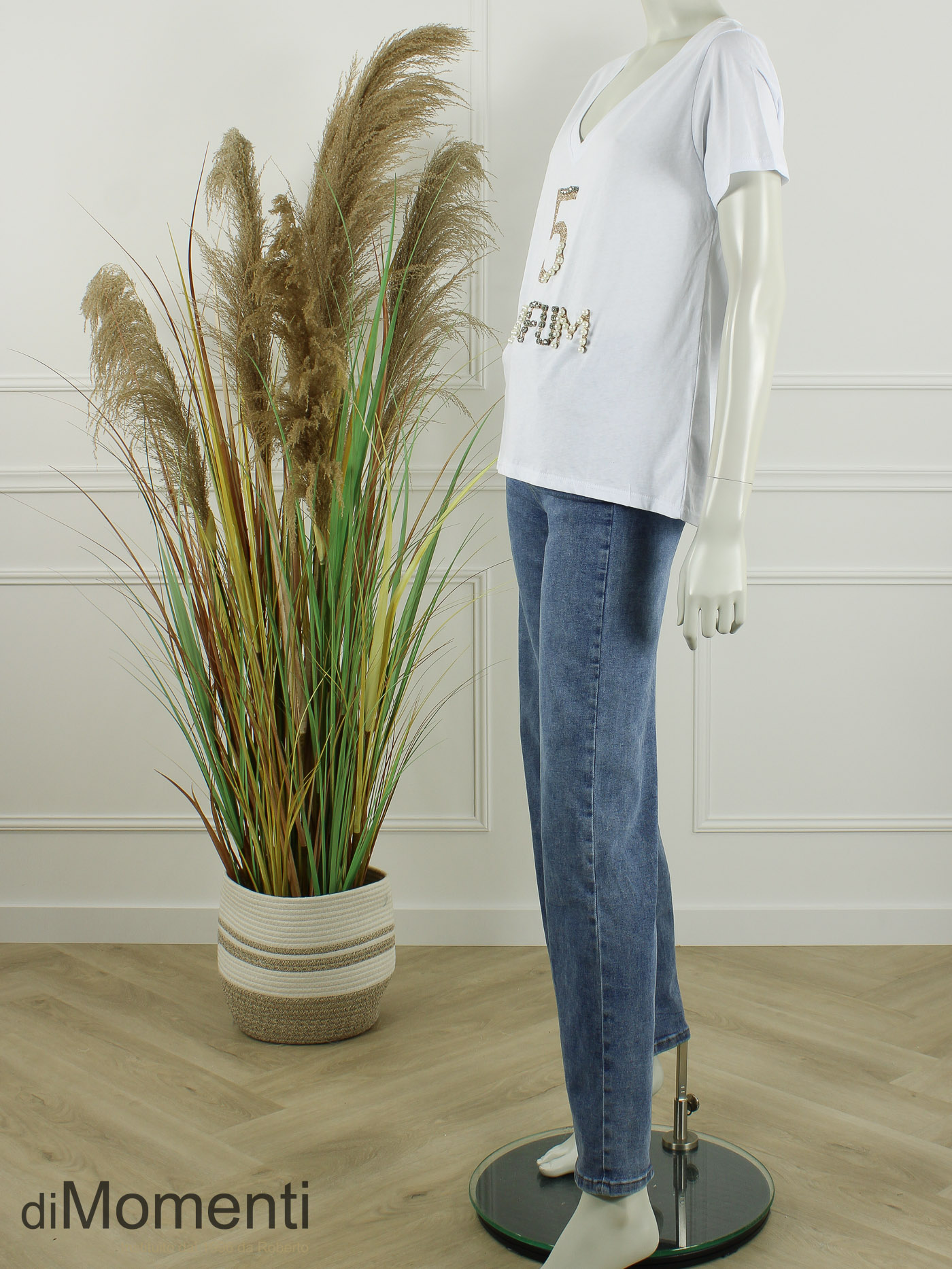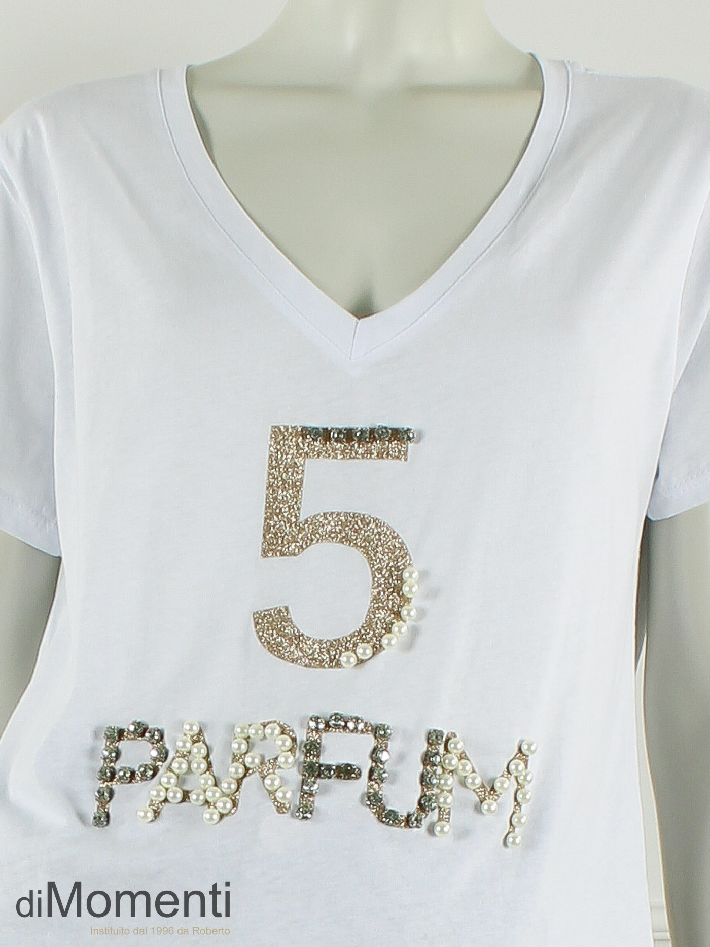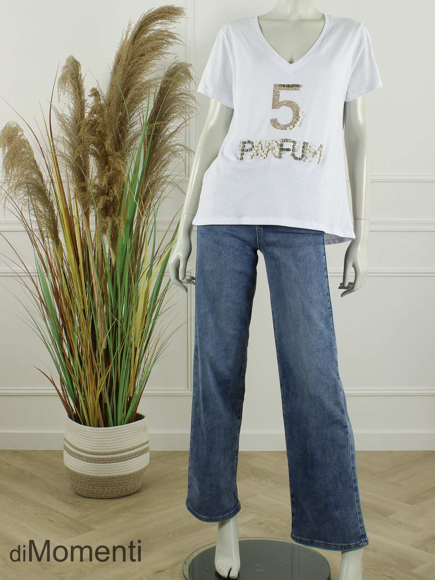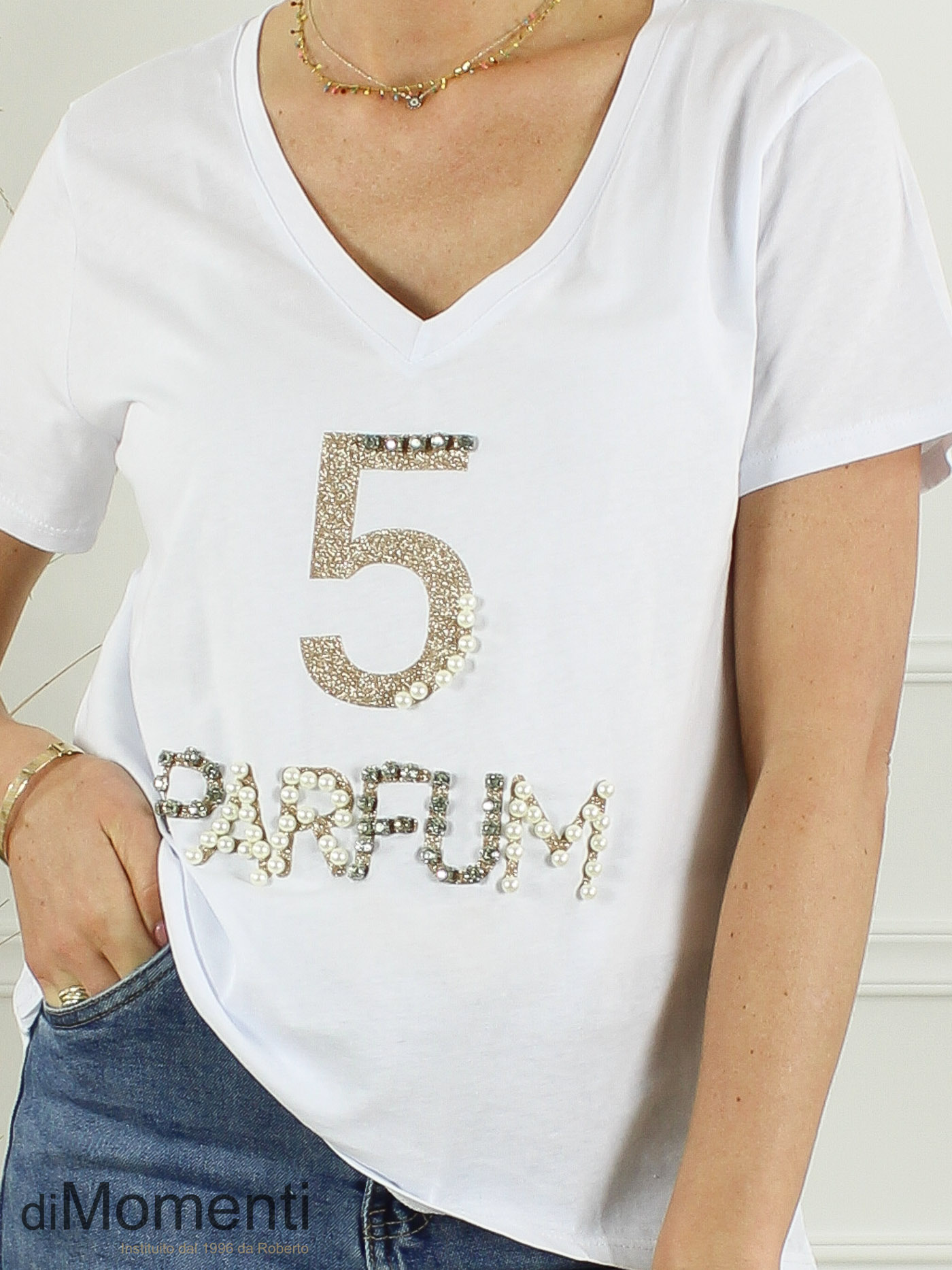 Breng glamour in uw collectie met dit 100% katoenen T-shirt met V-hals. De schitterende applicatie is rijk gedecoreerd met glimmende strass-steentjes en parels. Een hoogwaardig item dat sportieve denim combineert met pure luxe. Perfect voor een stijlvolle, modische look!