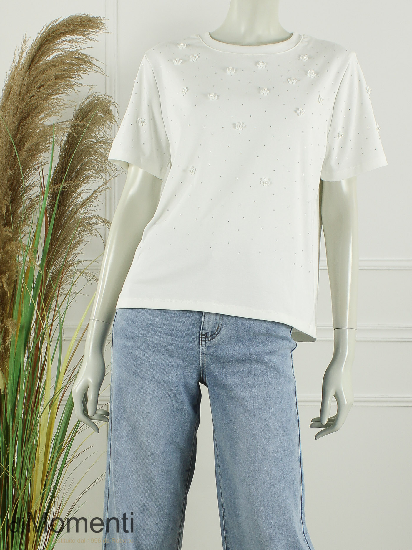 Voeg een vleugje luxe toe aan de basiscollectie met dit prachtige T-shirt. De combinatie van fonkelende strass-steentjesen geborduurde bloemetjes met een parel-accent geeft een exclusieve uitstraling. Dankzij de katoenmix met elastan biedt dit shirt een heerlijk comfortabele pasvorm.