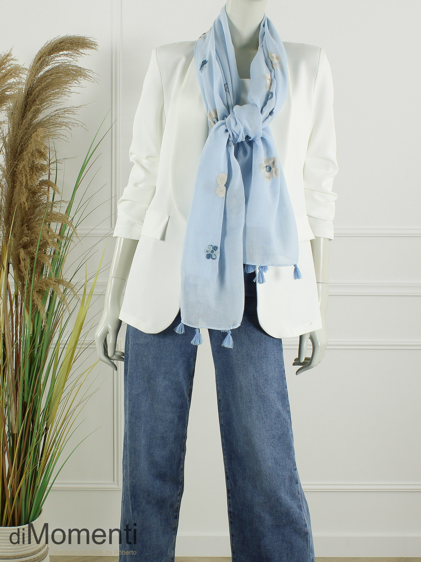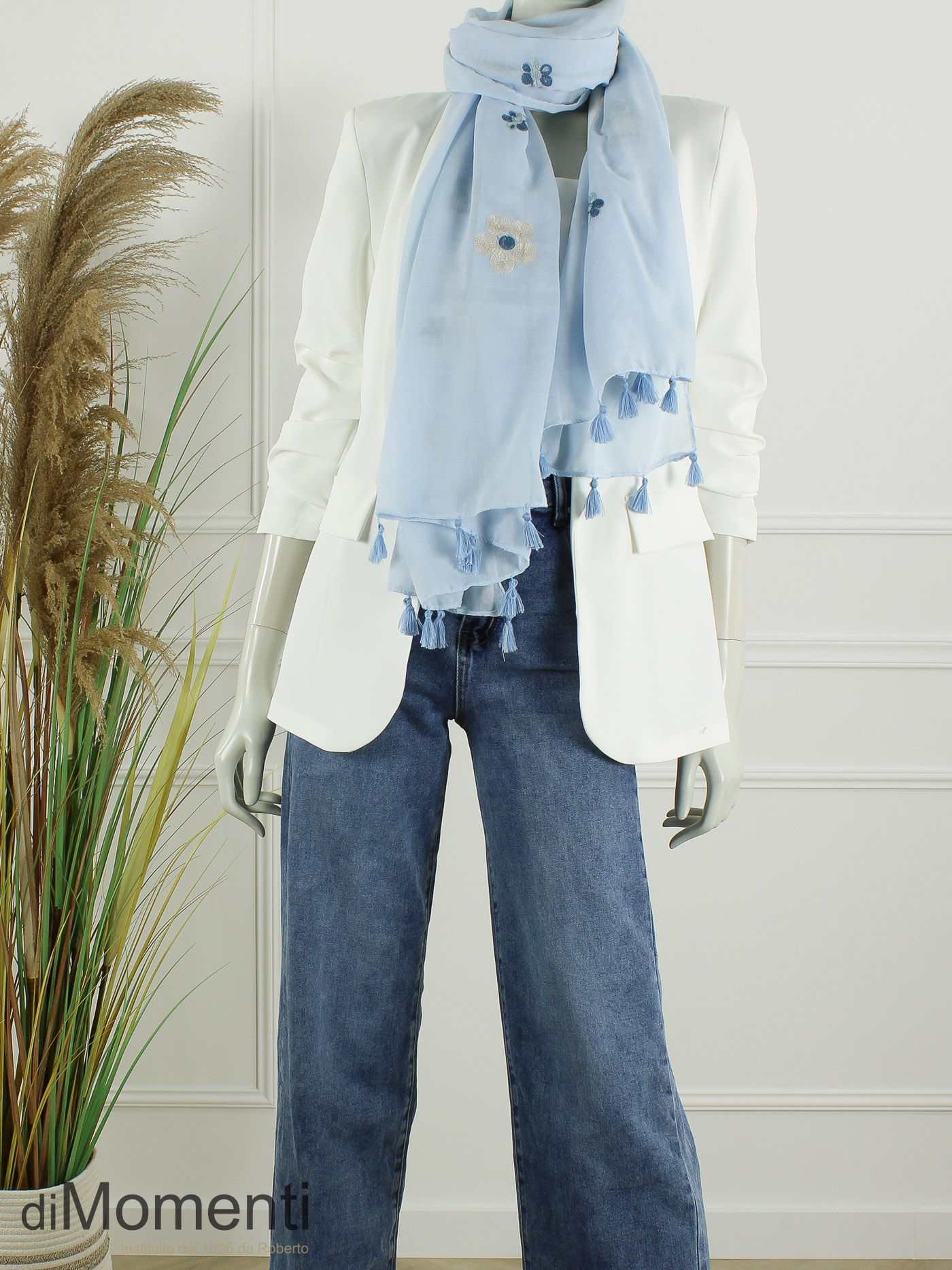 Pure luxe met deze royale, langwerpige sjaal. De zachte mix van viscose en katoen voelt heerlijk soepel aan, terwijl de prachtig geborduurde goudkleurige bloemen zorgen voor een romantische, exclusieve uitstraling. Een tijdloos statement-piece in frisse zomerse kleuren dat elke outfit direct transformeert tot een stijlvol geheel.