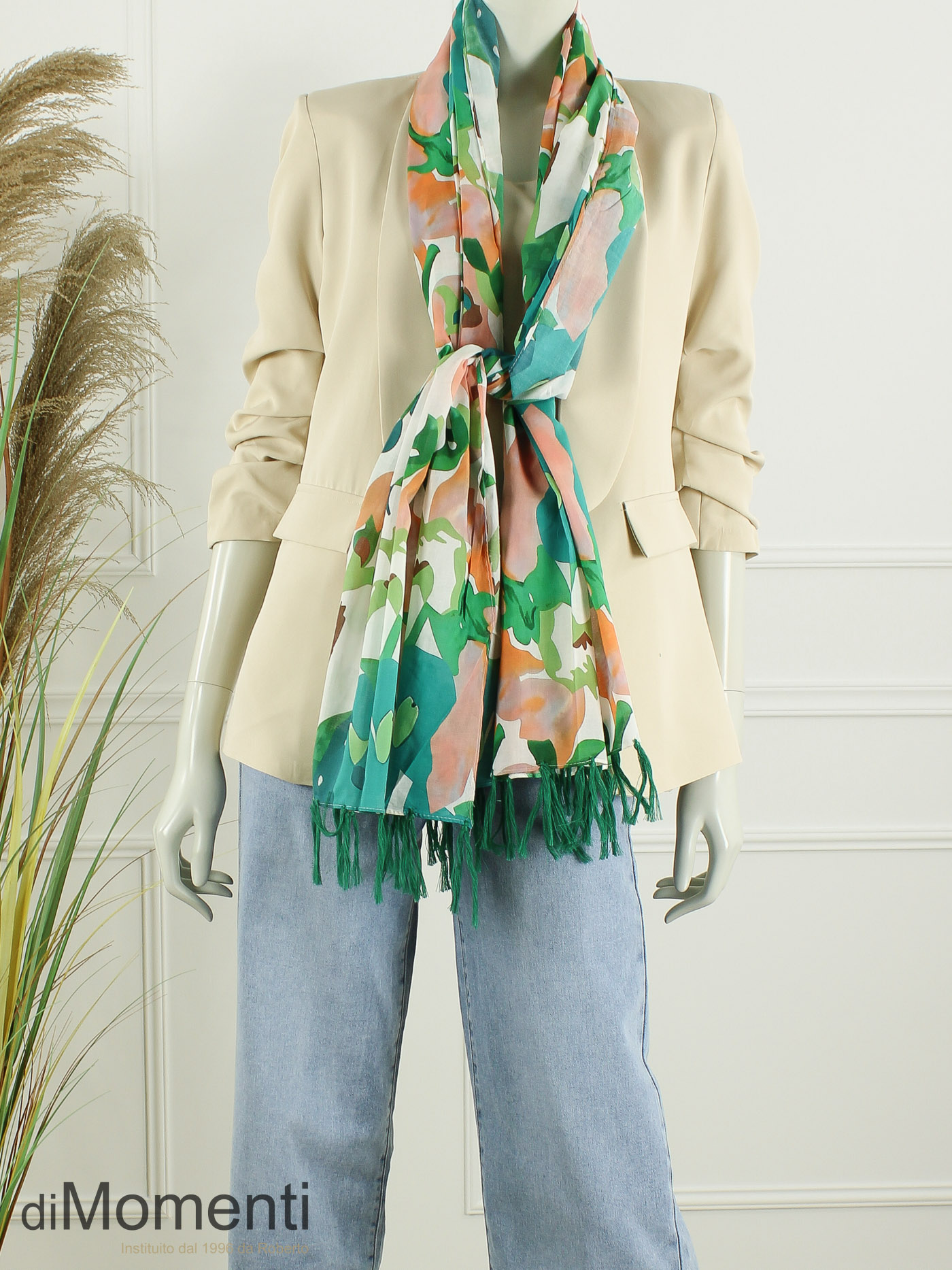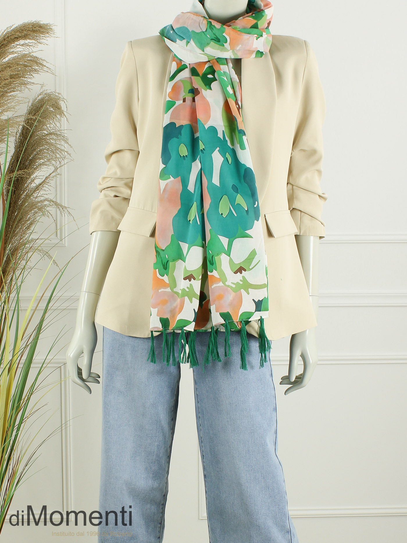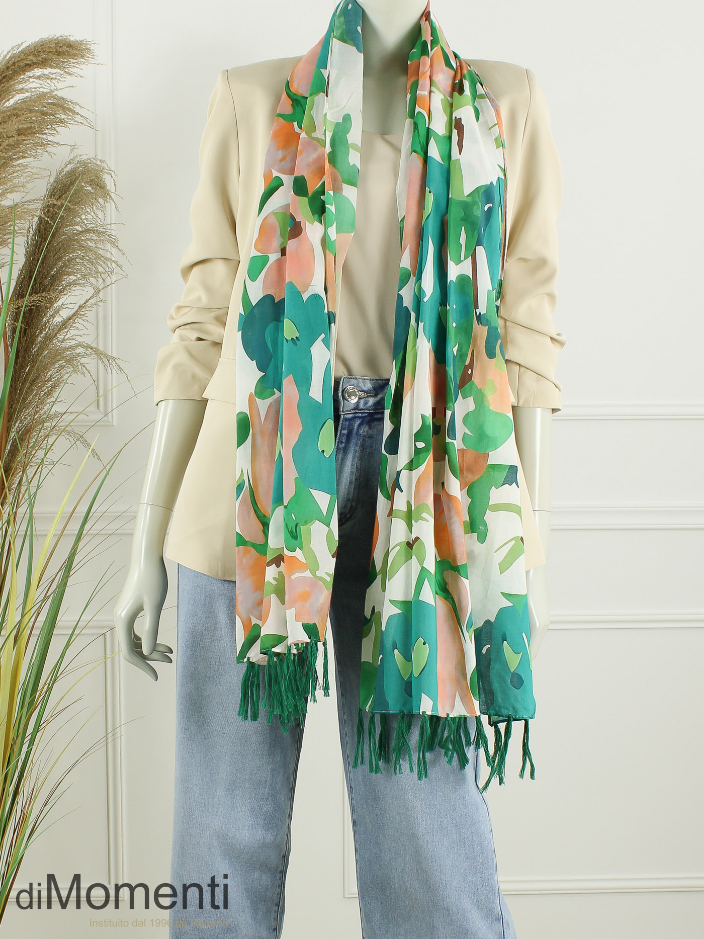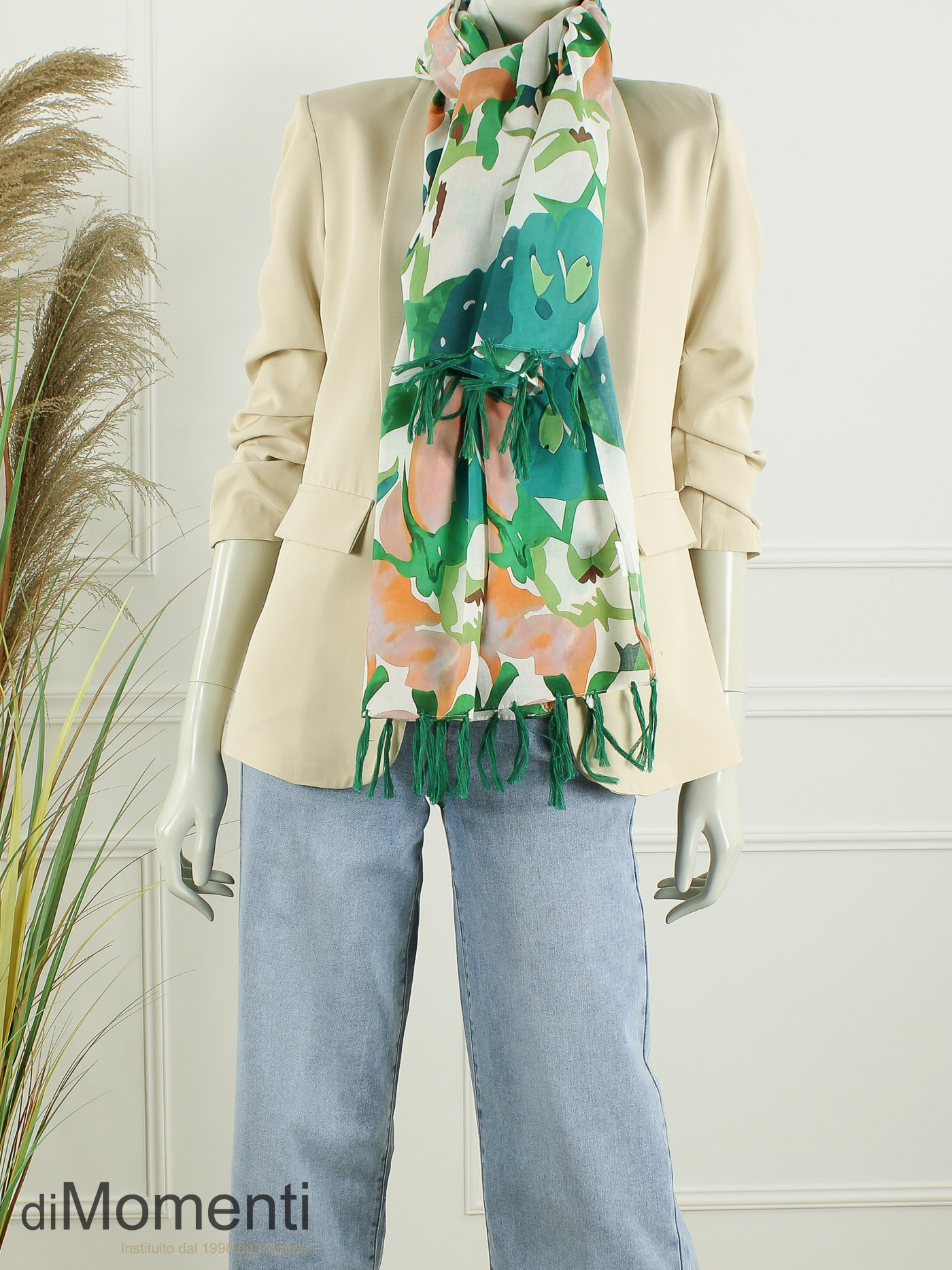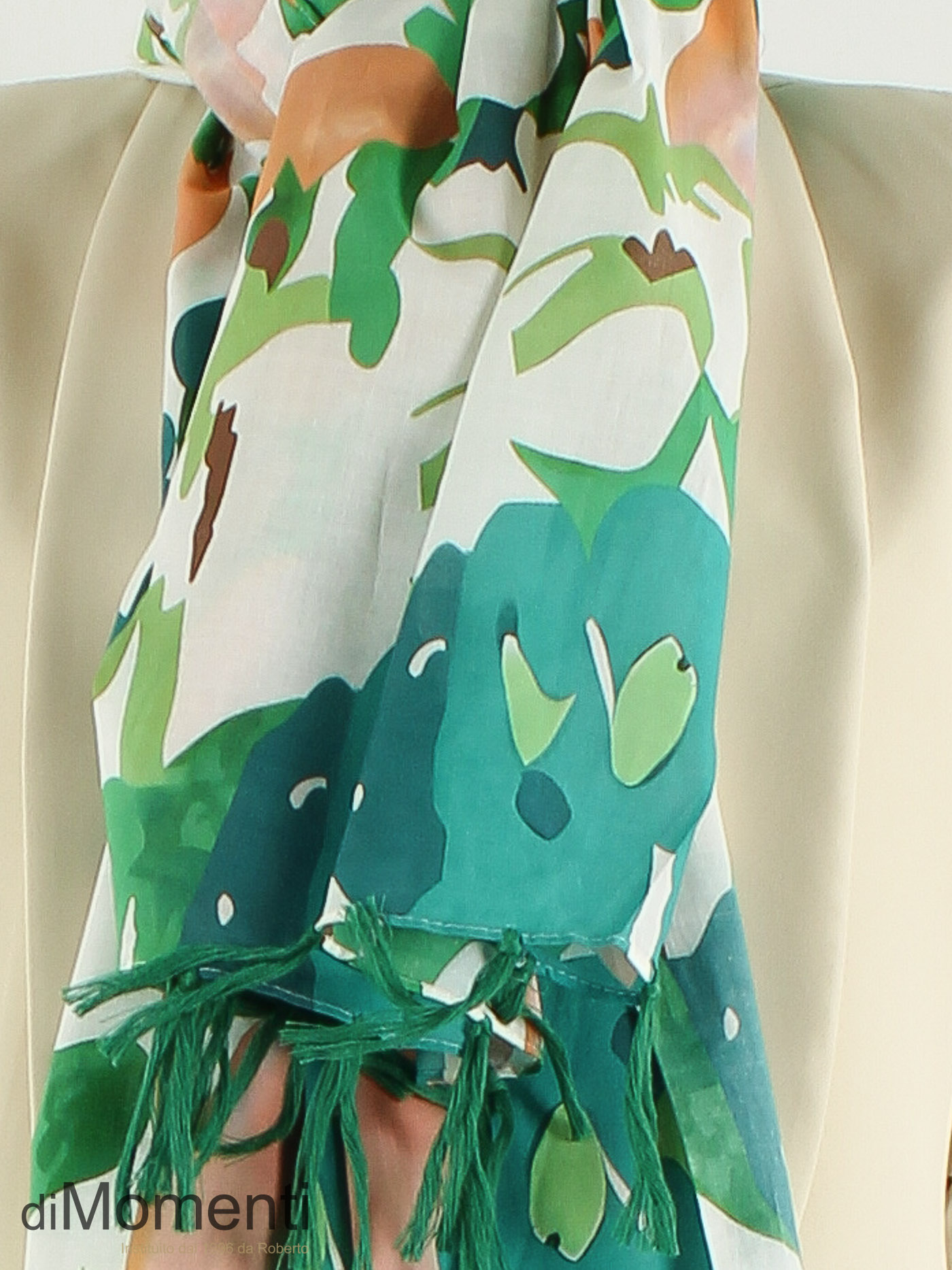 Royale langwerpige sjaal in 100% katoen met leuke franje rand aan beide zijde. De ideale accessoire voor klanten die houden van natuurlijke materialen en vrolijke dessins.