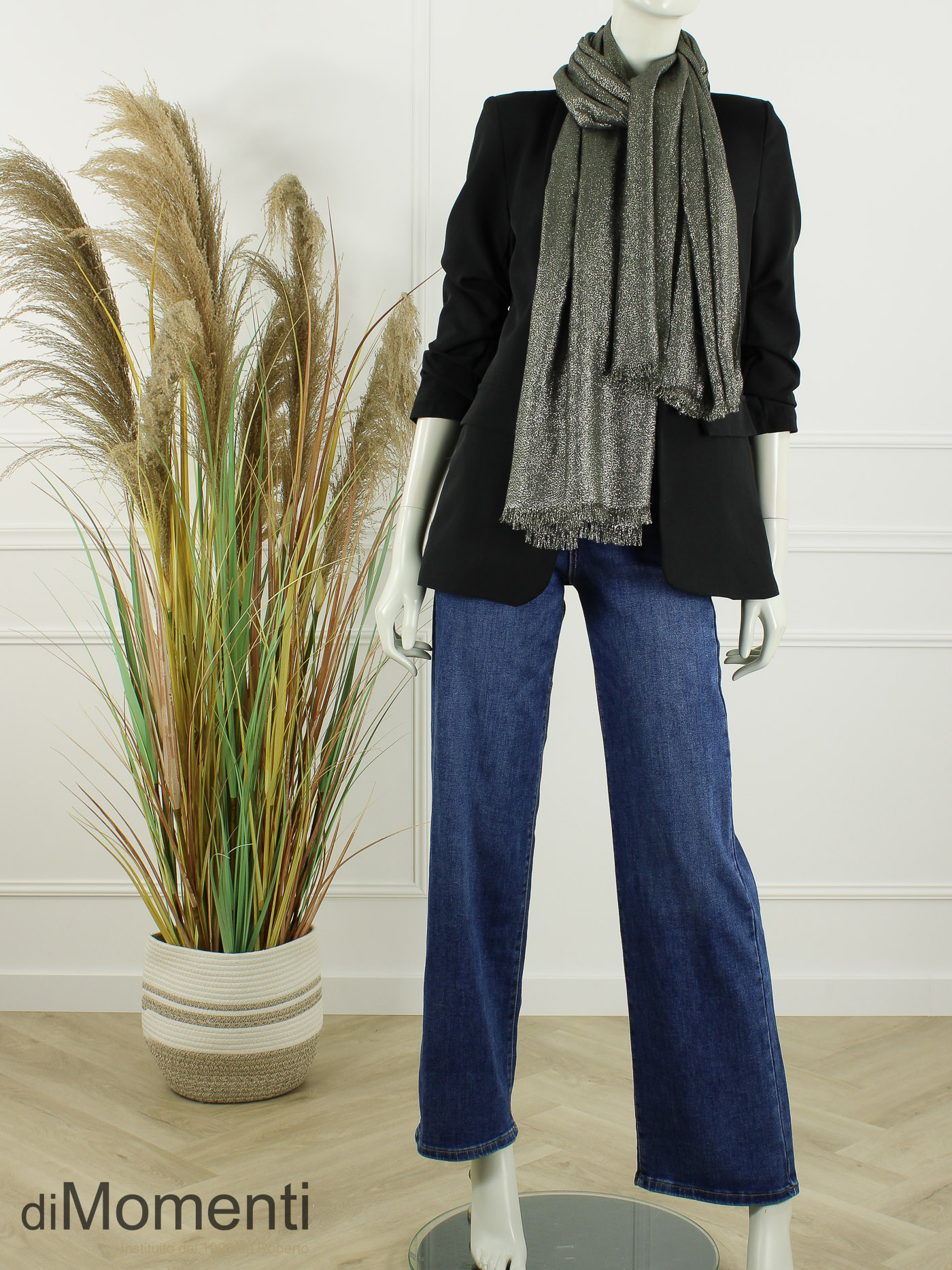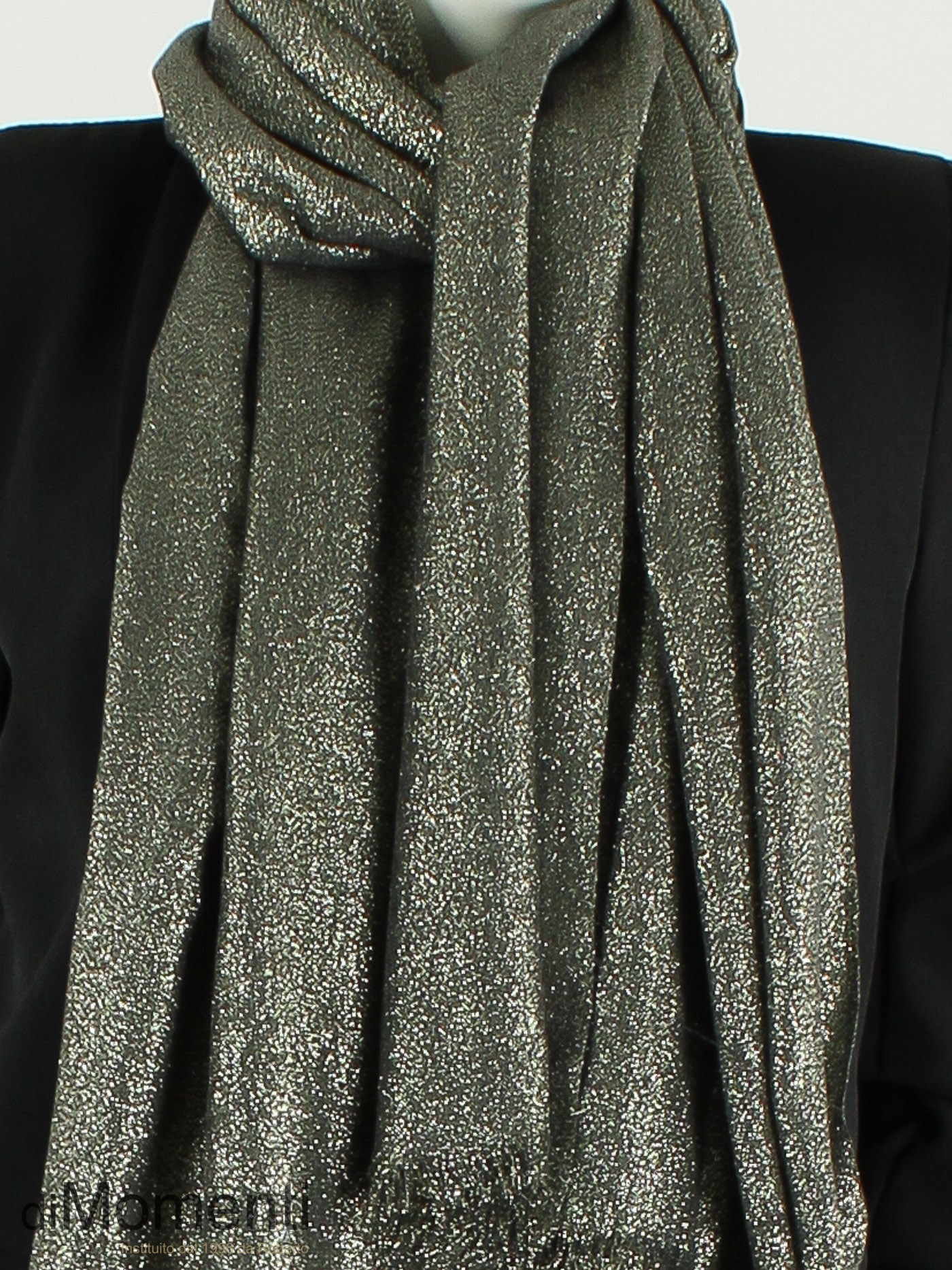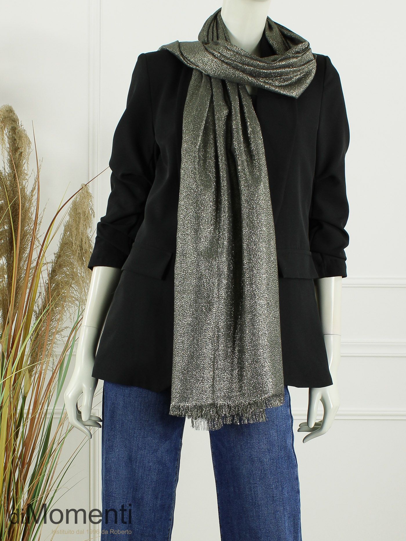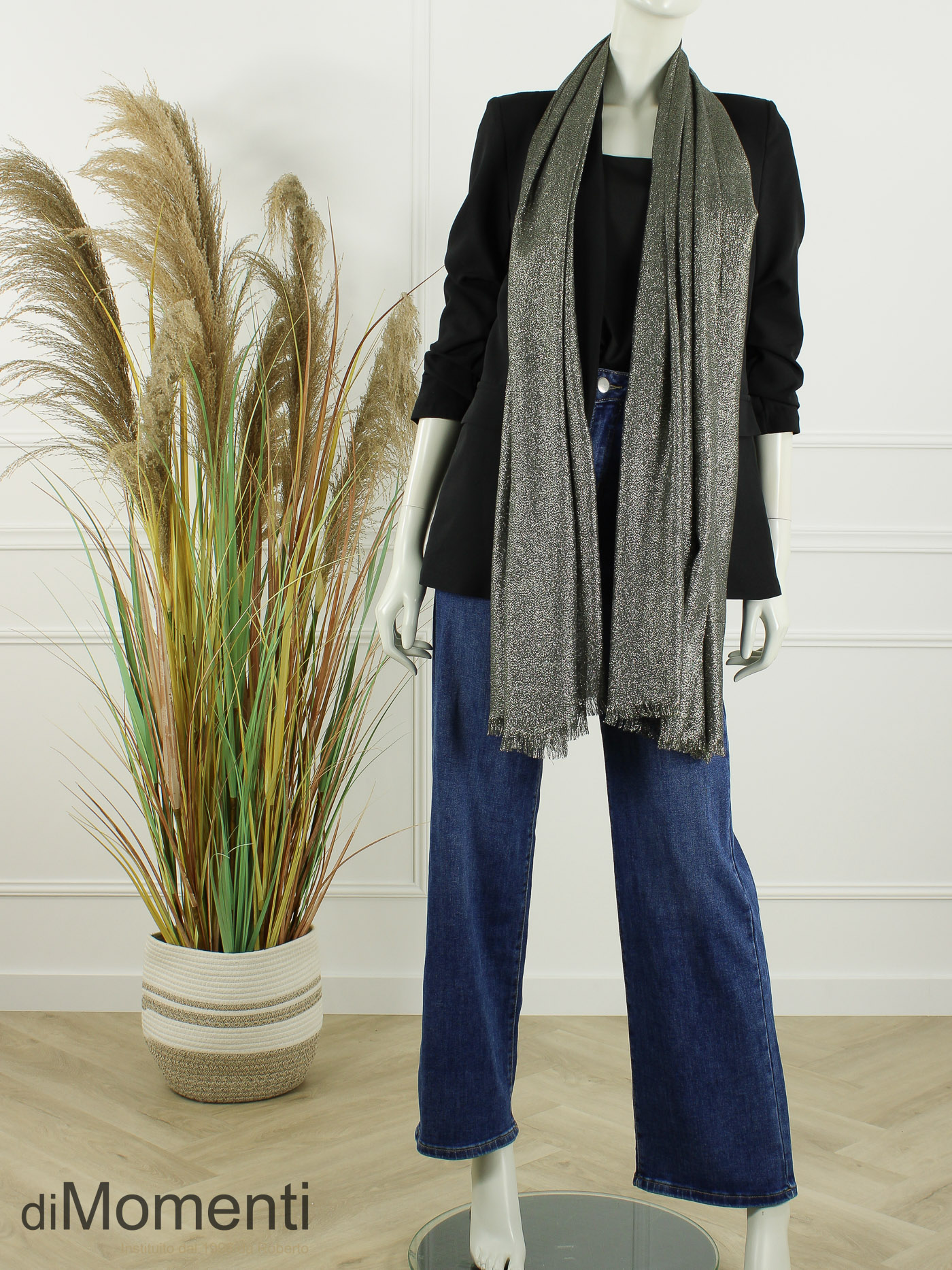Deze soepele sjaal is het perfecte accessoire voor de feestdagen! De luxe mix van tijdloos zwart en ecru is verrijkt met een subtiele goudkleurige lurex draad. Ideaal om elke stijlvolle outfit een feestelijke glans te geven.