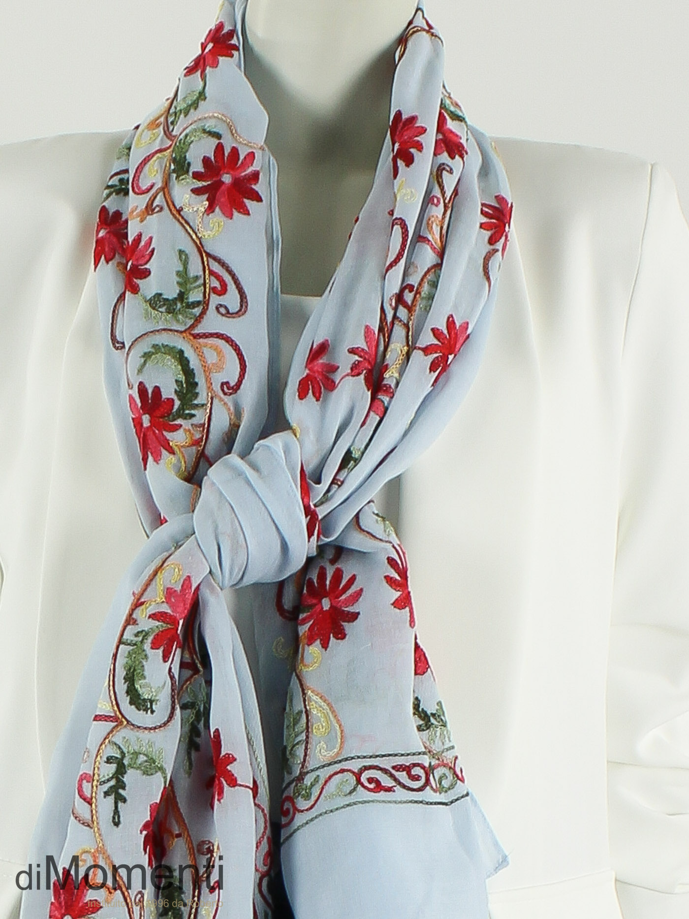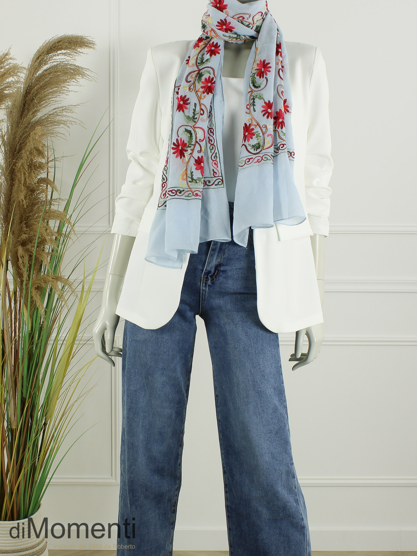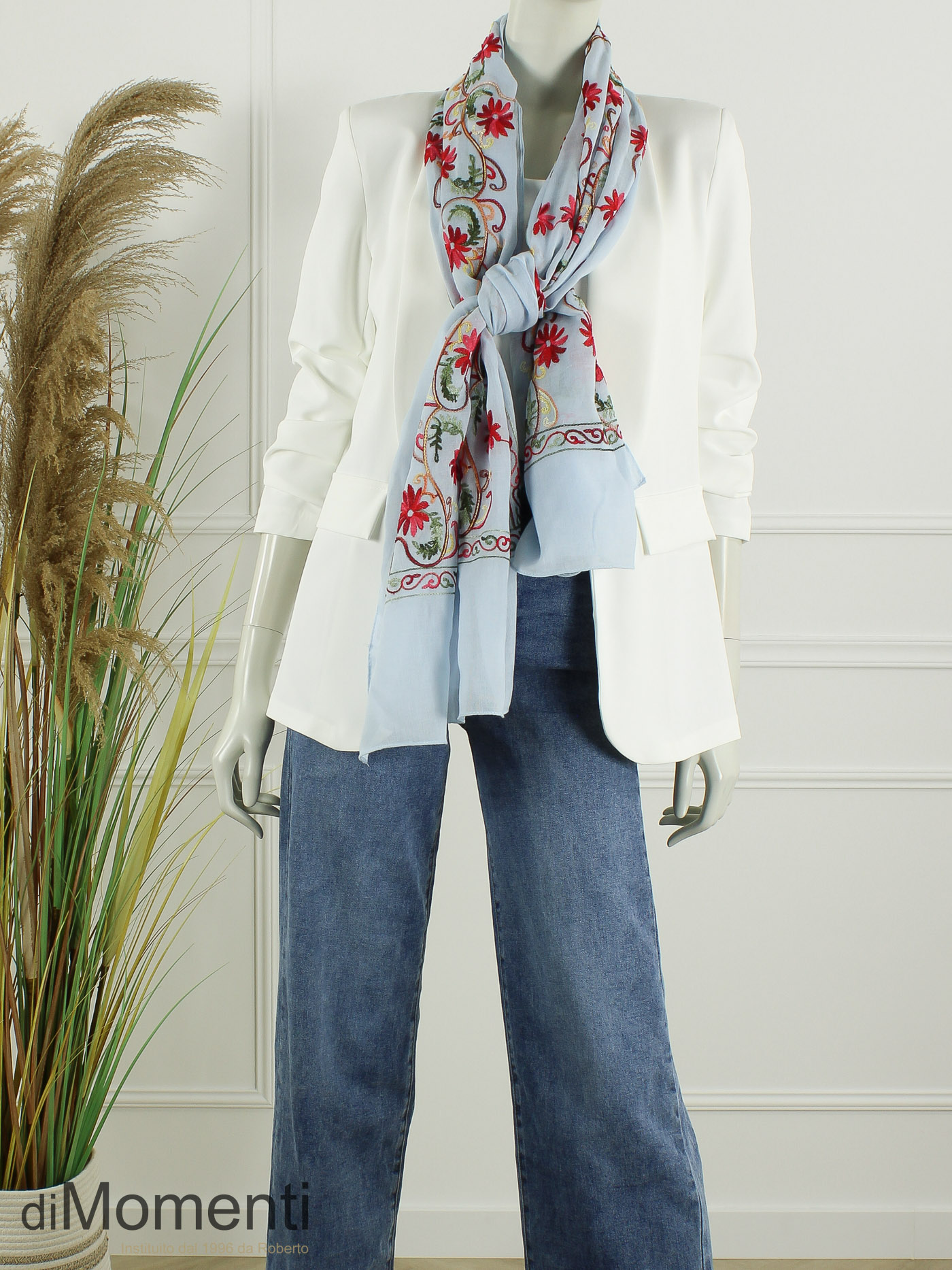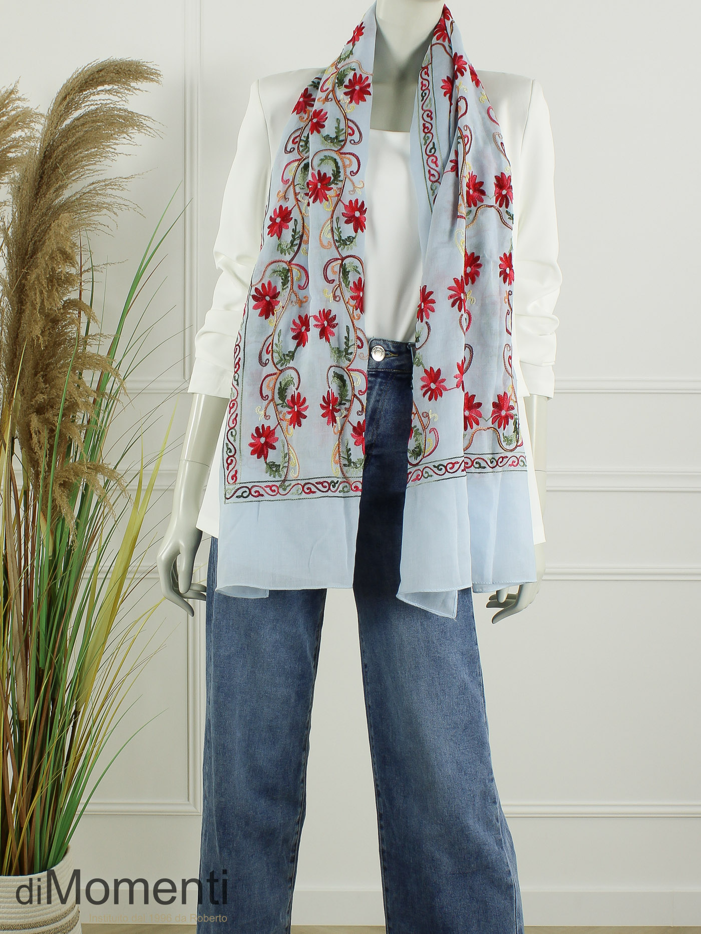 Pure luxe met deze royale, langwerpige sjaal. De zachte mix van viscose en katoen voelt heerlijk soepel aan, terwijl de prachtig geborduurde bloemen zorgen voor een romantische, exclusieve uitstraling. Een tijdloos statement-piece in frisse zomerse kleuren dat elke outfit direct transformeert tot een stijlvol geheel.