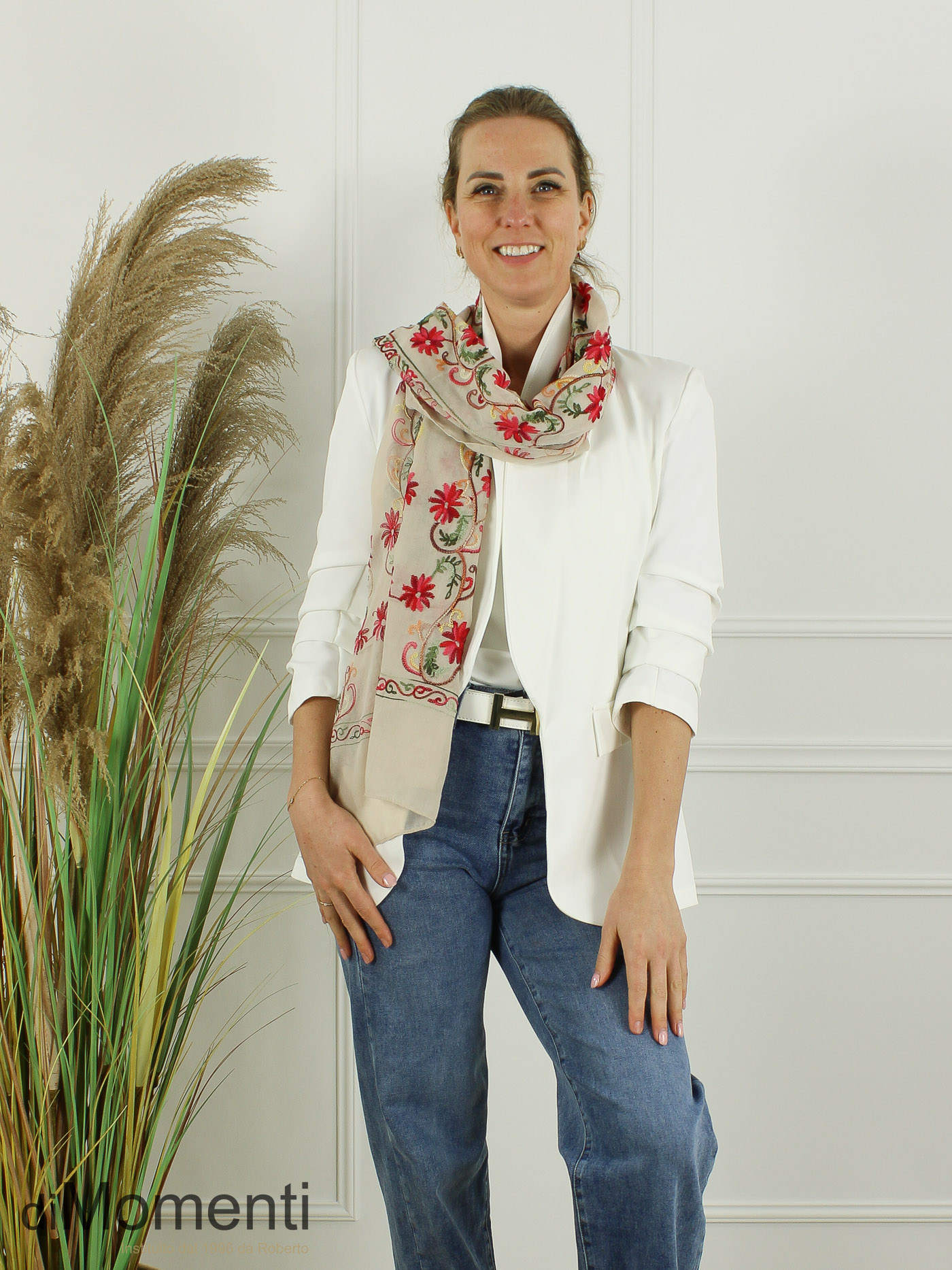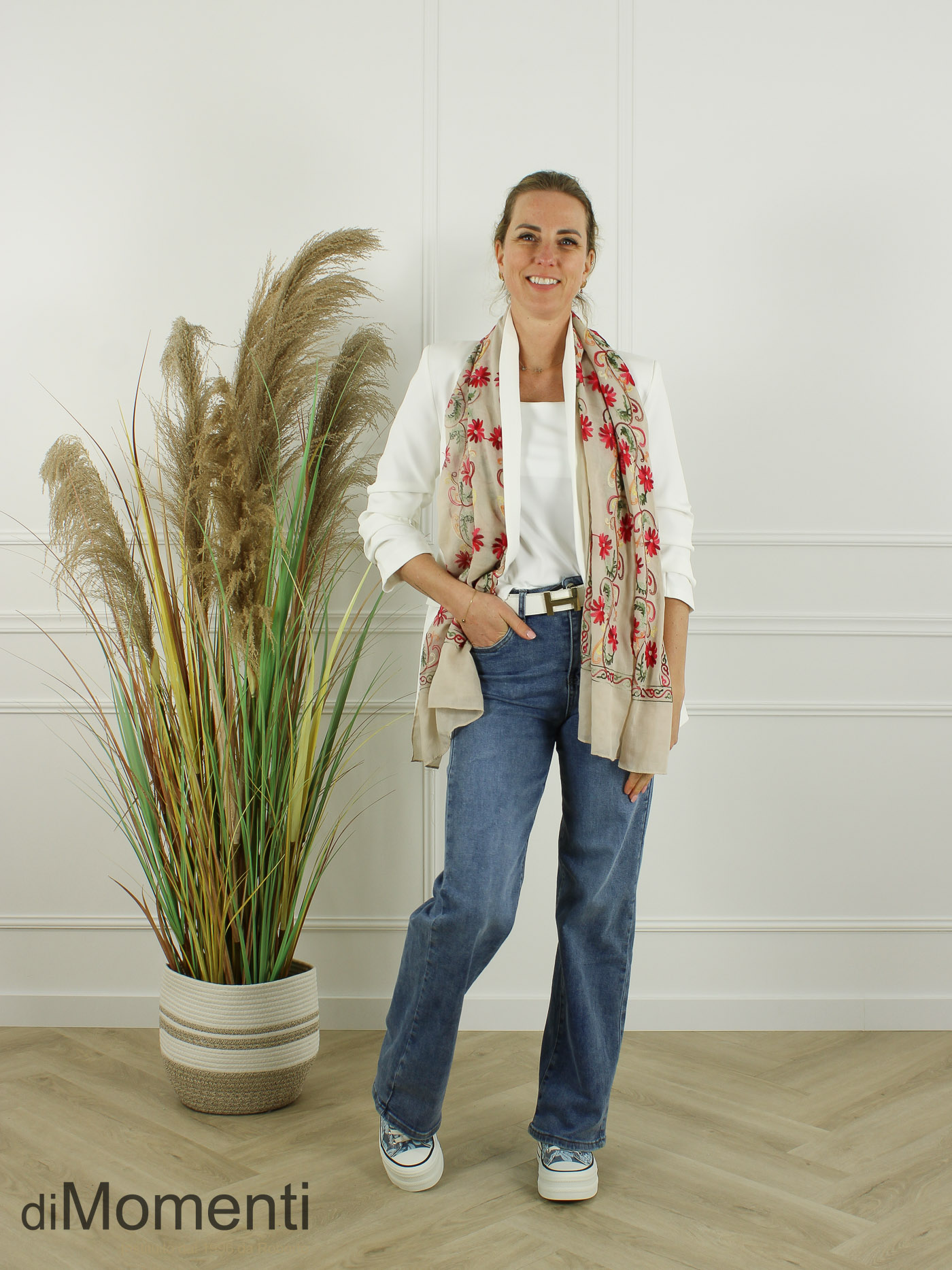 Pure luxe met deze royale, langwerpige sjaal. De zachte mix van viscose en katoen voelt heerlijk soepel aan, terwijl de prachtig geborduurde bloemen zorgen voor een romantische, exclusieve uitstraling. Een tijdloos statement-piece in frisse zomerse kleuren dat elke outfit direct transformeert tot een stijlvol geheel.