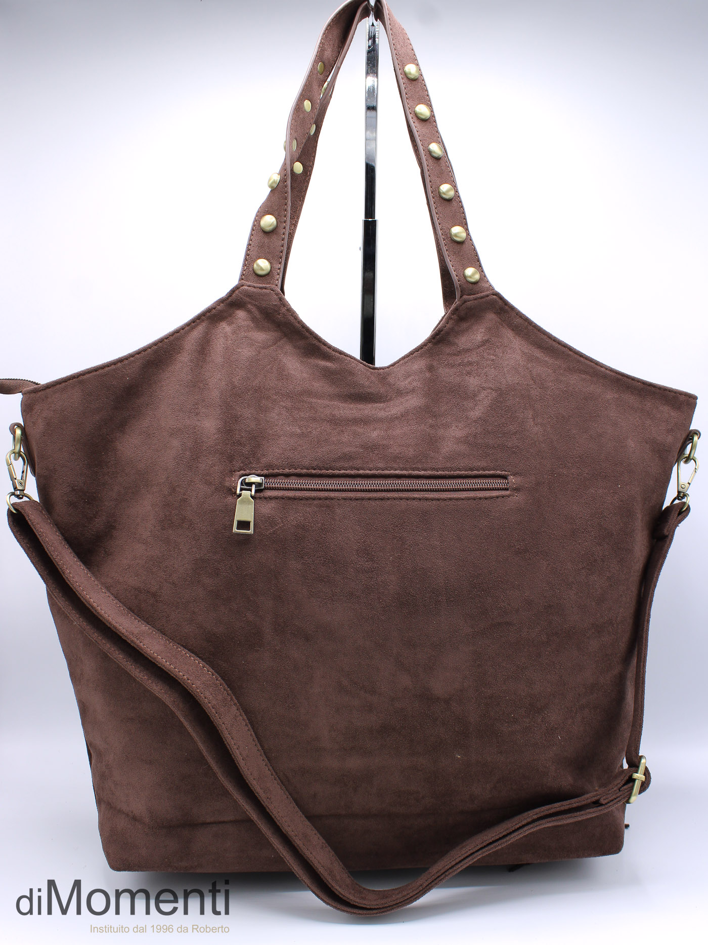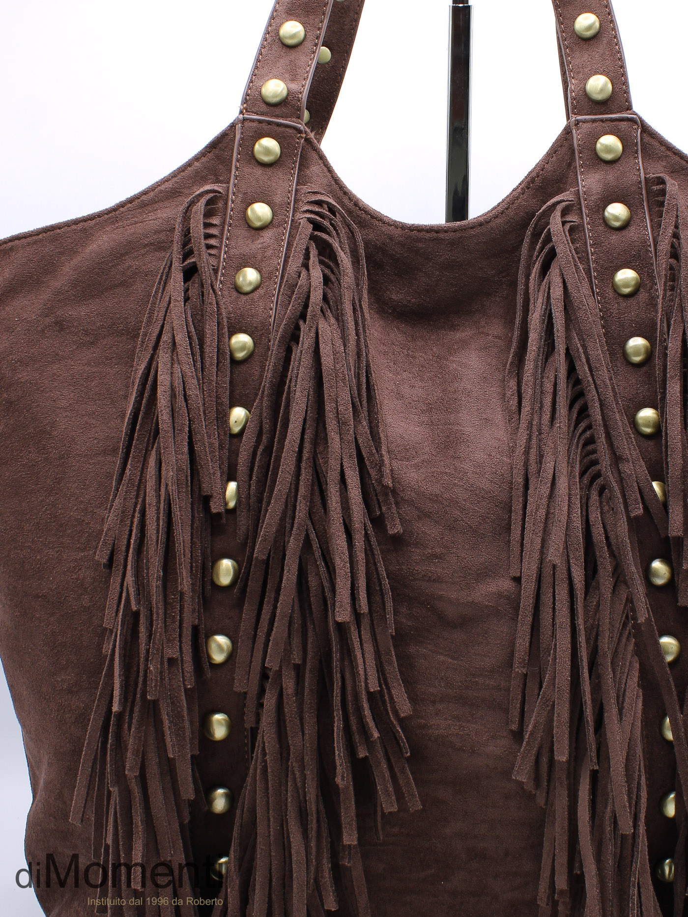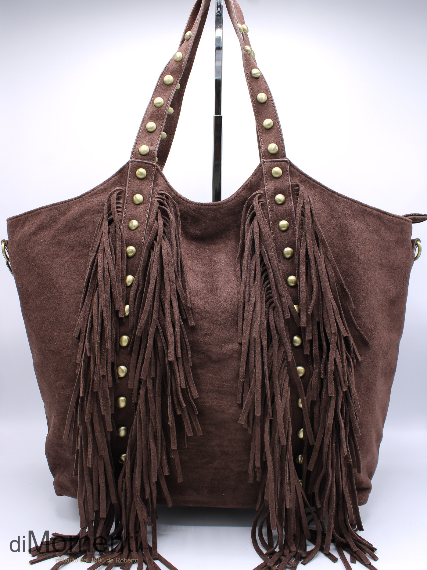 Deze royale suèdinelook schoudertas is de trend van nu! Voorzien van een trendy franje- en studrand. De tas is gevoerd, heeft een afsluitbaar binnen vak en wordt geleverd met een losse, verstelbare schouderriem. Nu in prachtige nieuwe aardetinten! Een must-have accessoire.