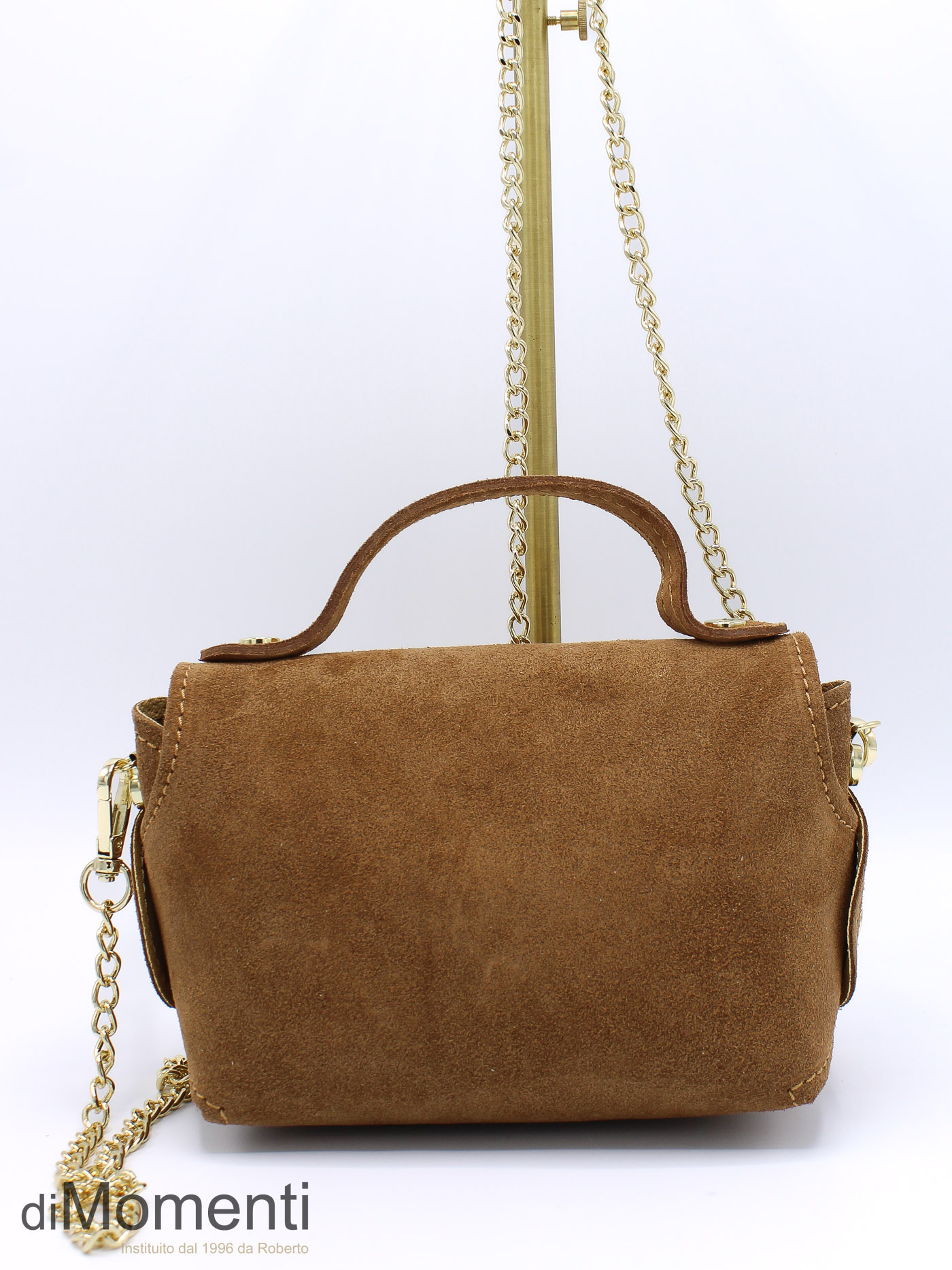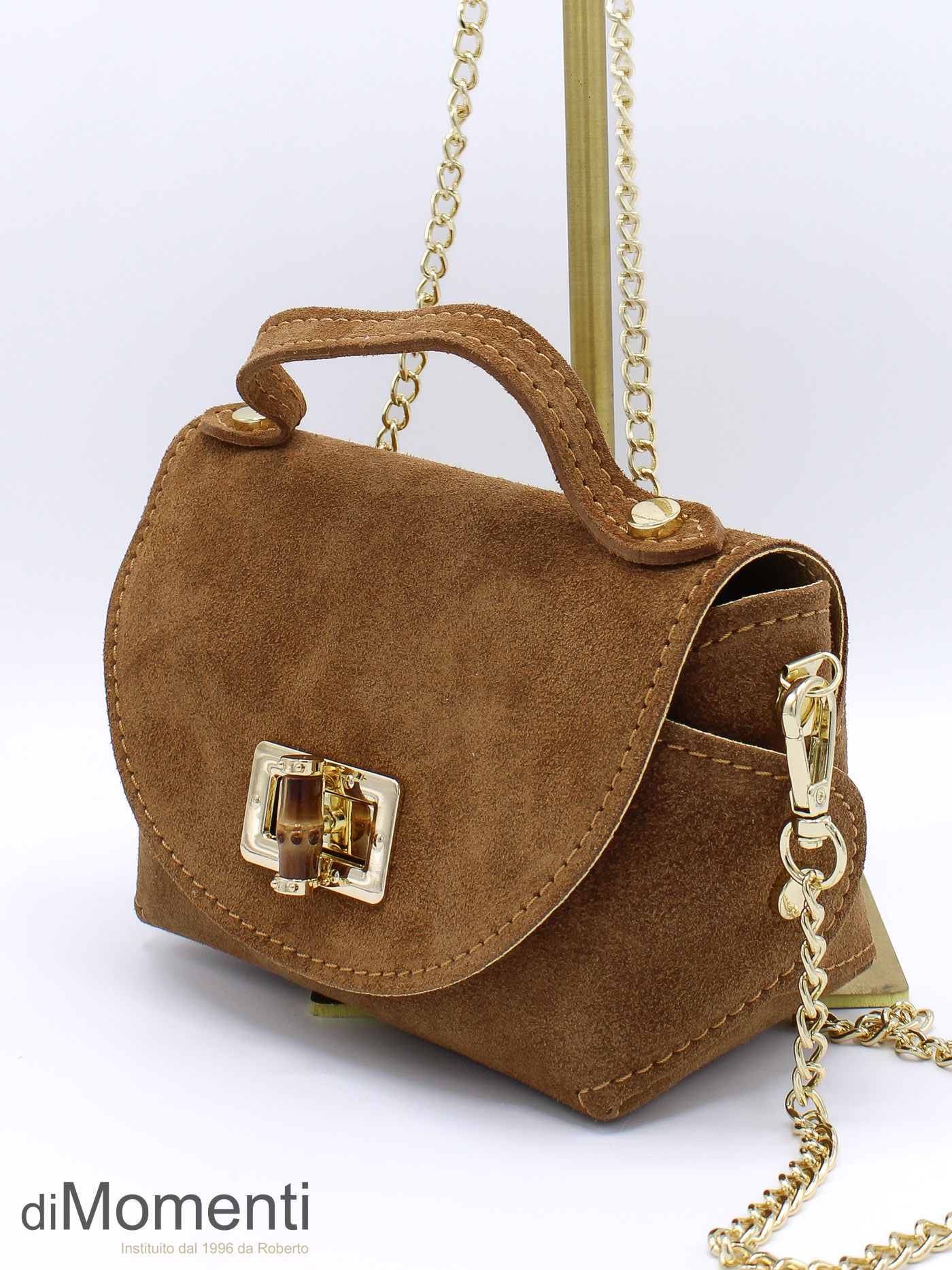 Dit tasje van echt suède ademt pure elegantie. De combinatie van het zachte materiaal met de goudkleurige schakelketting en de unieke bamboe-look draaisluiting maakt dit een echt statement piece. Compact, chic en perfect voor zowel een avondje uit als een stijlvolle citytrip.