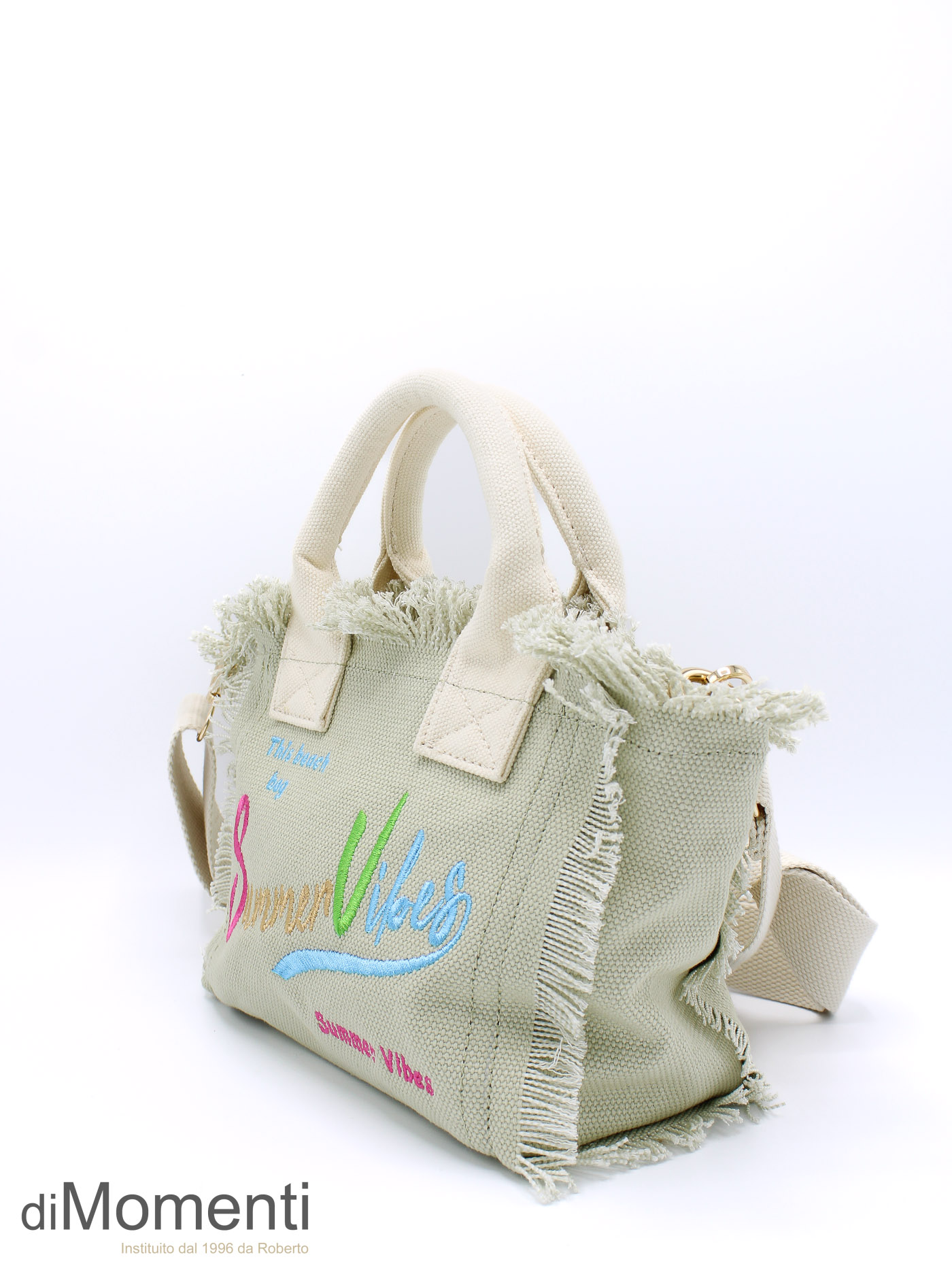 Nieuw is deze zomerfavoriet in ibiza style: dit schattige katoenen handtasje met speelse franjes en hippe contrastkleuren. De geborduurde tekst “Summer Vibes” in vrolijke kleuren geeft een unieke touch. Veilig afsluitbaar met rits en inclusief handige, afneembare schouderriem.