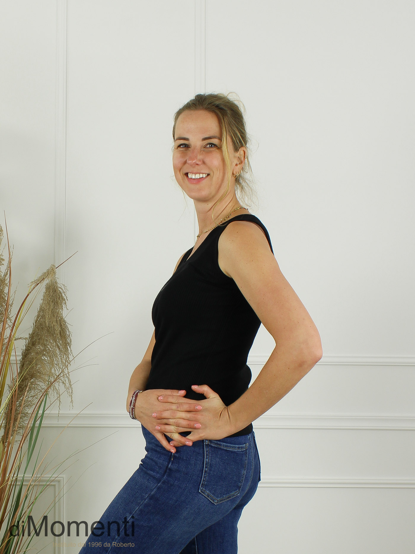 De perfecte combinatie van comfort en elegantie. Deze geribbelde top, verrijkt met een prachtige strass applicatie is gemaakt van een soepele viscose mix. De stof met veel stretch zorgt ervoor dat de top geschikt is voor een breed scala aan maten. Een tijdloze toevoeging aan elke collectie.