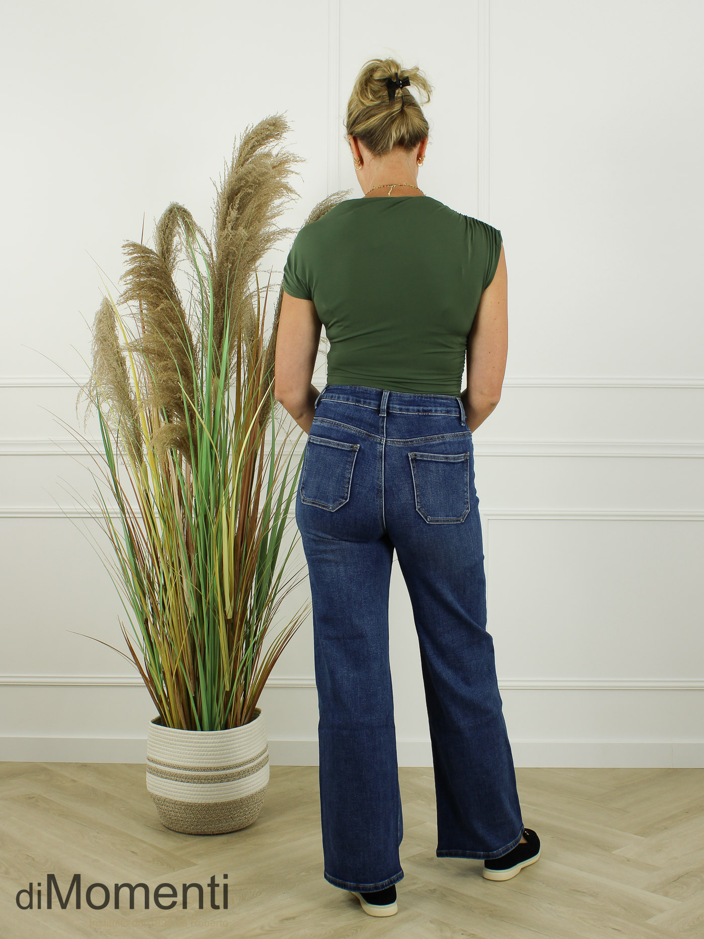 Trendy getailleerde top met goudkleurig detail op de schouder. Deze jonge top kan off shoulder gedragen worden. Dit model heeft veel stretch.
