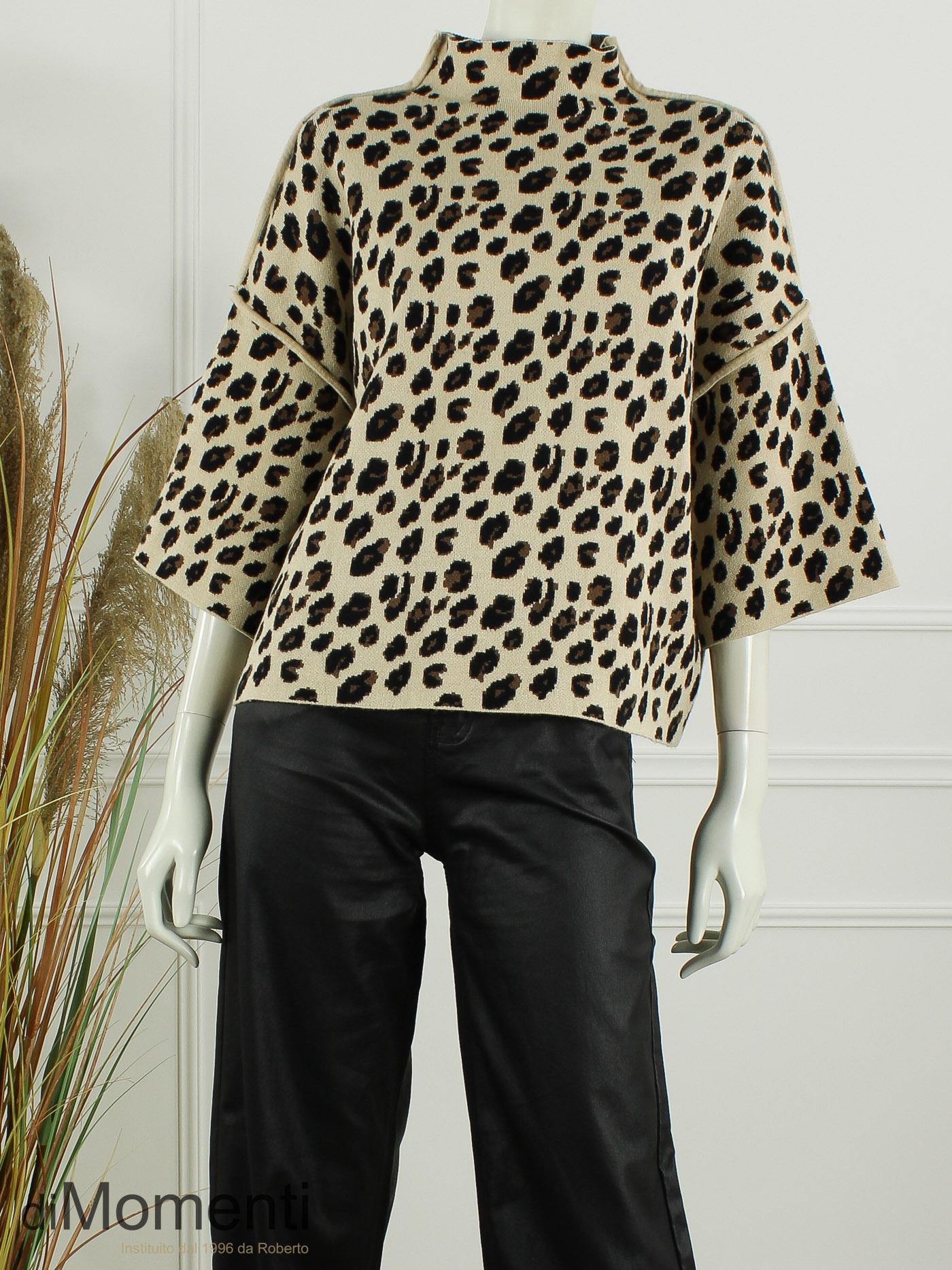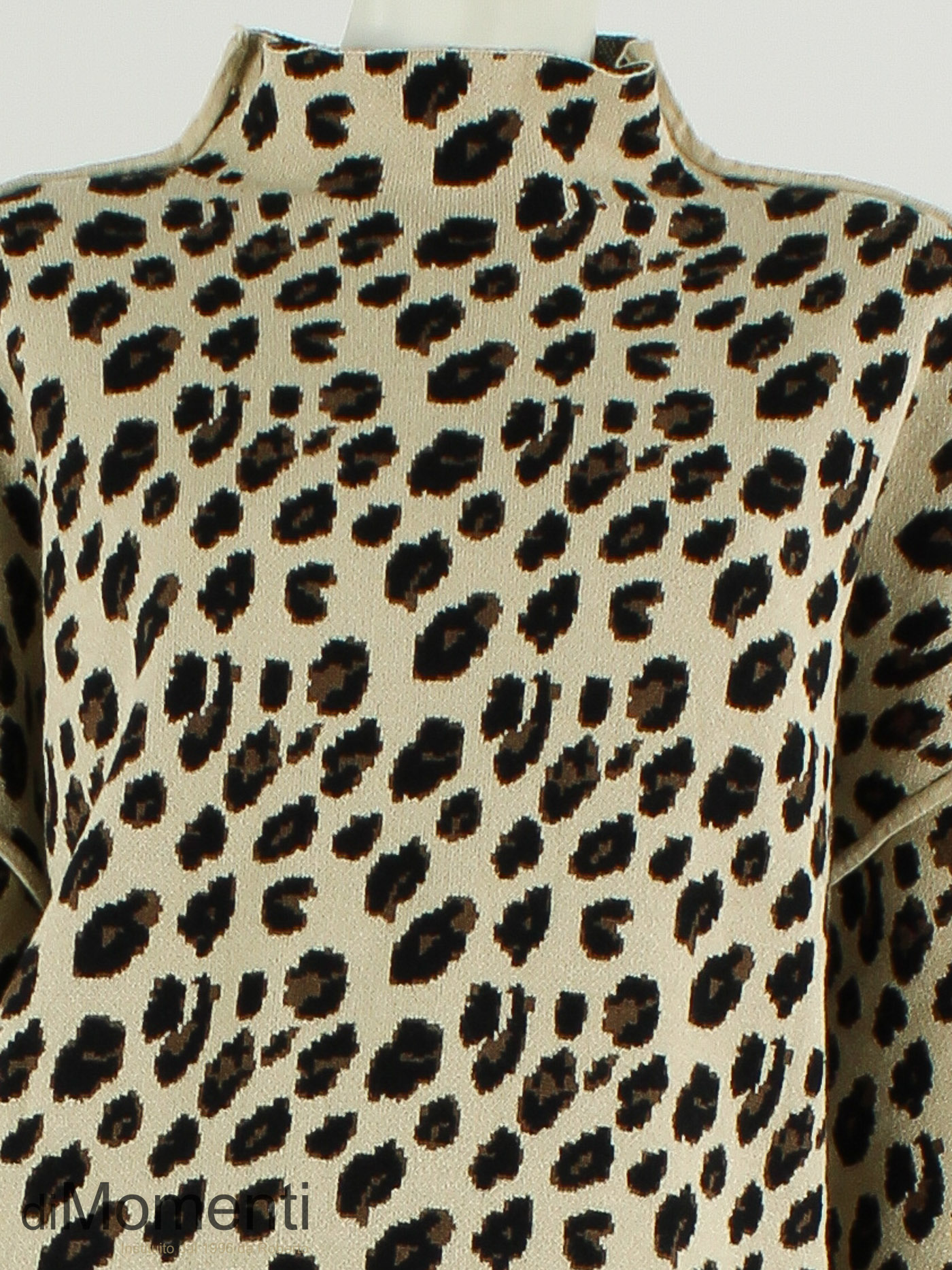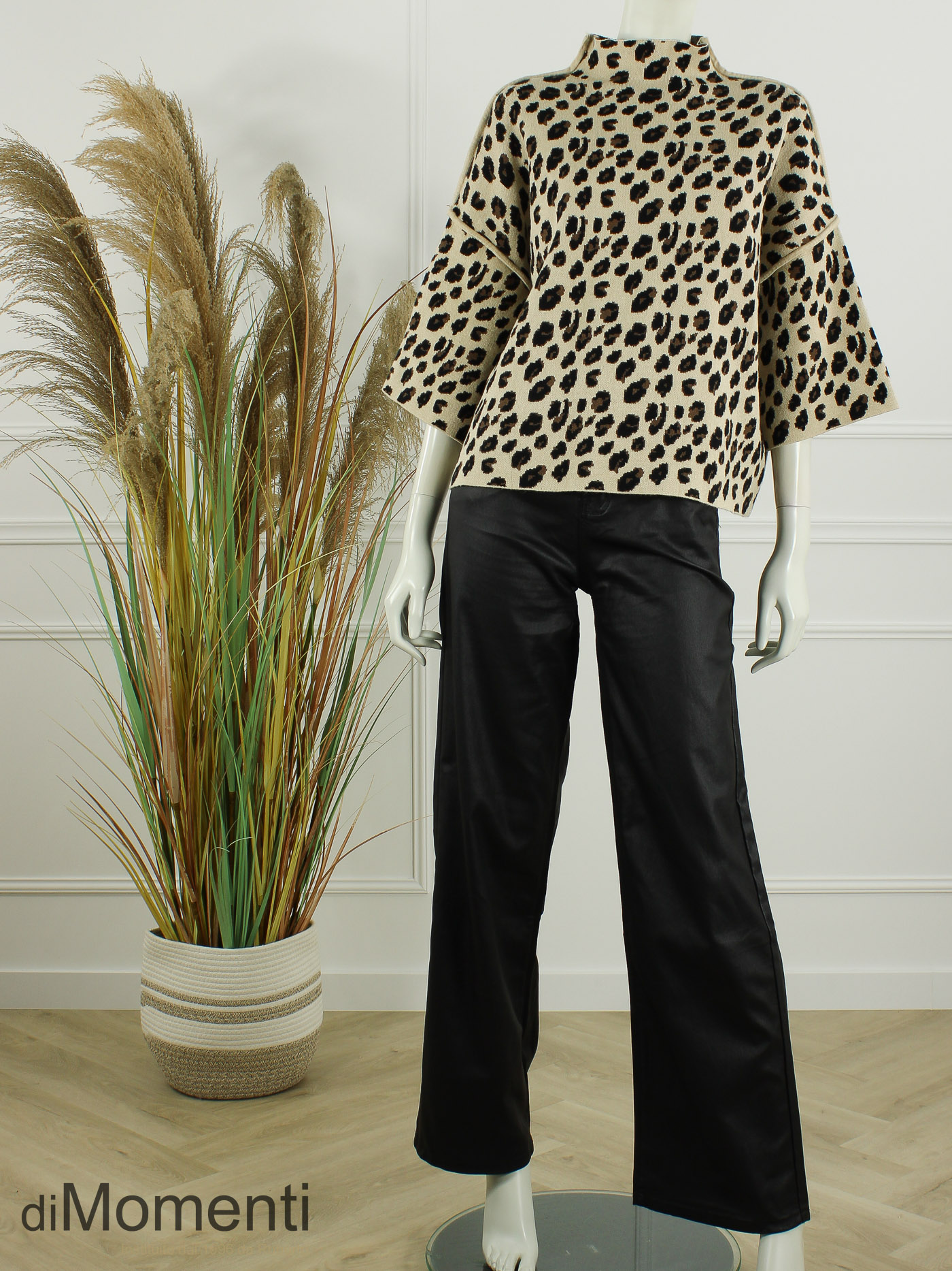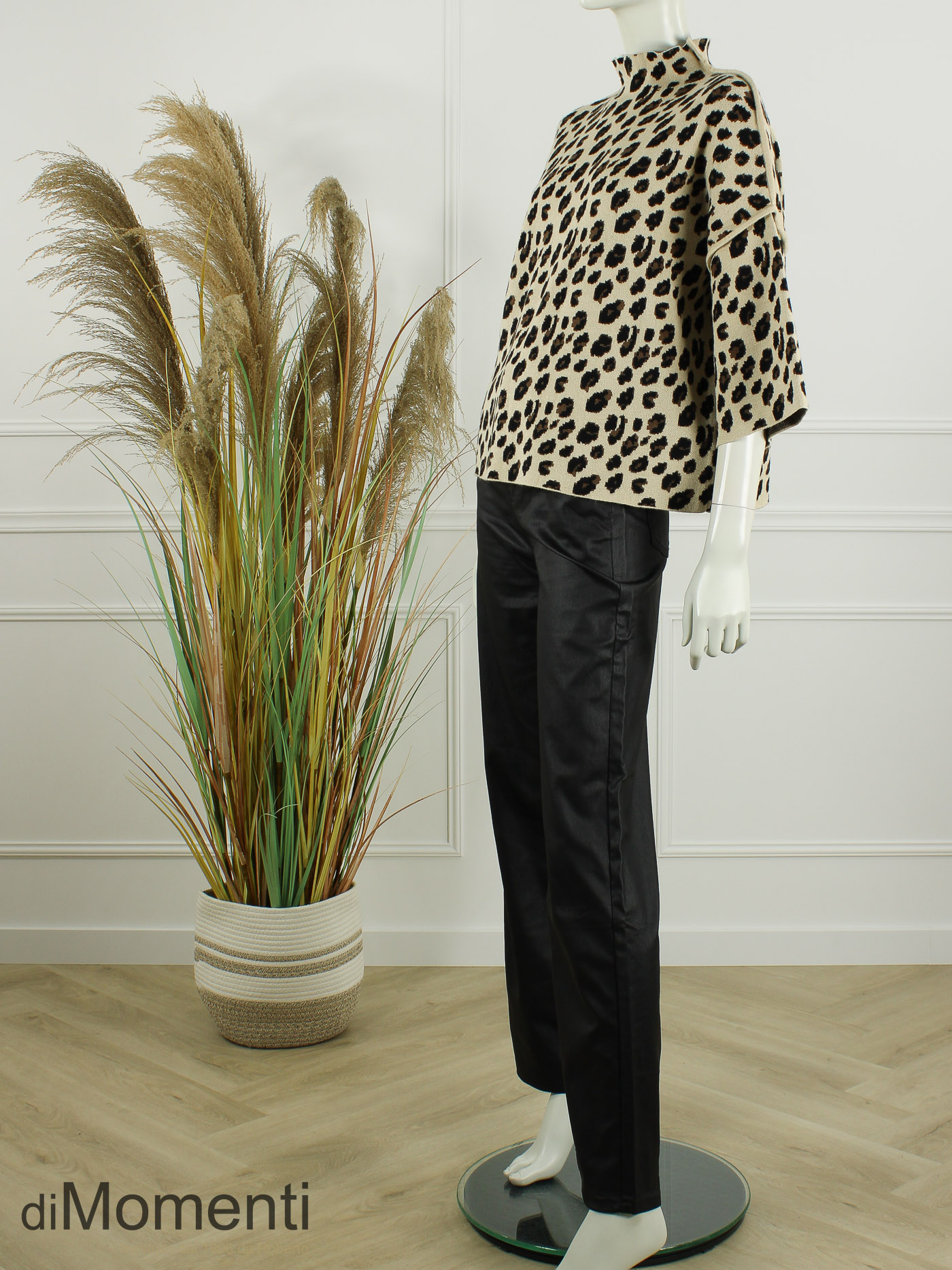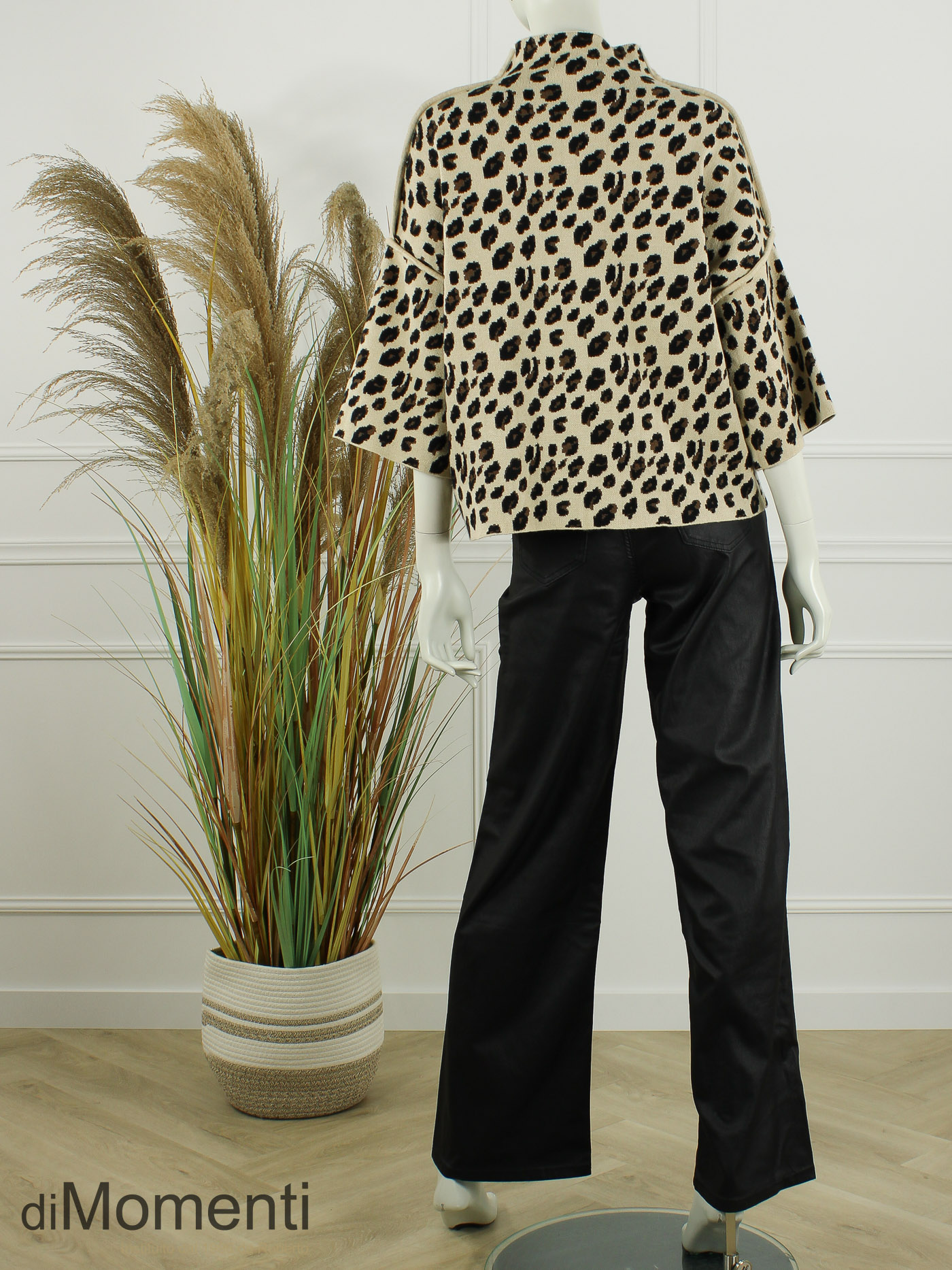 Deze gebreide top met turtle hals is de trend van 2025! Het korte model met ¾ mouw combineert perfect met een high waist broek. Uitgevoerd in een trendy beige tint met een subtiele animal print. Een stijlvolle must-have dit seizoen.