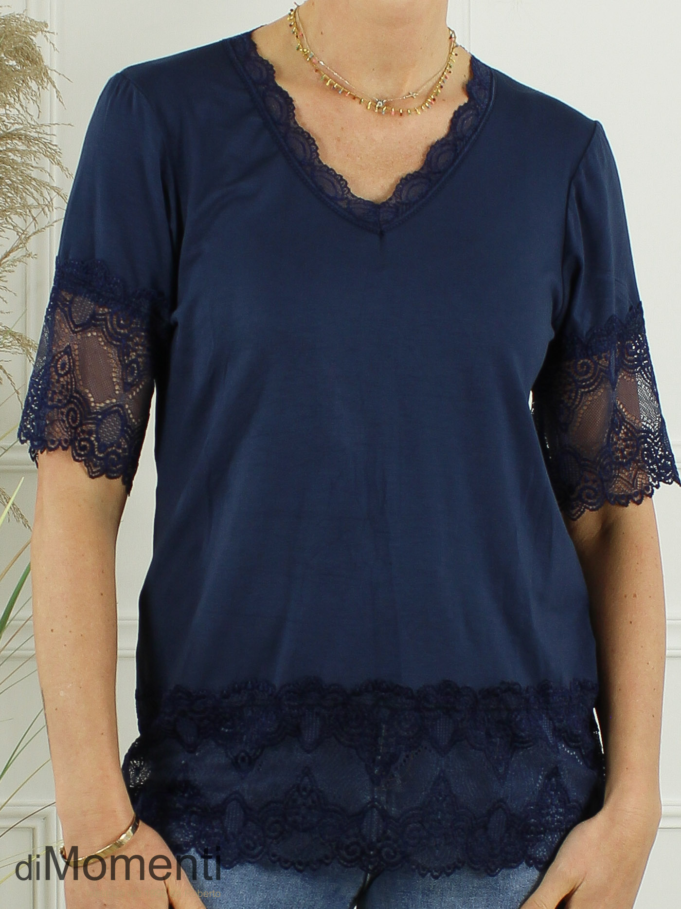Deze hoogwaardige tricot top met stretch is de ideale layering-piece. Voorzien van een elegante V-hals en mouwtje met kant. Met een lengte van 70 cm en een prachtige kanten bies (15 cm) onderaan, is dit item perfect onder een blazer.