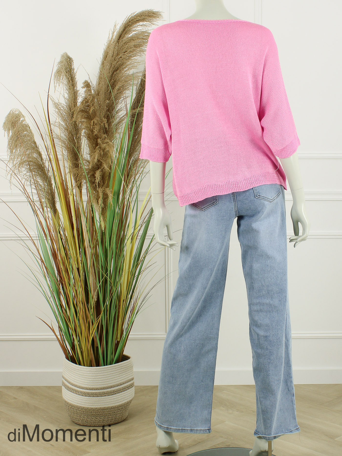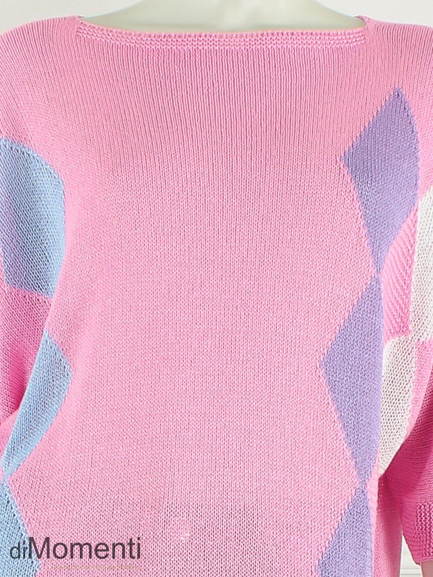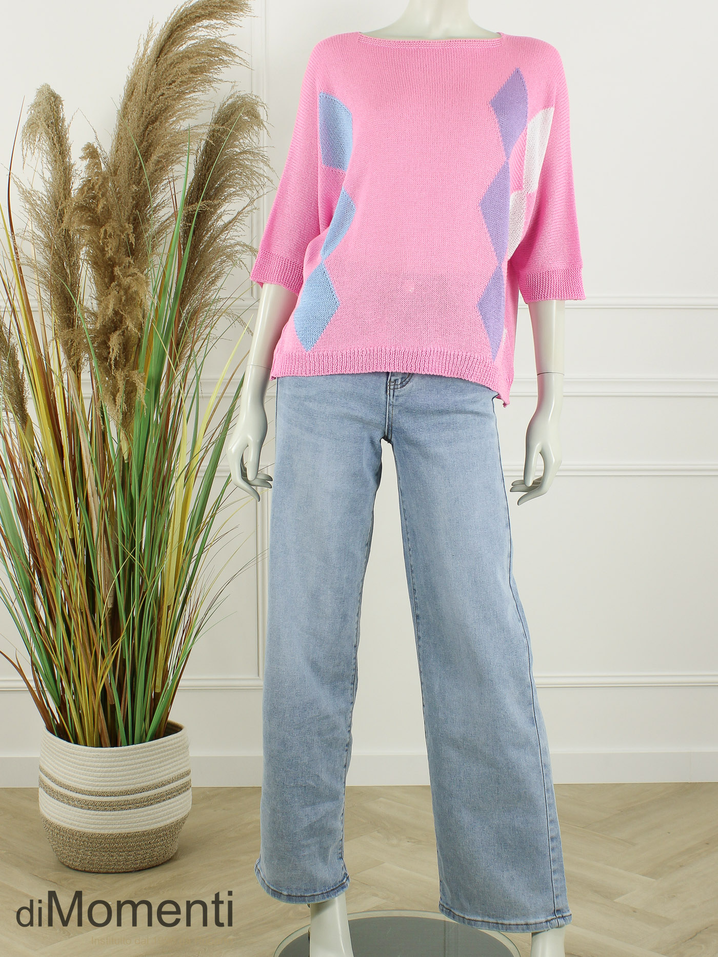 Nieuw is deze fijn gebreide top met een romantische touch. Uitgevoerd in een glansgaren met een verfijnd vlakverdeling in voorjaarskleuren. Deze ruimvallende top heeft een mooie boothals en een driekwart mouw.