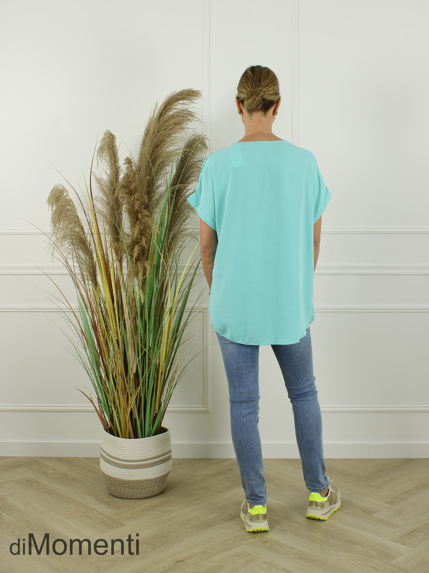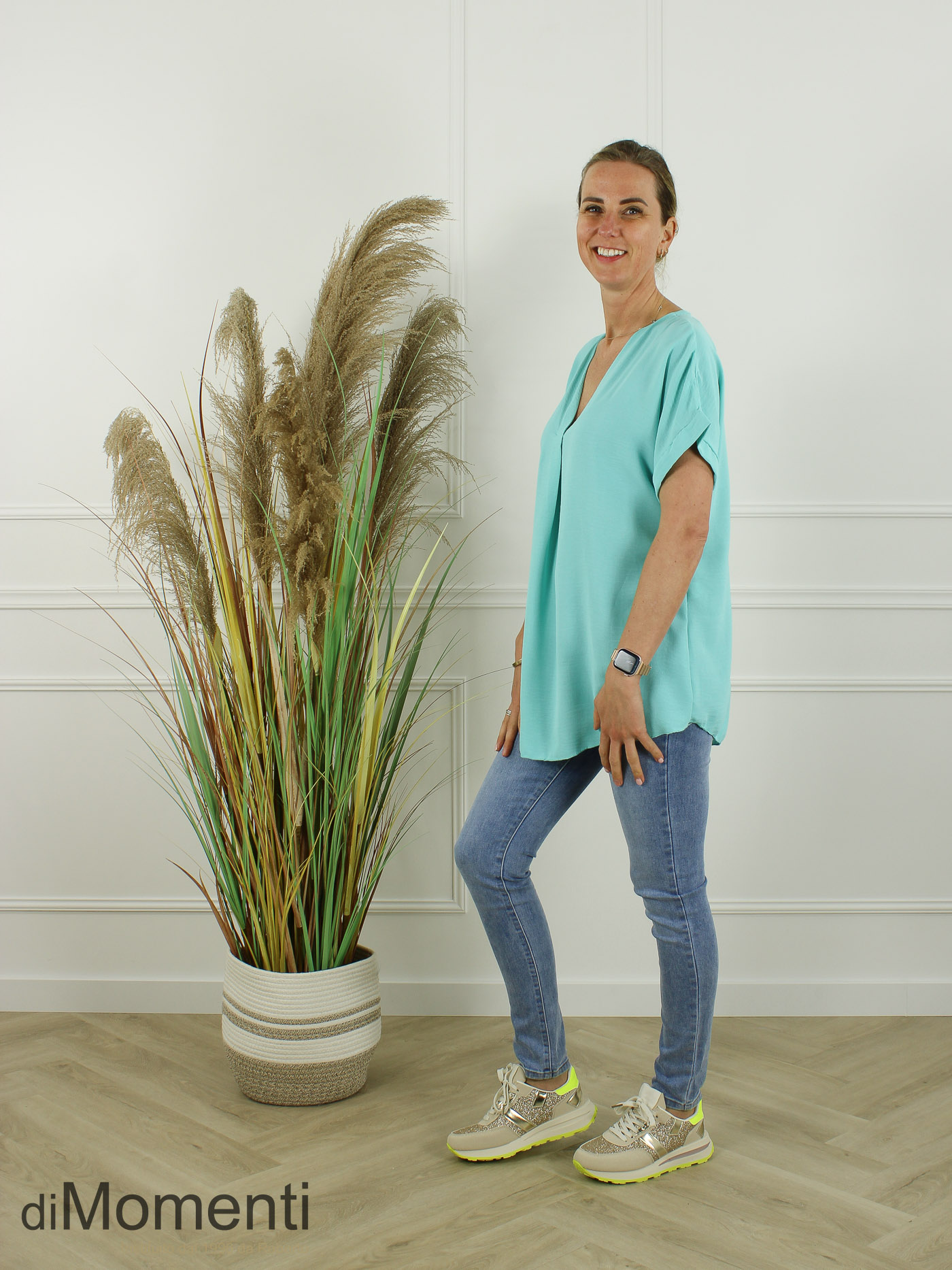 Stijlvol en luchtig de zomer door! Deze ruimvallende, lange top met een elegante plooi aan de voorzijde en mooie V-hals heeft een vrouwelijke uitstraling. De fijne viscose mix draagt heerlijk koel en comfortabel. Een veelzijdige essential die overal bij past en verkrijgbaar is in prachtige kleuren!