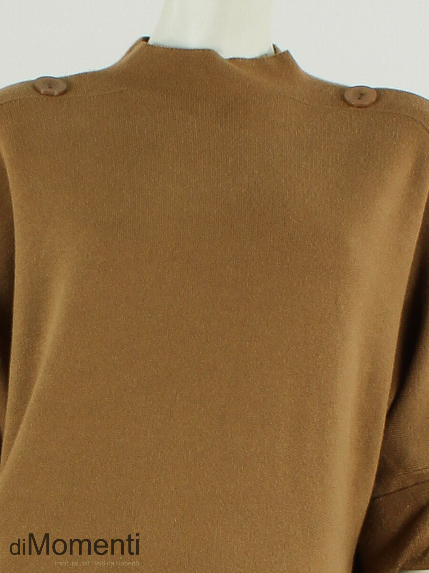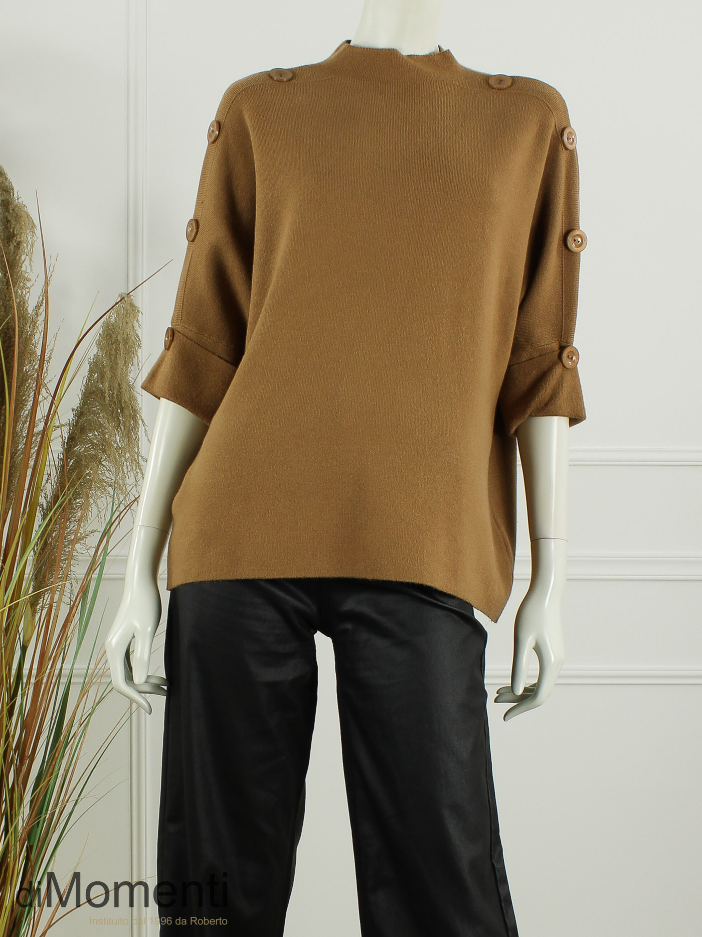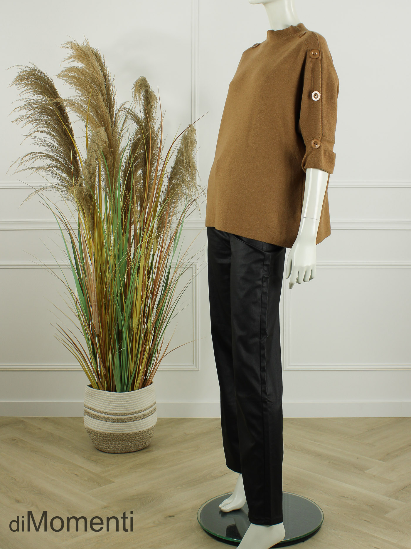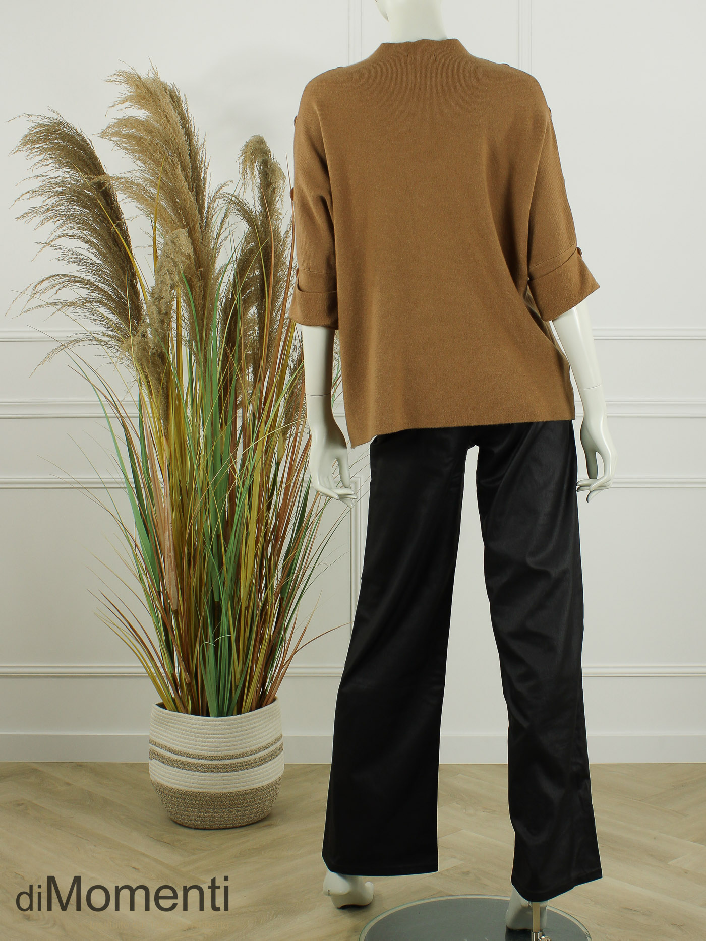 Deze tijdloze gebreide top/trui is een heerlijk item! Het losvallende, ruime model heeft een opstaande boord en 3/4 mouw met omslag. Decoratieve knopen op de schouder en arm geven een trendy accent. Gemaakt van een comfortabele viscose-mix. Een uni-must-have voor dit seizoen!