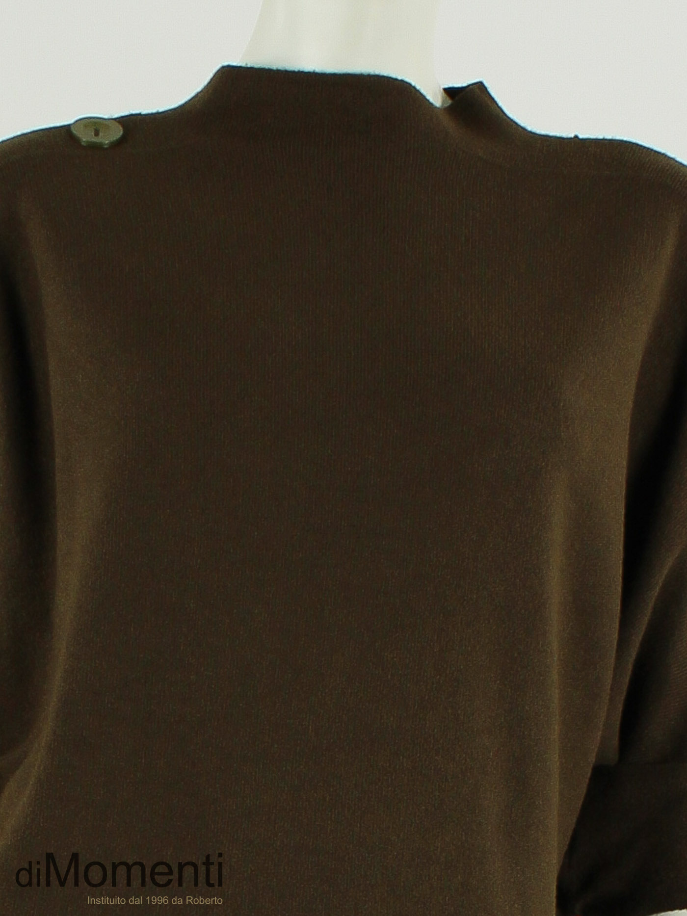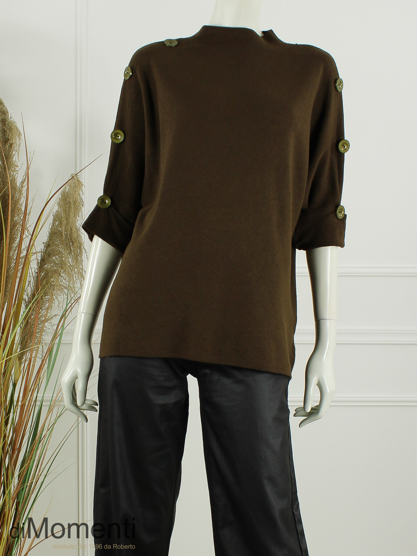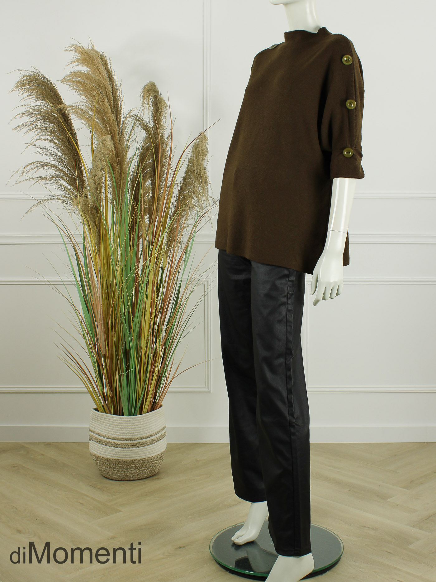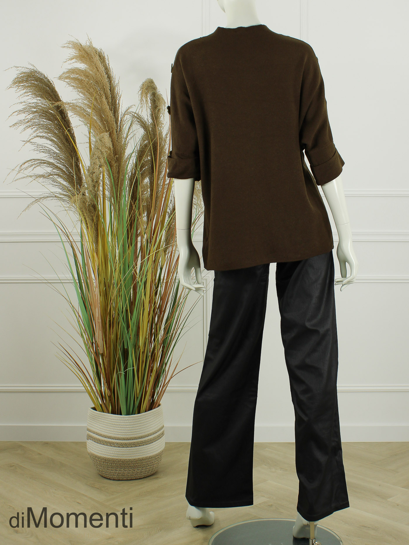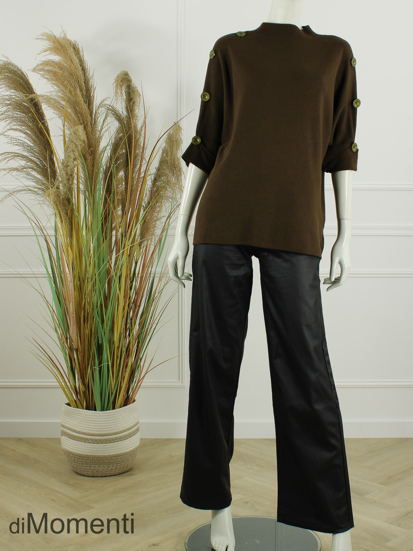 Deze tijdloze gebreide top/trui is een heerlijk item! Het losvallende, ruime model heeft een opstaande boord en 3/4 mouw met omslagDecoratieve knopen op de schouder en arm geven een trendy accent. Gemaakt van een comfortabele viscose-mix. Een uni-must-have voor dit seizoen!