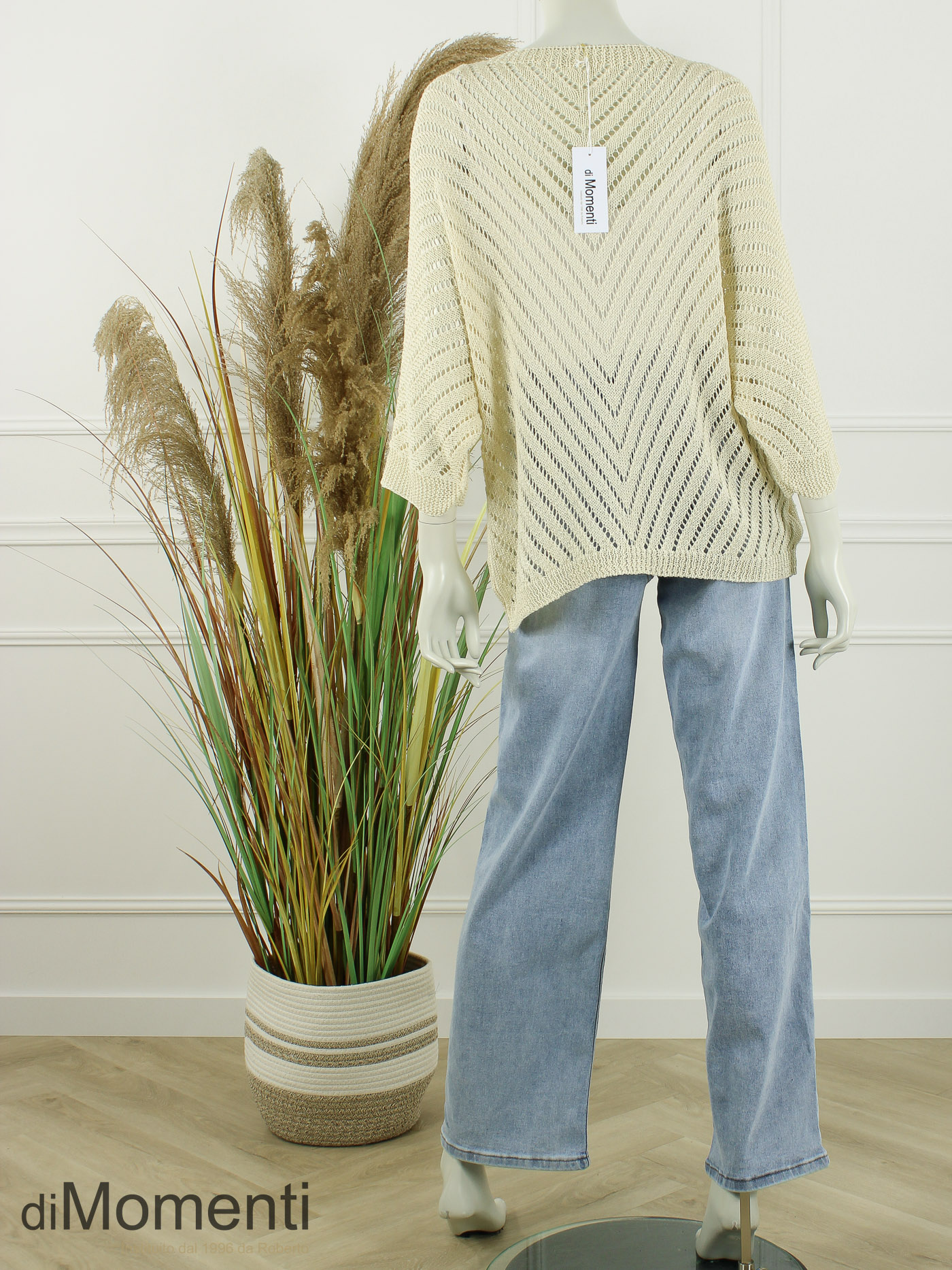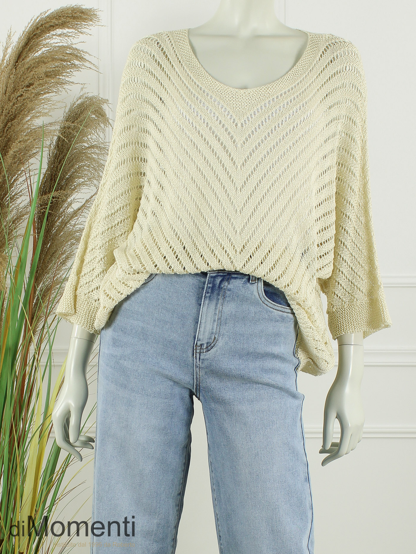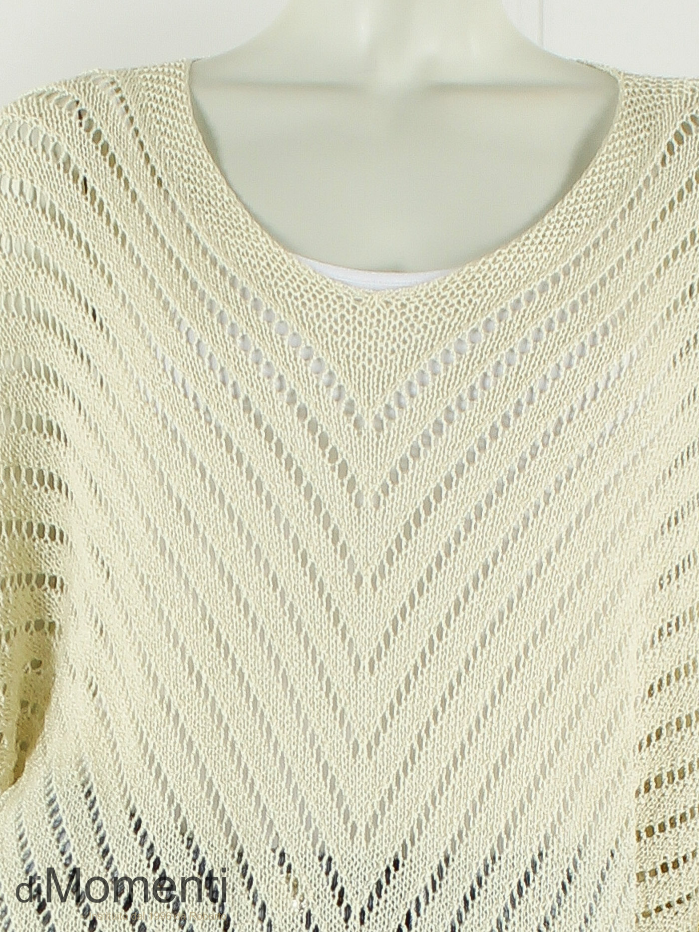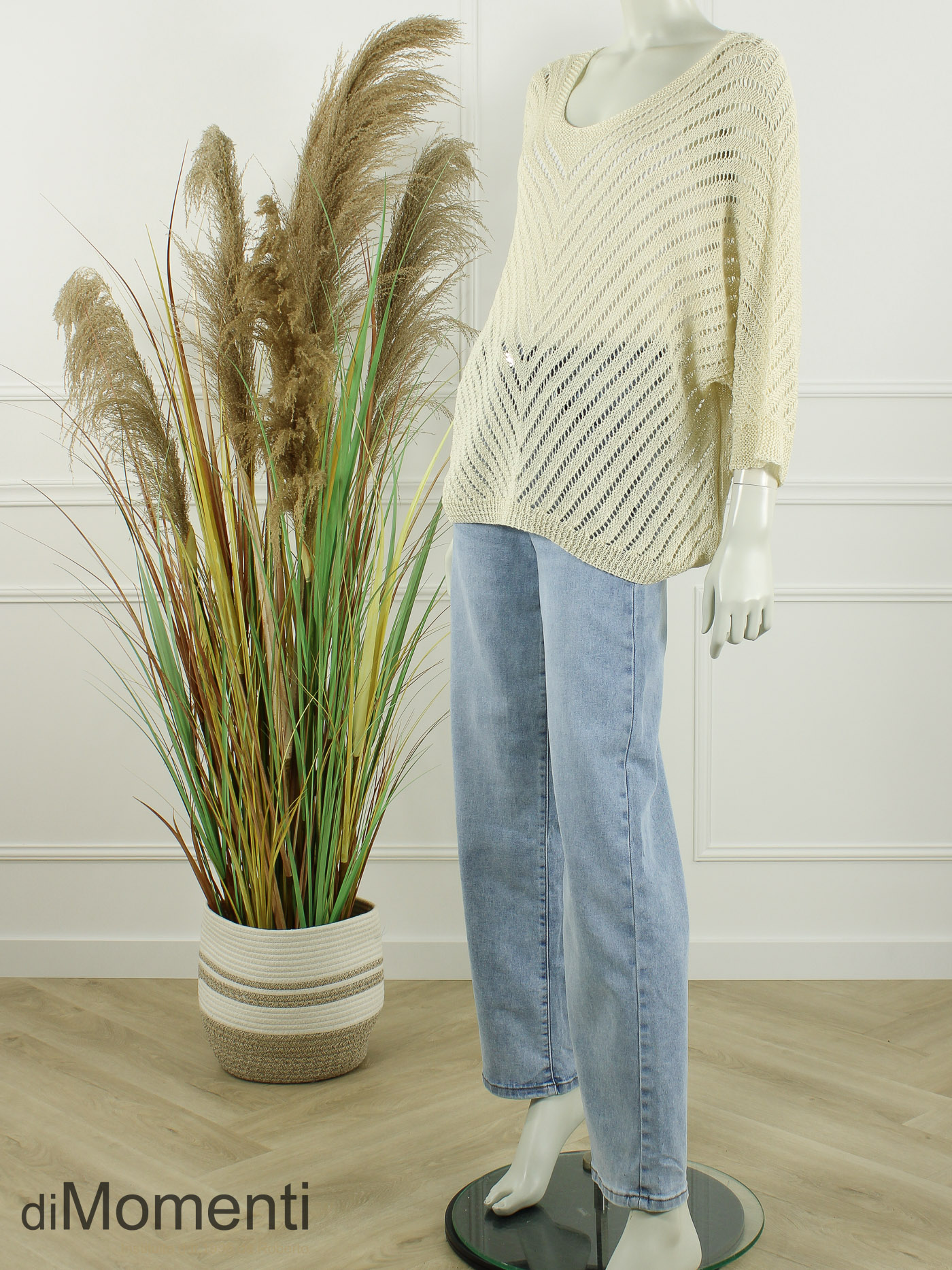 Nieuw is deze fijn gebreide top met een romantische touch. Uitgevoerd in een glansgaren met een verfijnd ajourpatroon. De vrouwelijke V-hals en driekwart mouw maken dit dé ideale top voor het nieuwe seizoen.