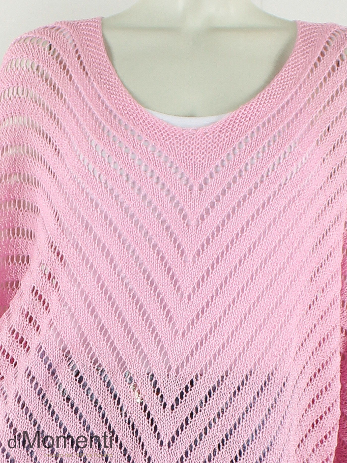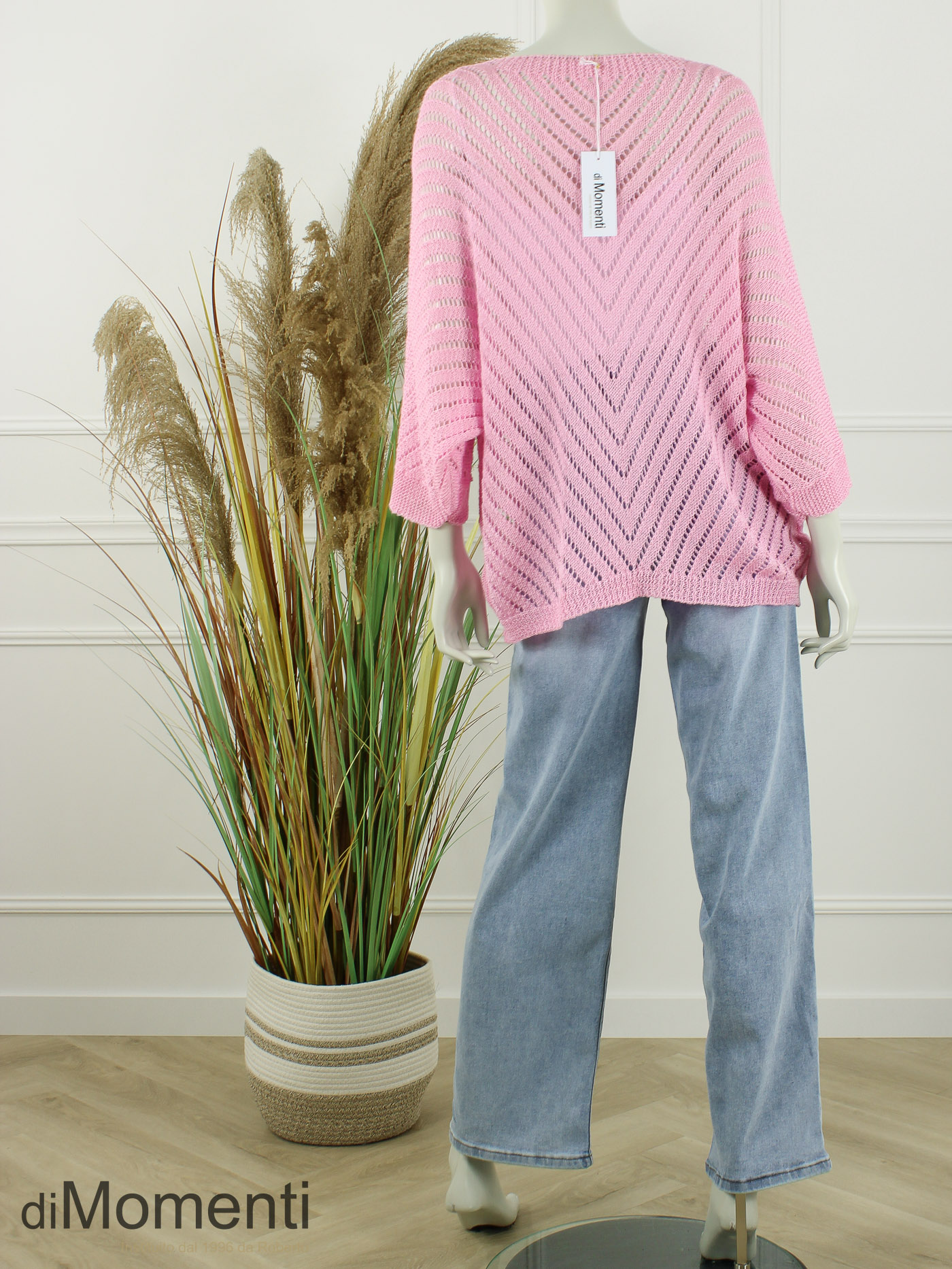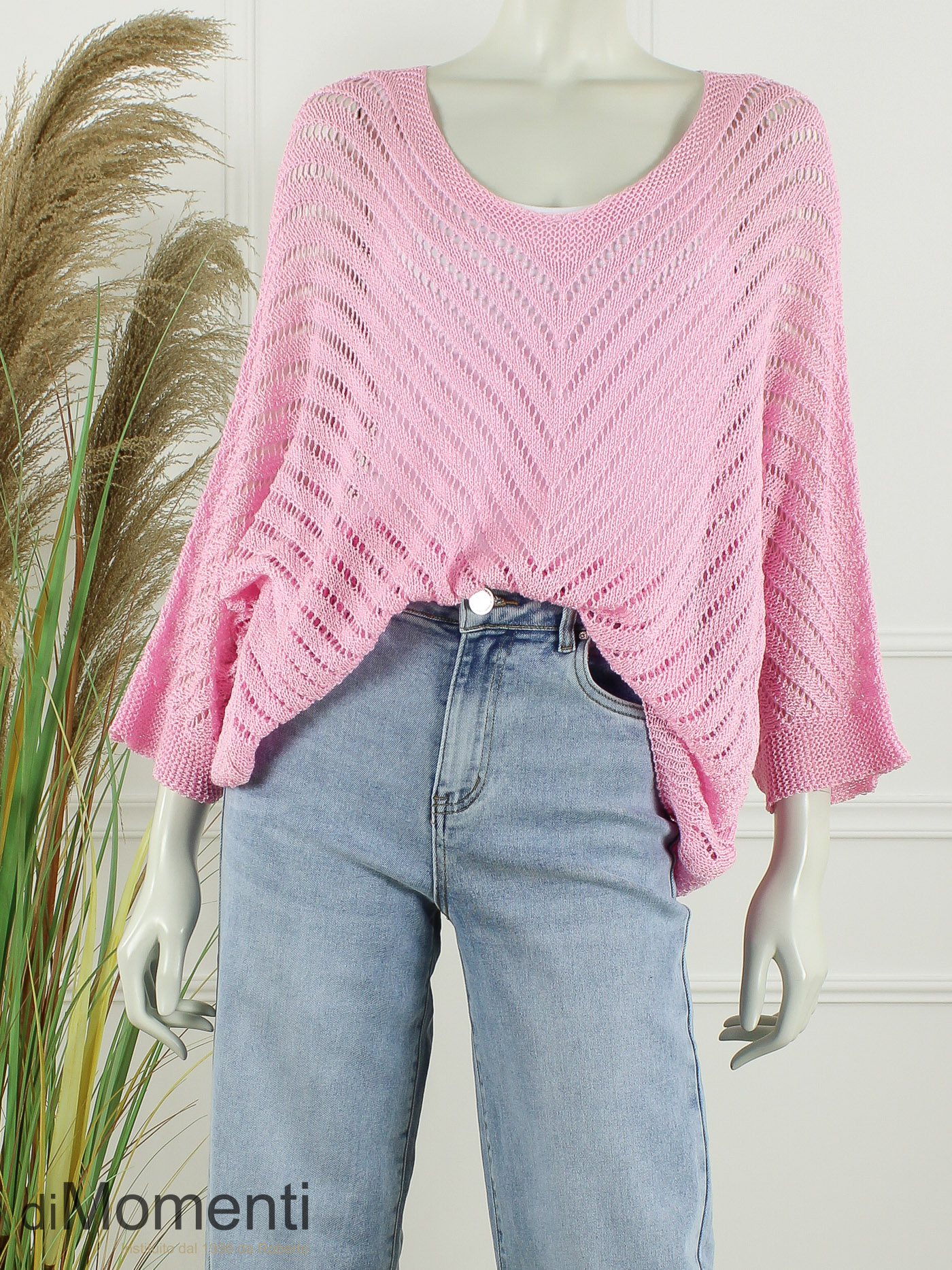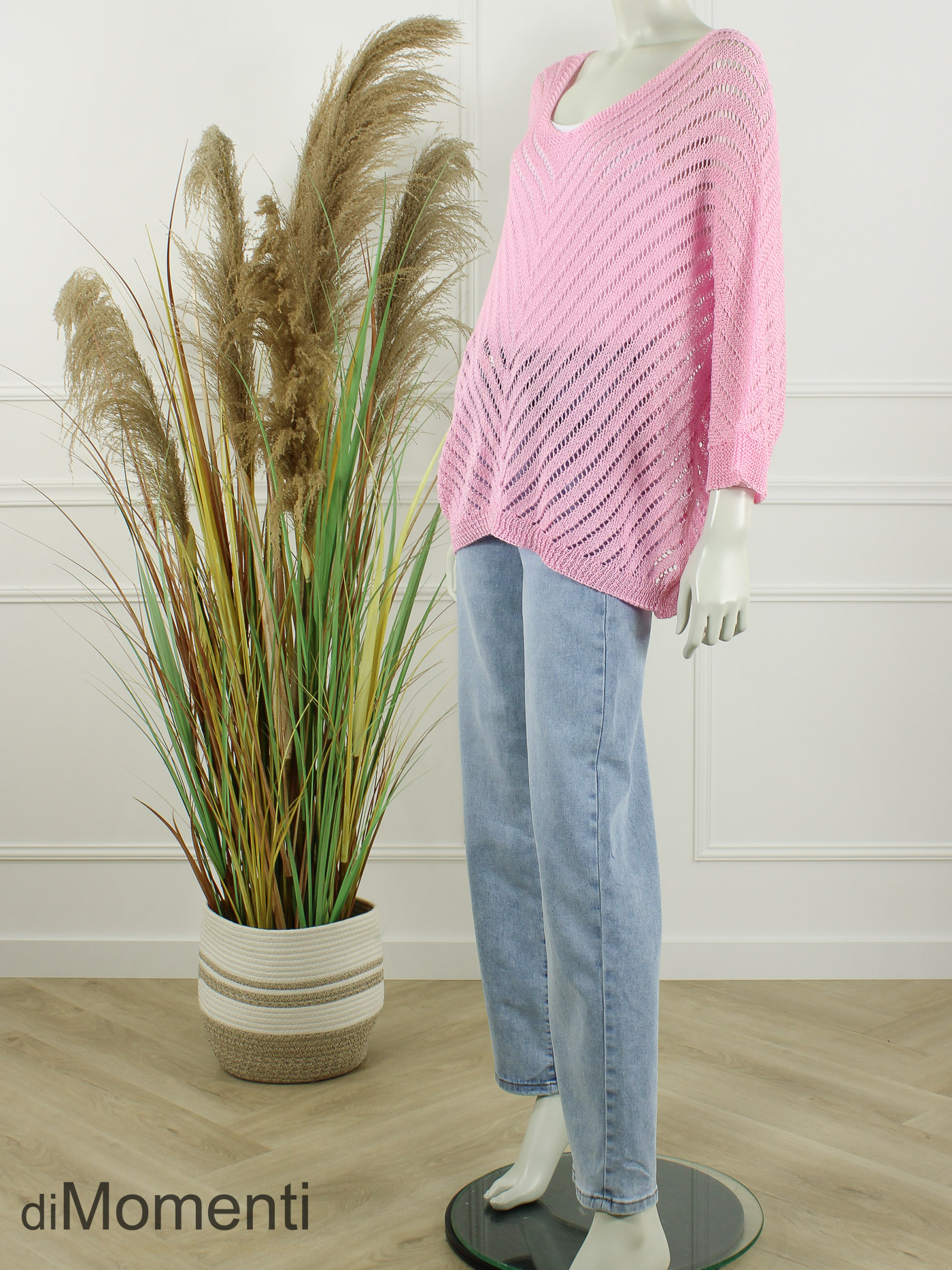 Nieuw is deze fijn gebreide top met een romantische touch. Uitgevoerd in een glansgaren met een verfijnd ajourpatroon. De vrouwelijke V-hals en driekwart mouw maken dit dé ideale top voor het nieuwe seizoen.
