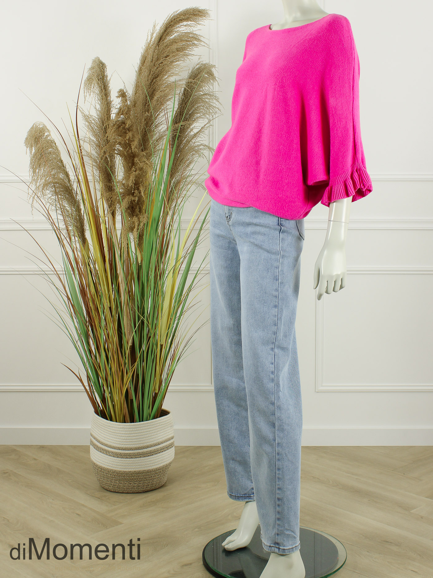 Nieuw is deze nieuwe favoriet: een stijlvolle gebreide trui met een elegante boothals en ¾ de vleermuismouwen. De mouwen zijn afgewerkt met een speelse ruche voor een vrouwelijke, modieuze twist. Dankzij het royale model tekent deze trui niet rond de taille, waardoor hij flatteus valt.