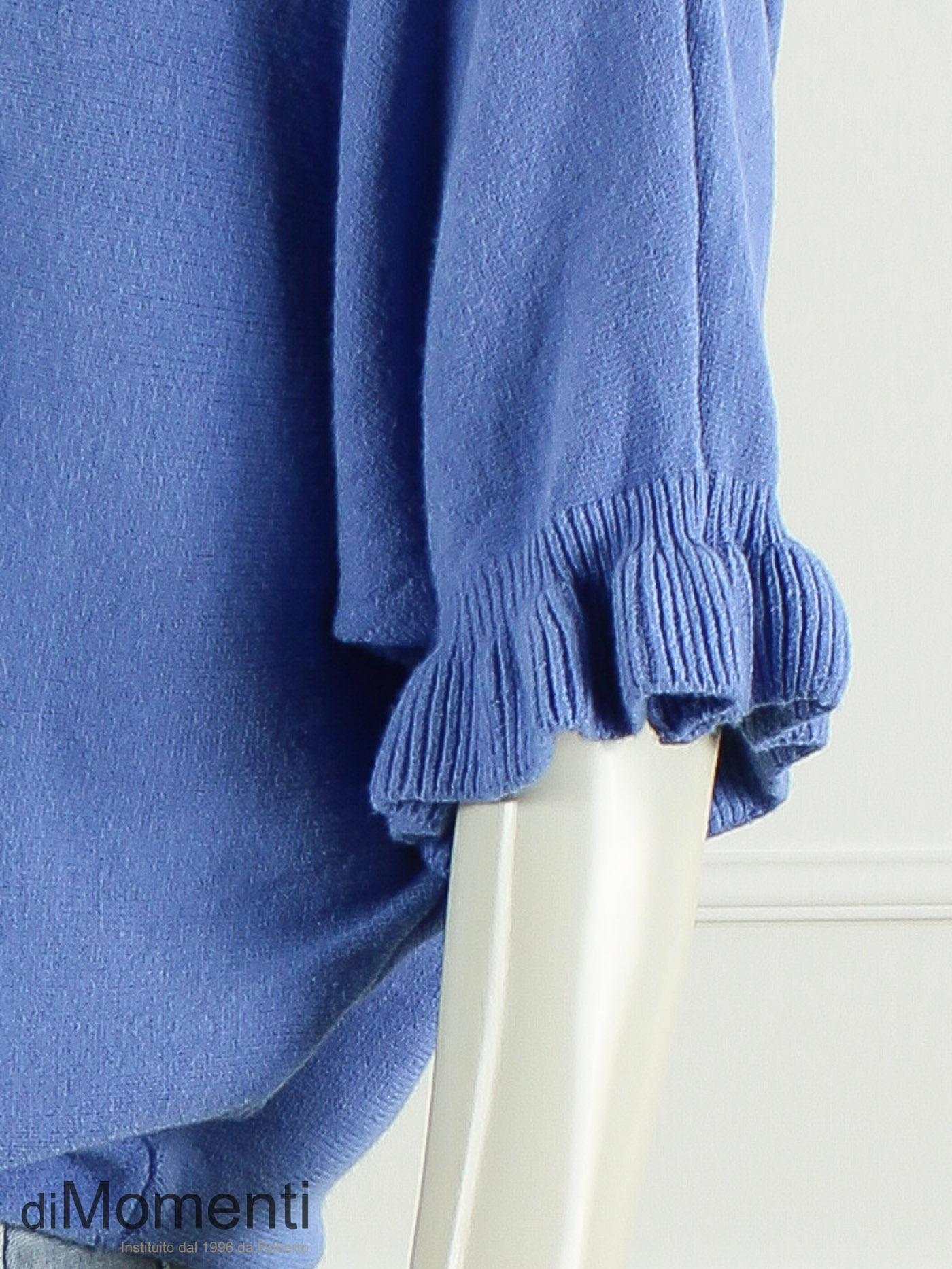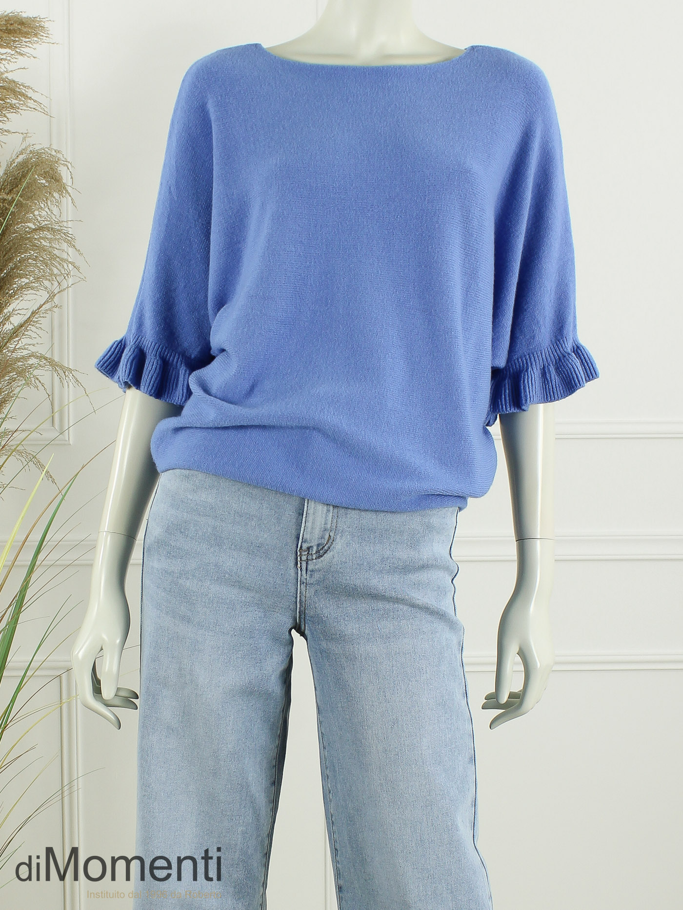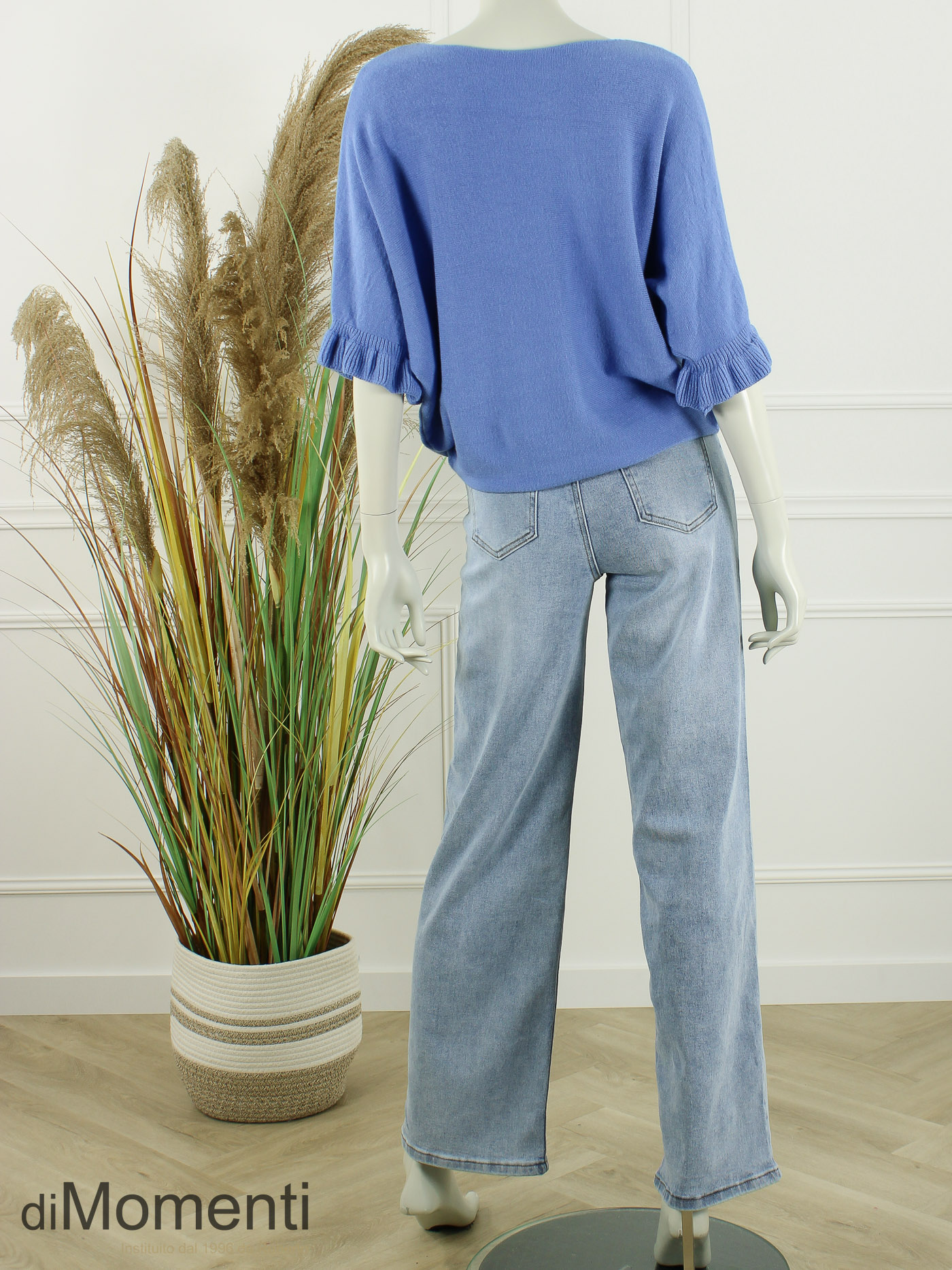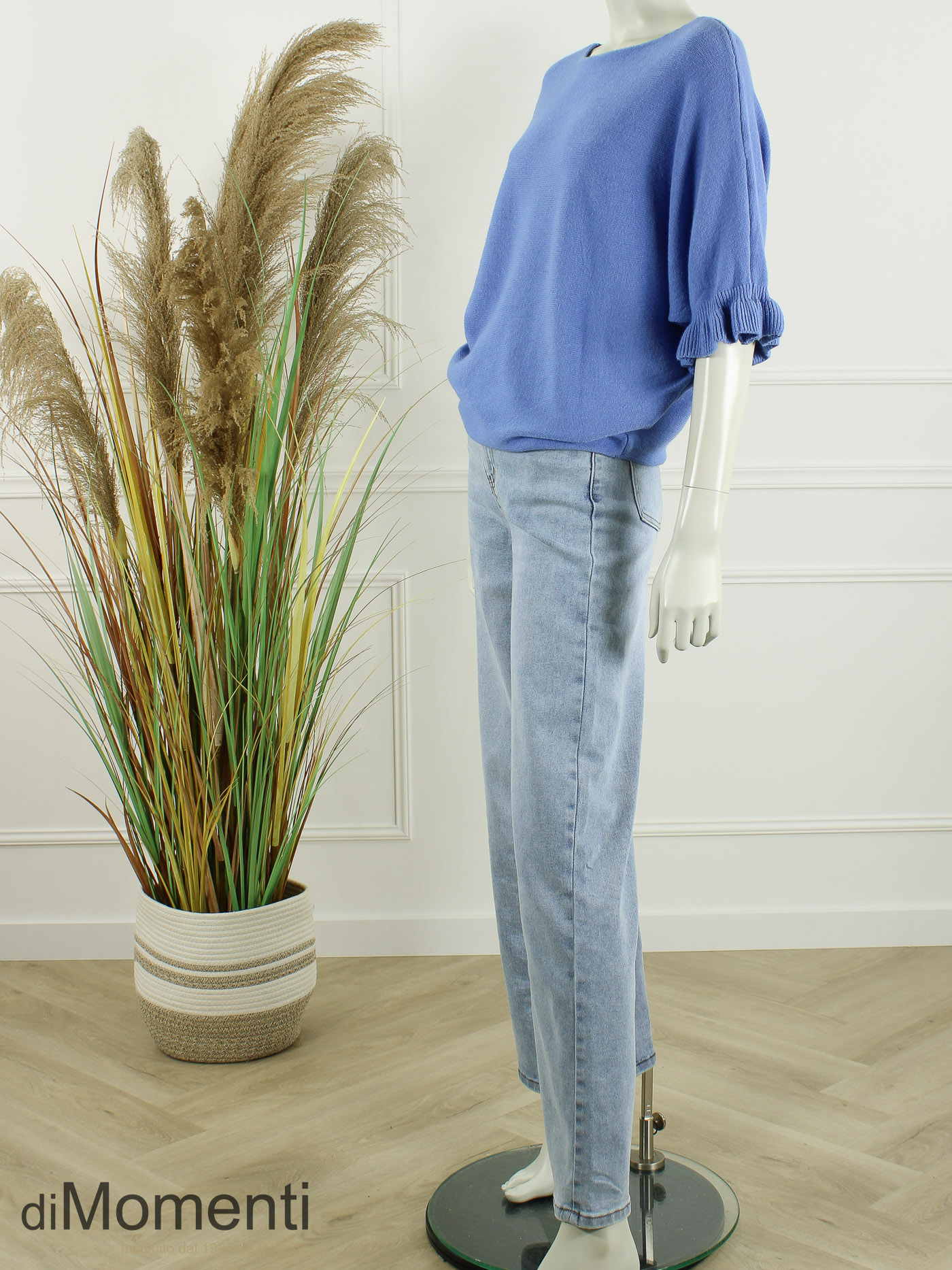 Nieuw is deze nieuwe favoriet: een stijlvolle gebreide trui met een elegante boothals en ¾ de vleermuismouwen. De mouwen zijn afgewerkt met een speelse ruche voor een vrouwelijke, modieuze twist. Dankzij het royale model tekent deze trui niet rond de taille, waardoor hij flatteus valt.