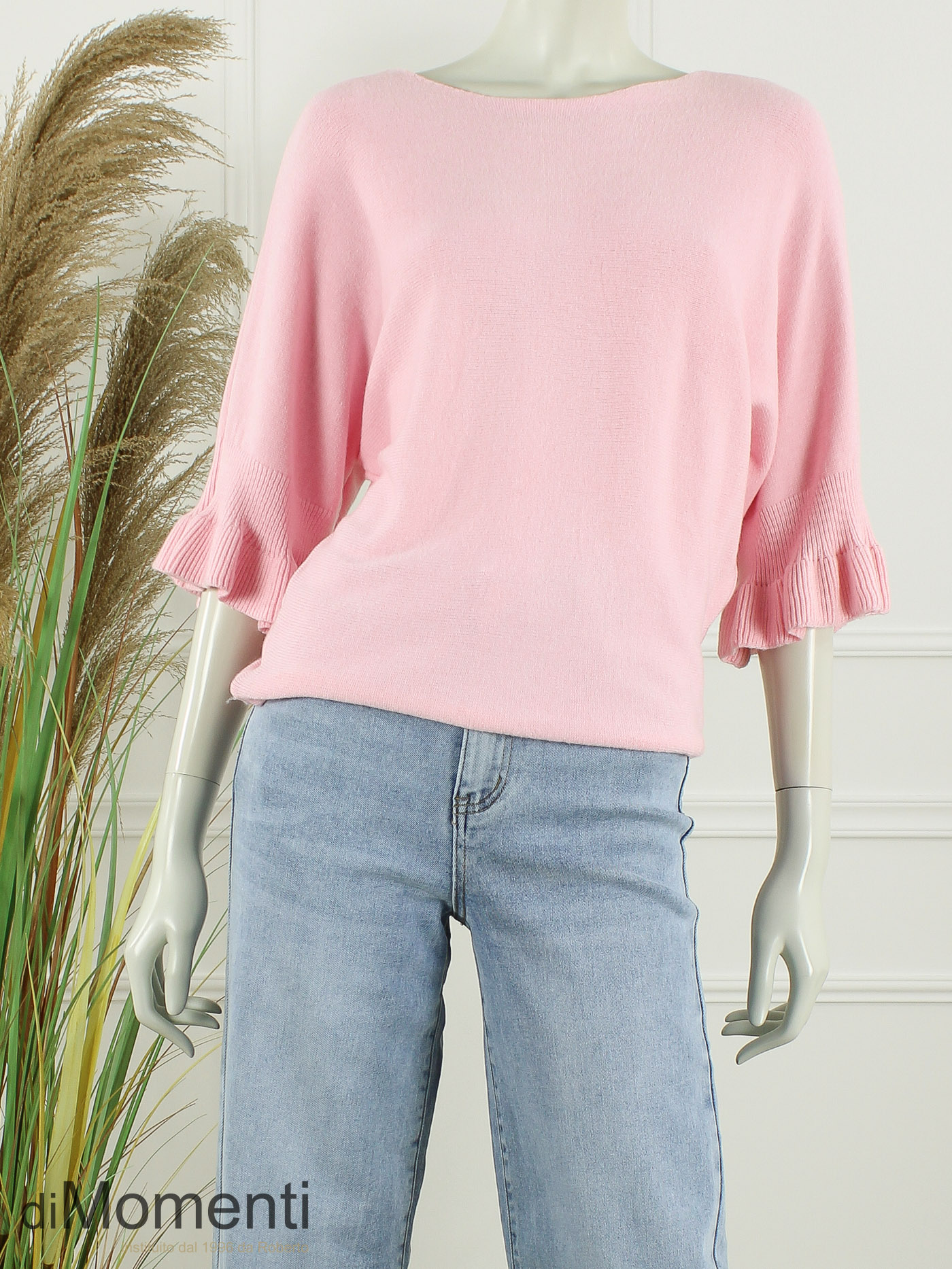 Nieuw is deze nieuwe favoriet: een stijlvolle gebreide trui met een elegante boothals en ¾ de vleermuismouwen. De mouwen zijn afgewerkt met een speelse ruche voor een rouwelijke, modieuze twist. Dankzij het royale model tekent deze trui niet rond de taille, waardoor hij flatteus valt.