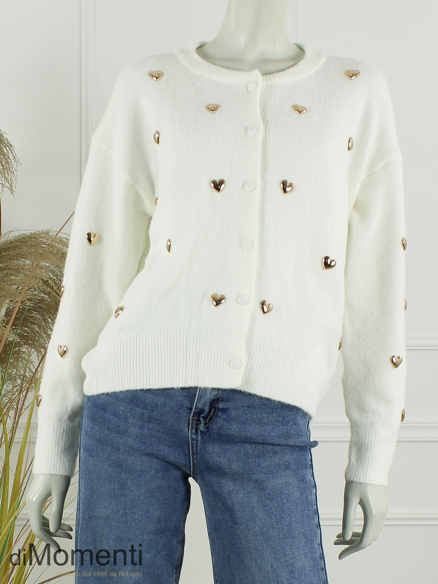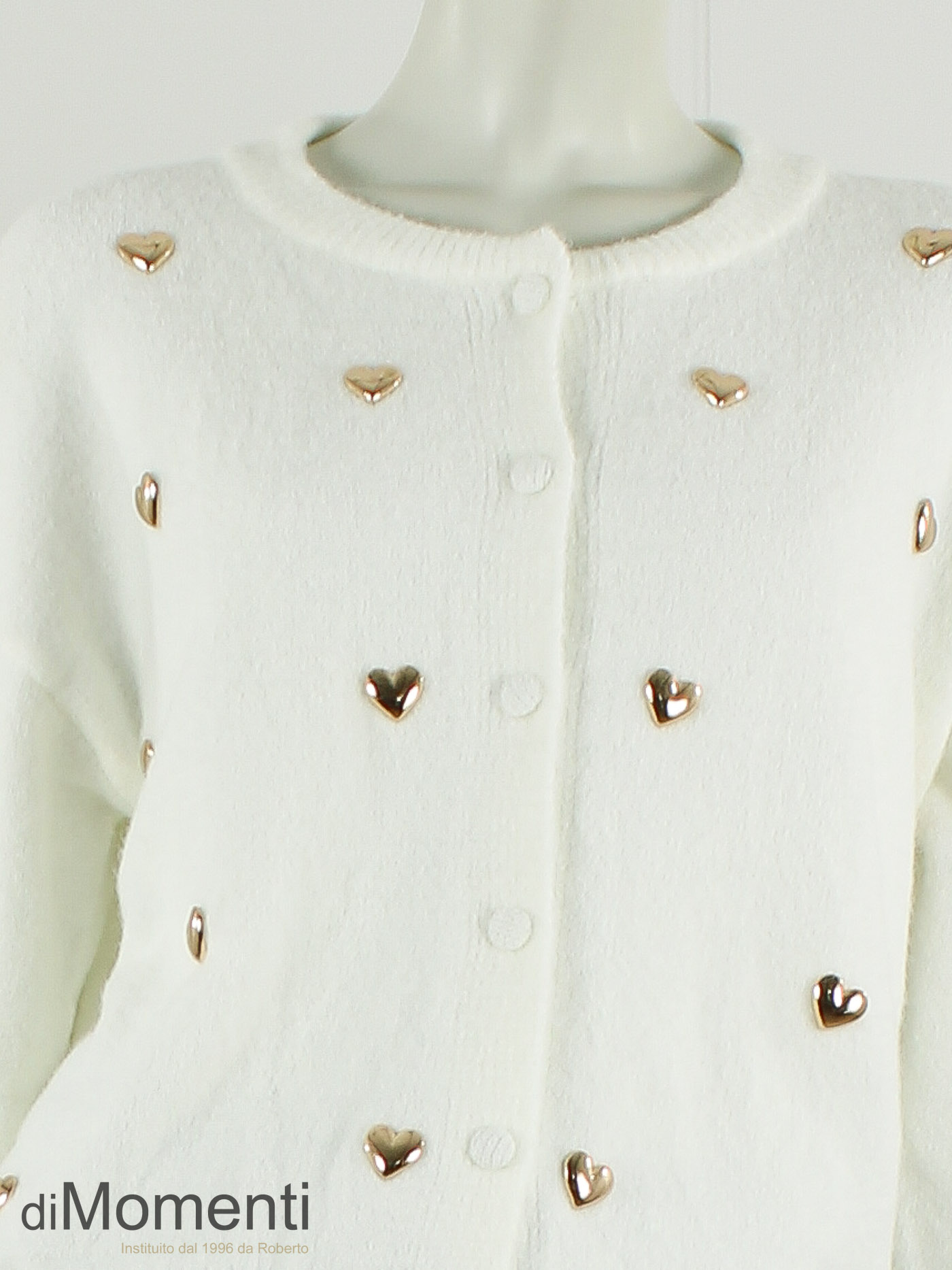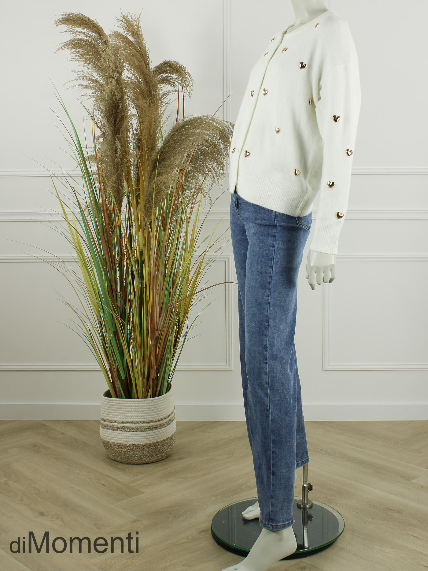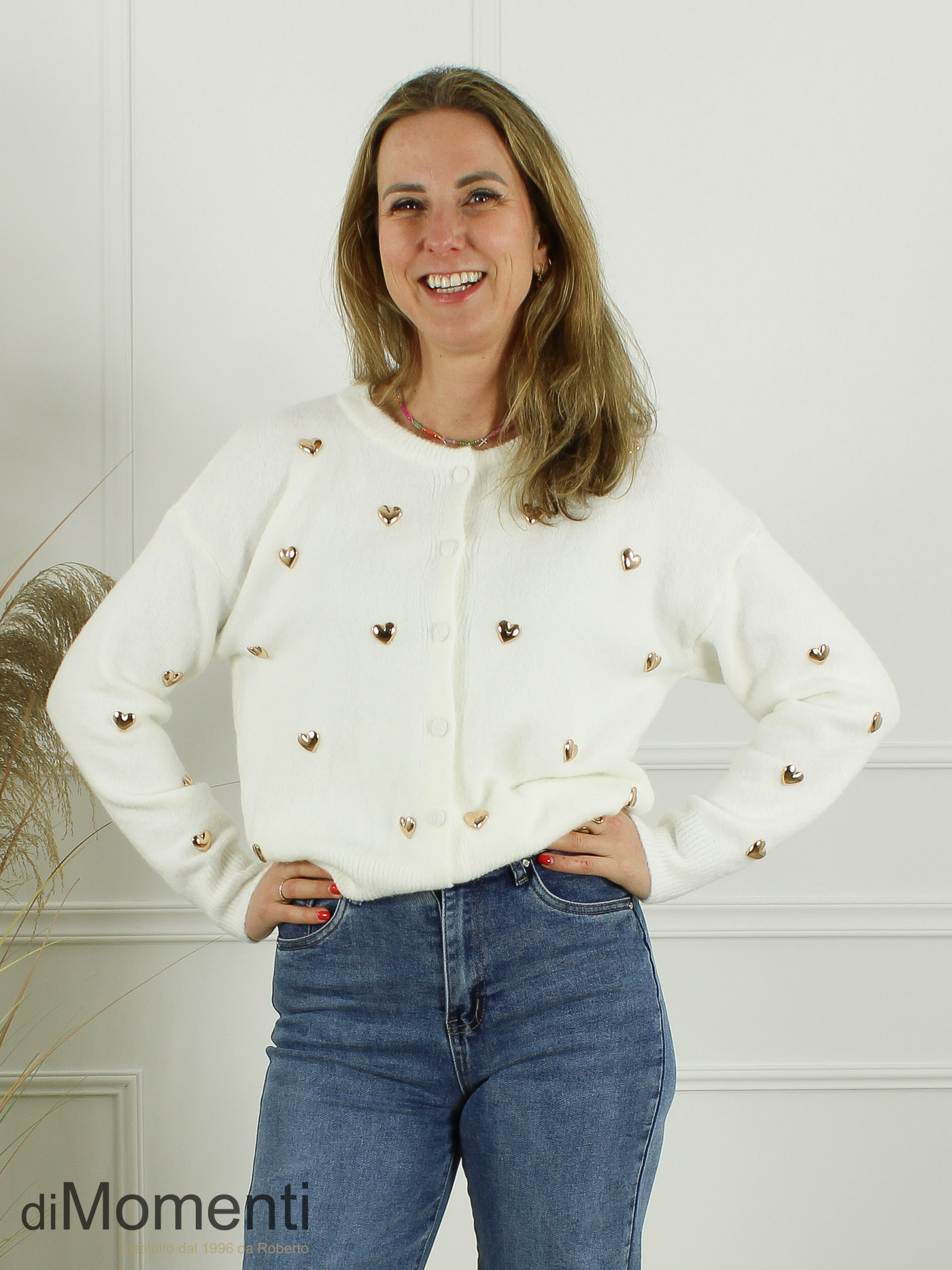 Dit super zachte, trendy vestje van Flamant is onweerstaanbaar! De goudkleurige hartjes geven een glamoureuze look. Dit vestje is gemaakt in een mooie, fijne kwaliteit en zeer netjes afgewerkt. De mooie knoopjes geven een chique uitstraling.